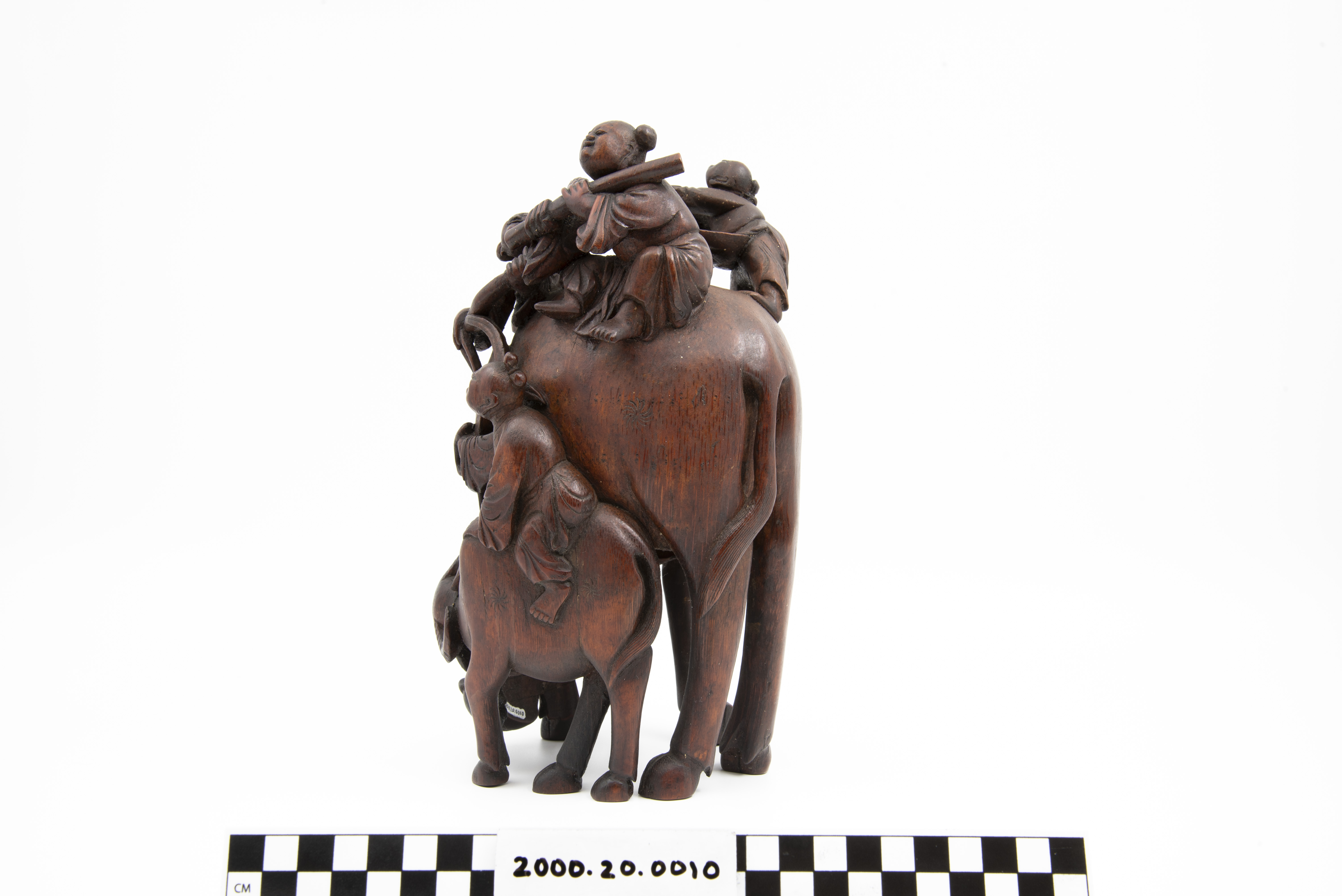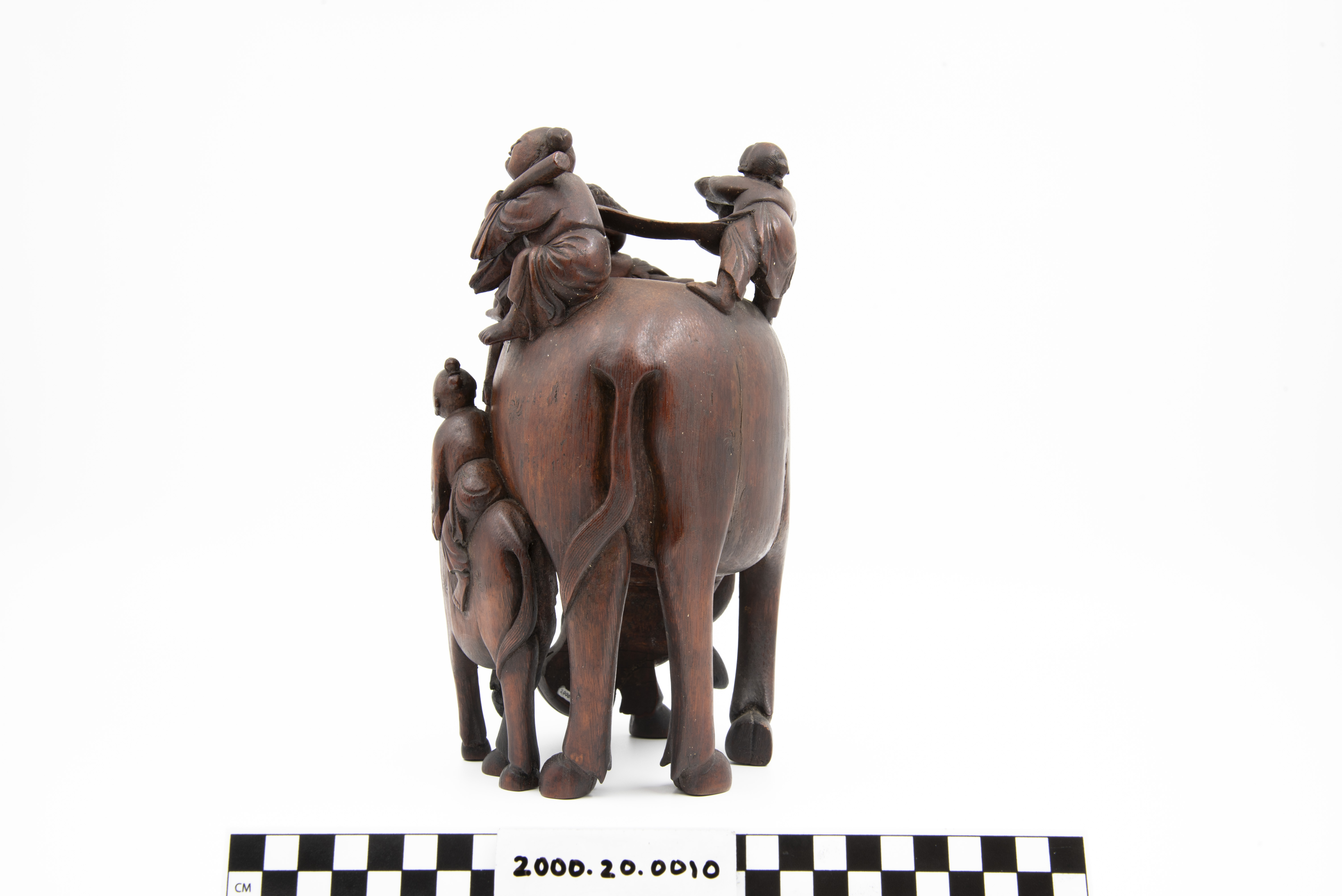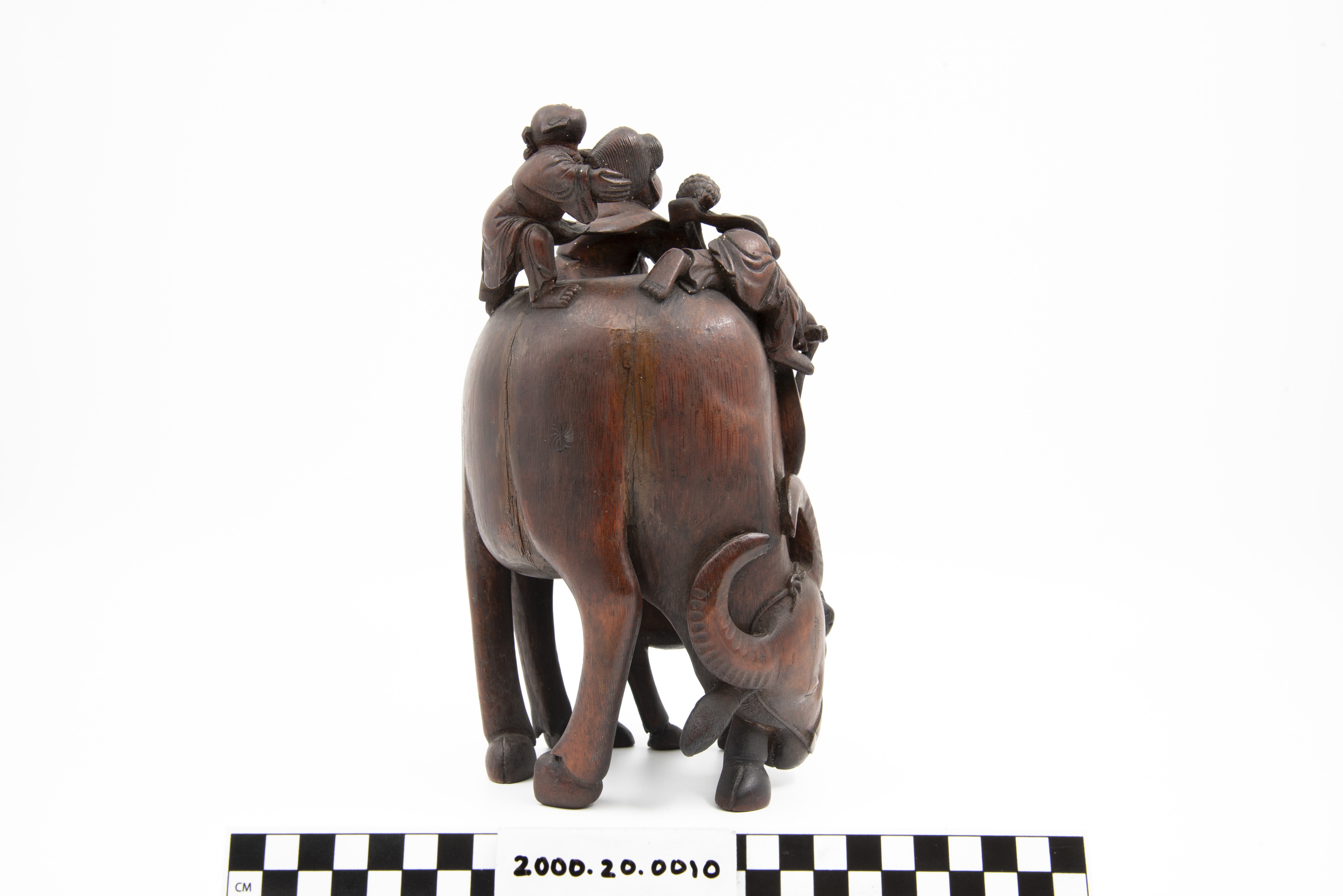 This is a bamboo carving of two water buffalos with riders. Three of the shown figures are Daoist immortals who are riding the larger water buffalo. The fourth figure is astride the second water buffalo. The "Eight Immortals" are legendary beings said to have obtained immortality through their study of the natural world. They can be found in a variety of Chinese art and represent different life conditions (age, aristocracy, masculinity, etc.). Bamboo is a difficult wood to carve and represents longevity given that it flourishes throughout winter.