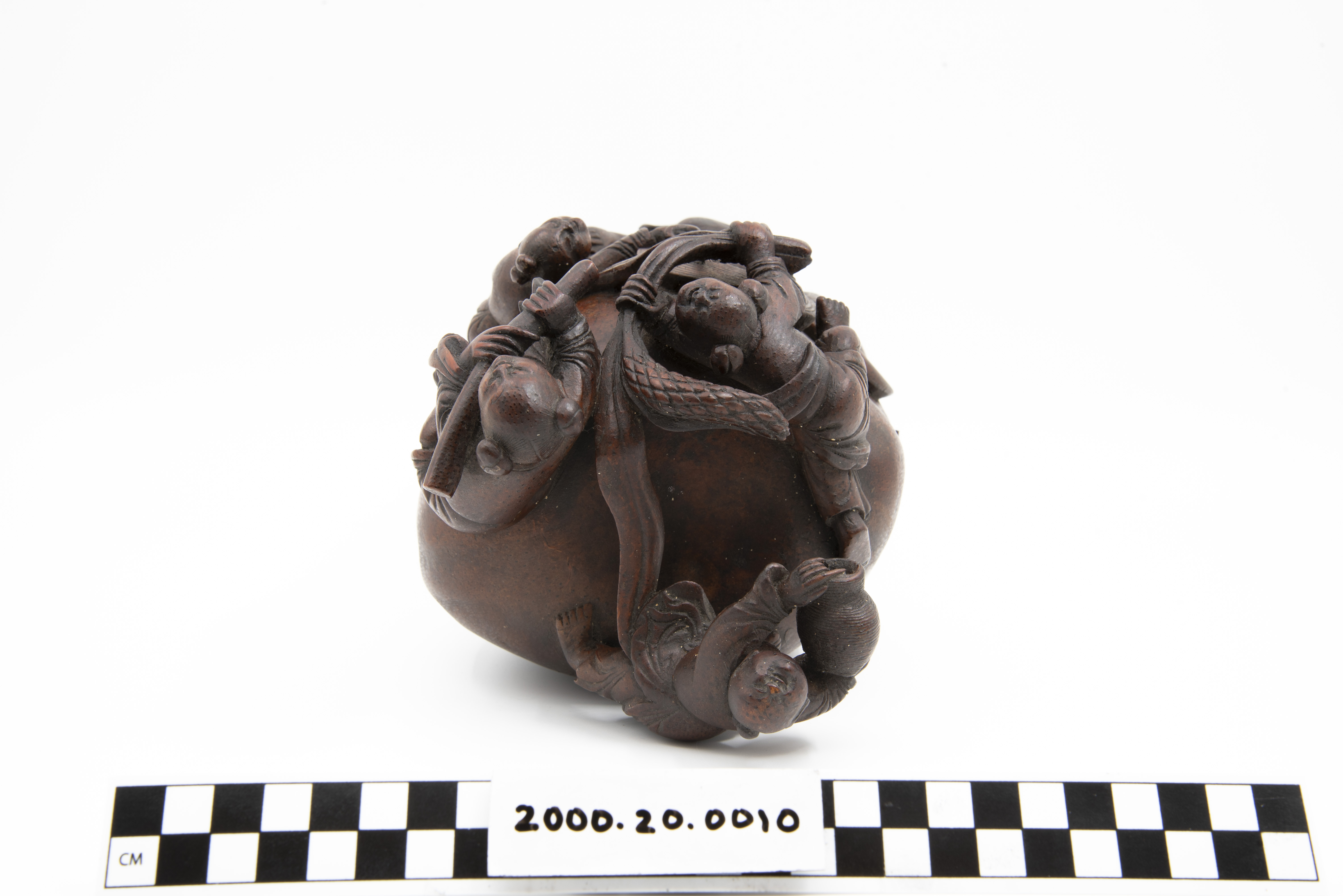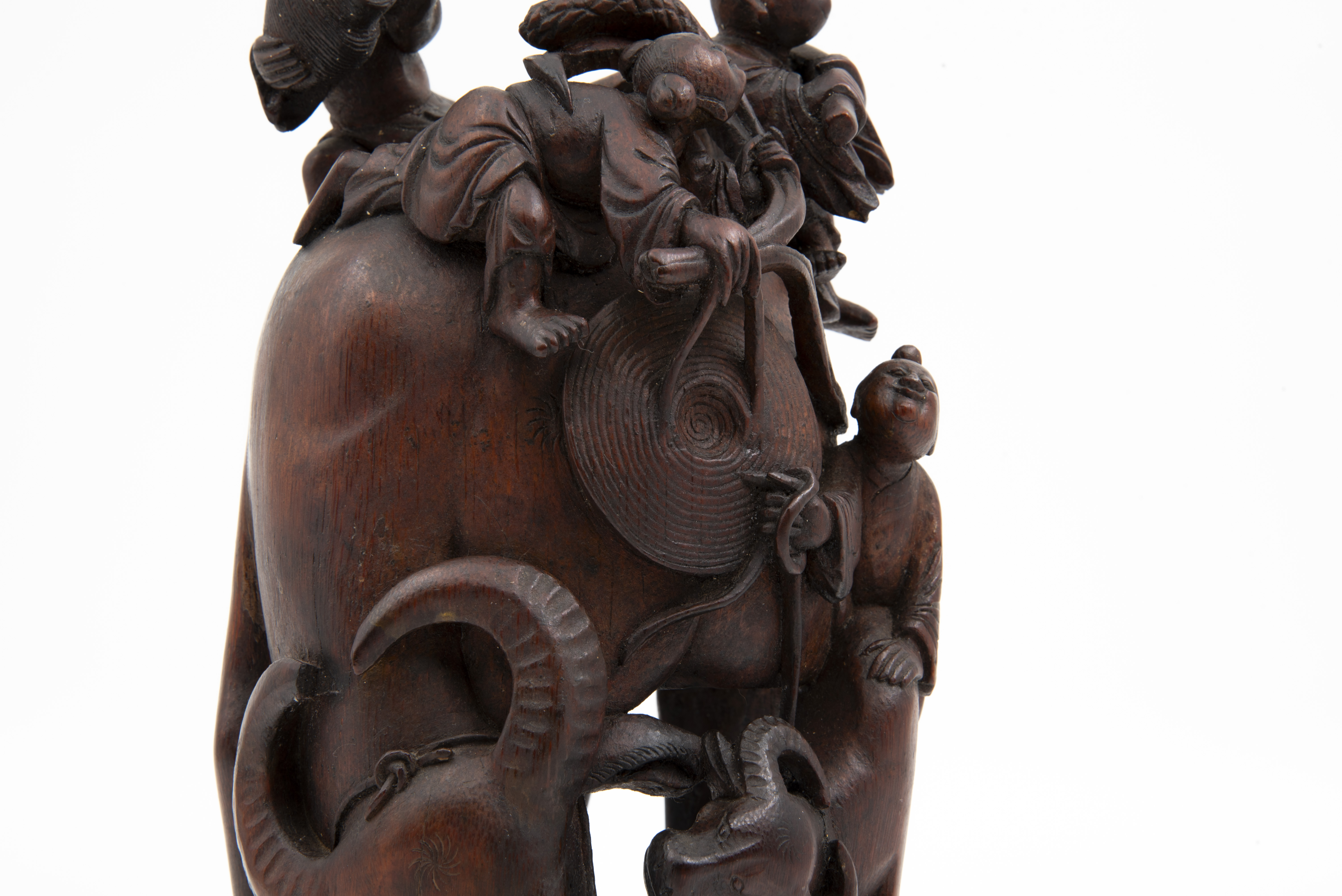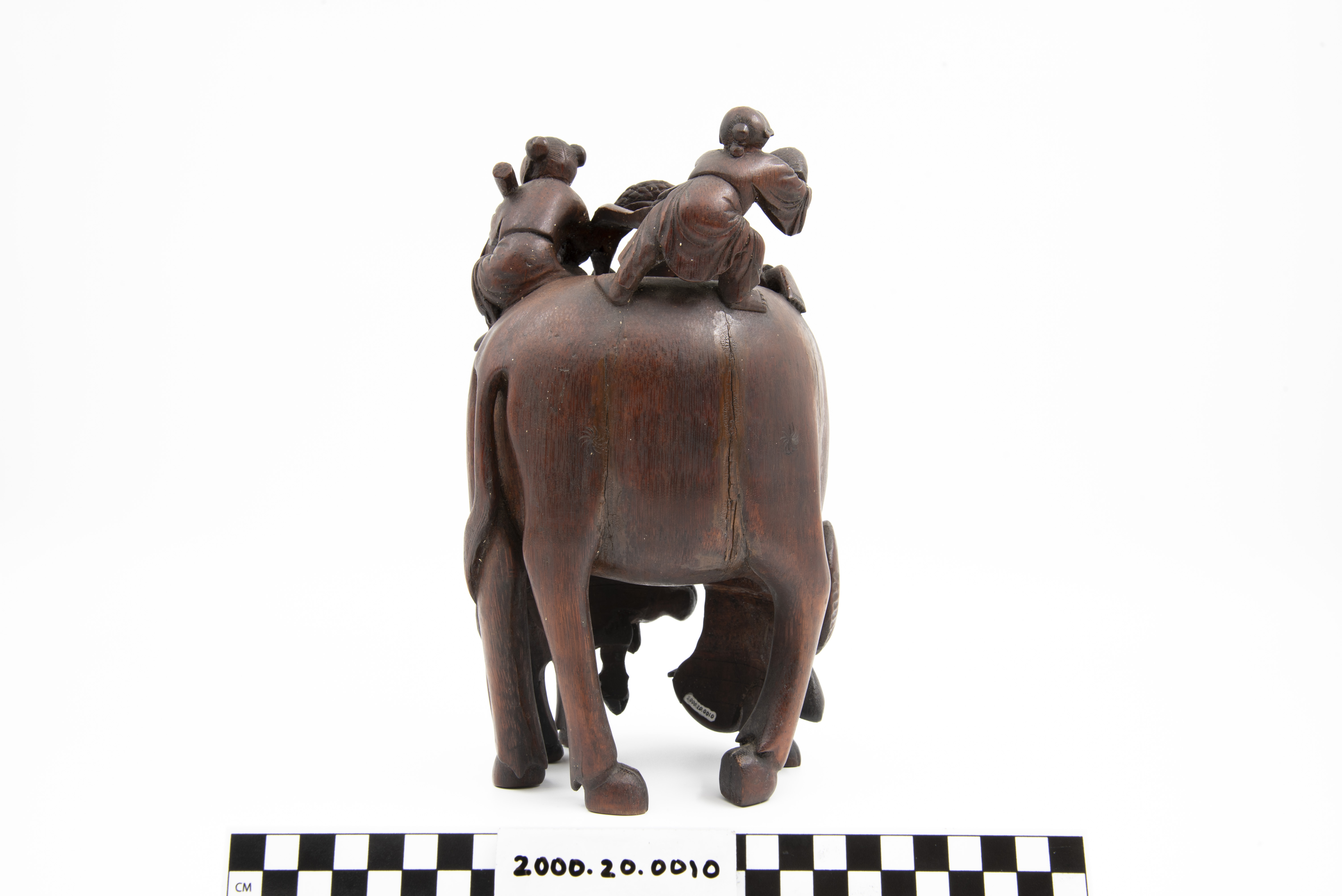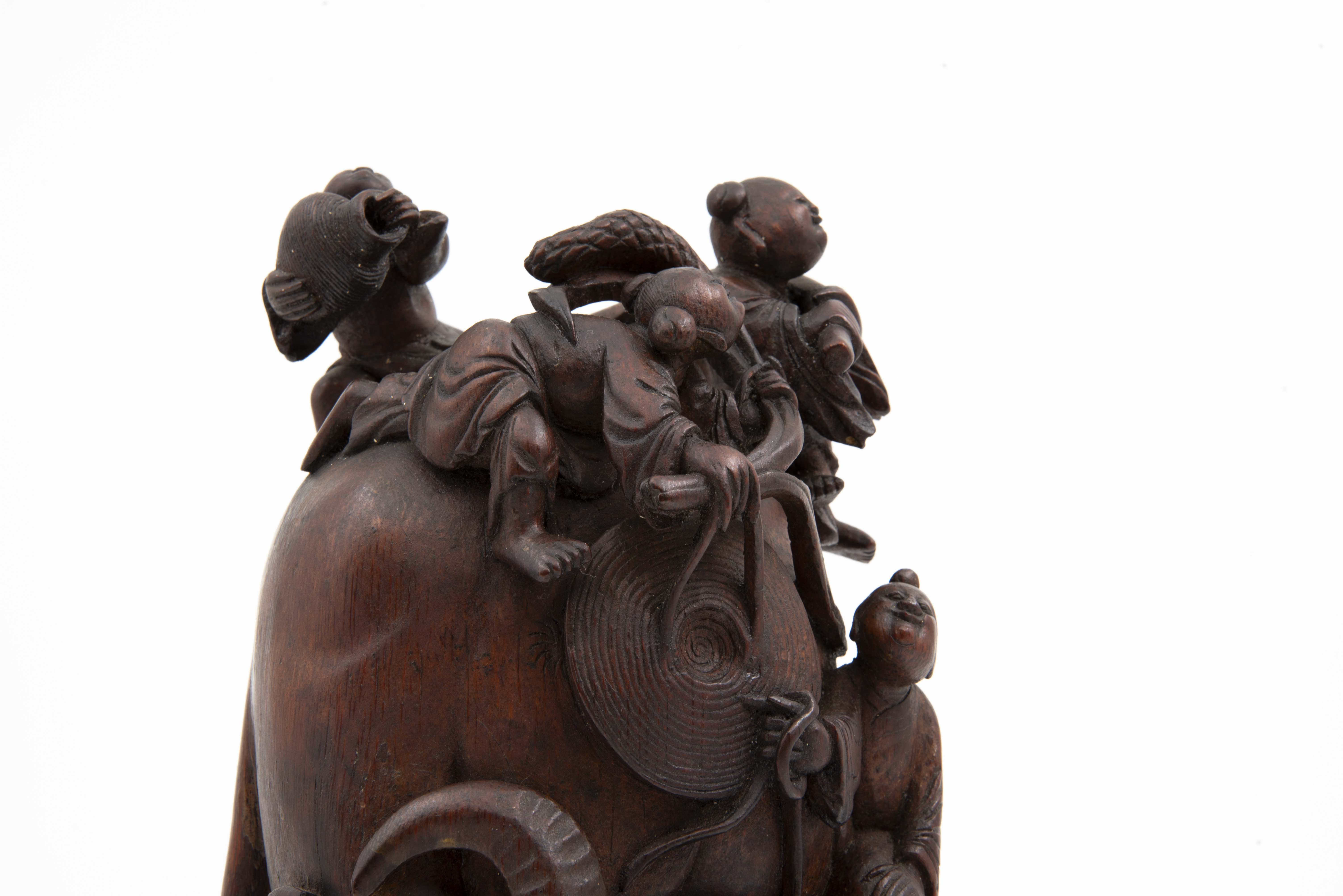 This is a bamboo carving of two water buffalos with riders. Three of the shown figures are Daoist immortals who are riding the larger water buffalo. The fourth figure is astride the second water buffalo. The "Eight Immortals" are legendary beings said to have obtained immortality through their study of the natural world. They can be found in a variety of Chinese art and represent different life conditions (age, aristocracy, masculinity, etc.). Bamboo is a difficult wood to carve and represents longevity given that it flourishes throughout winter.