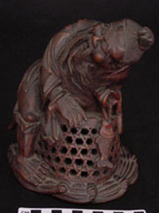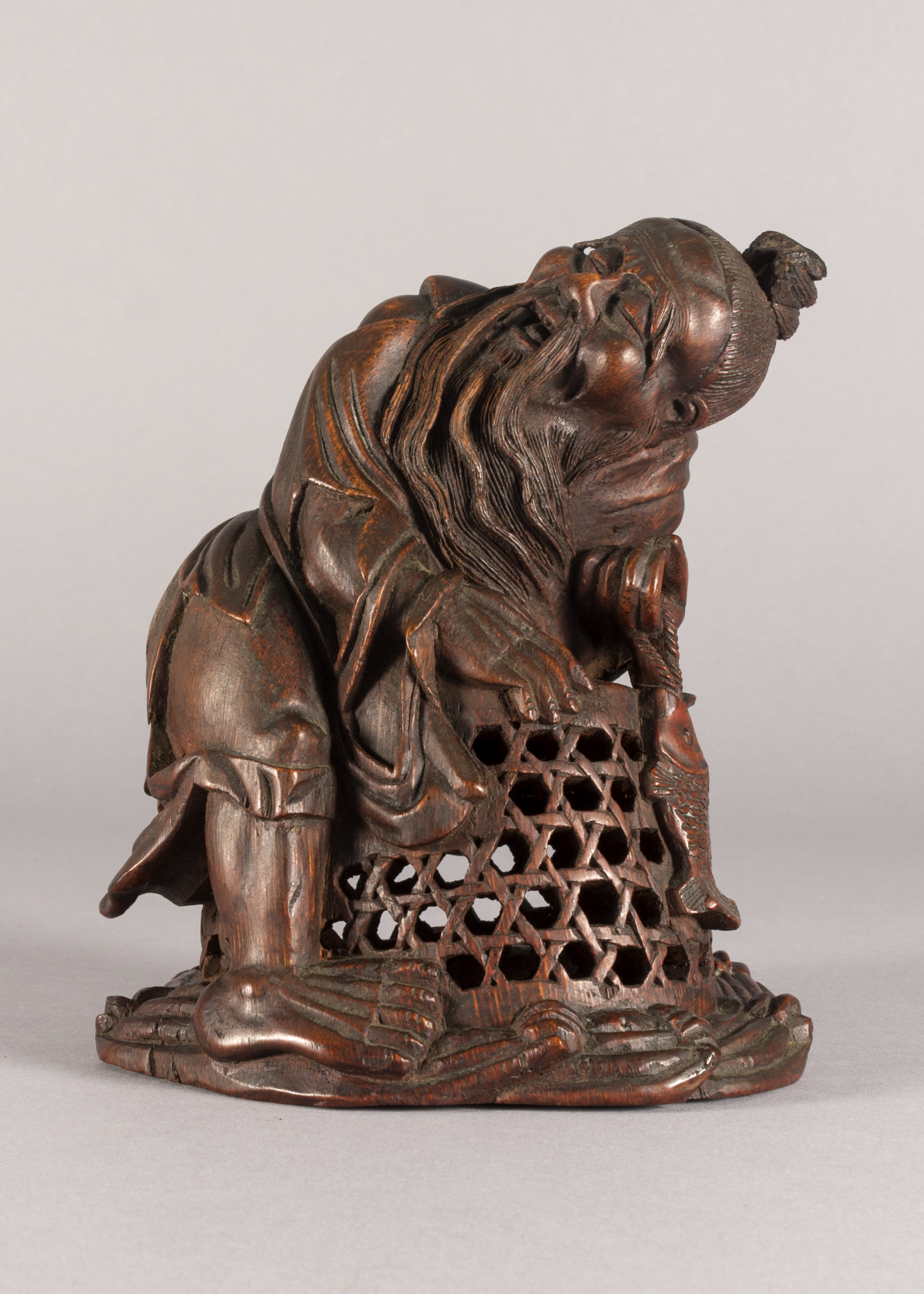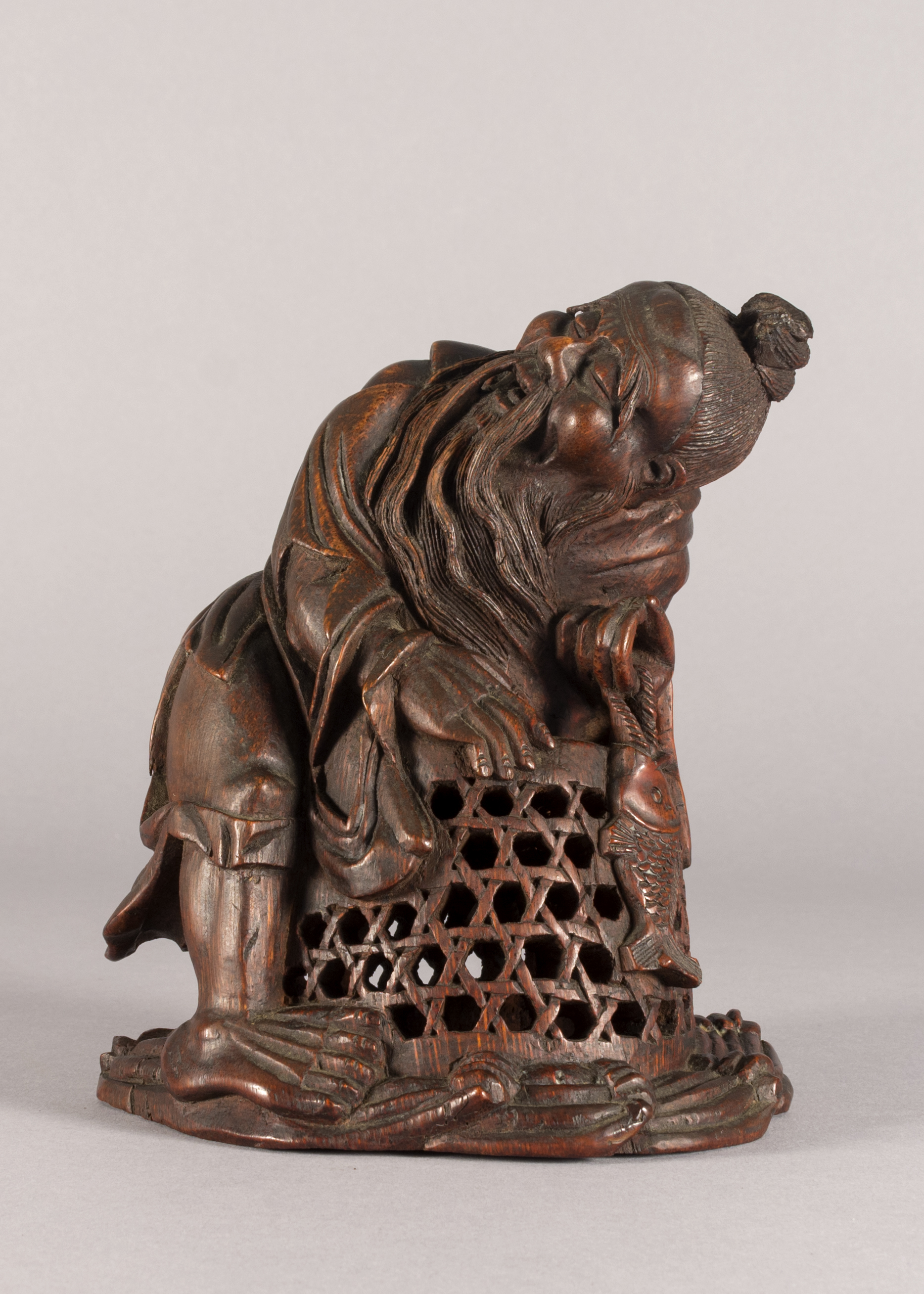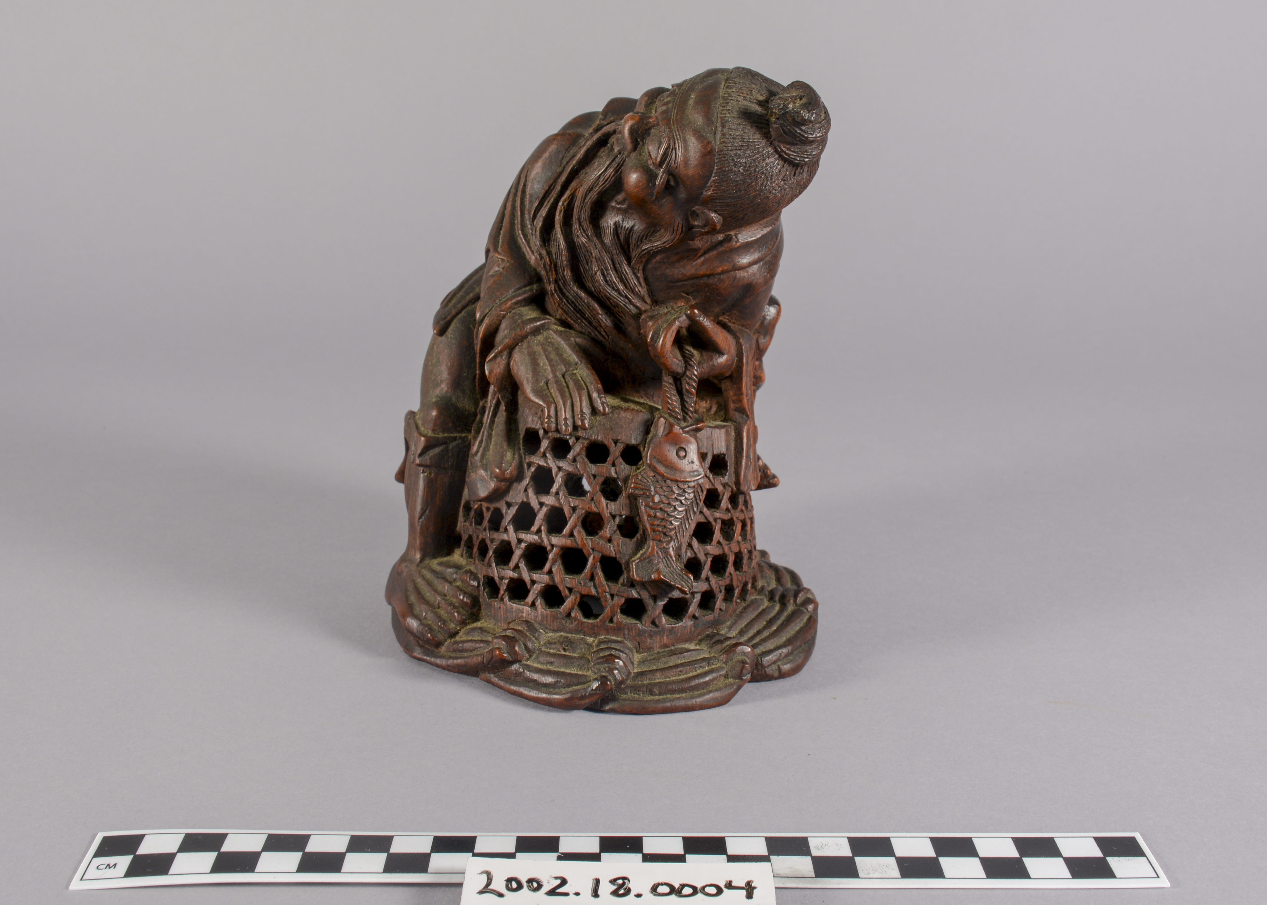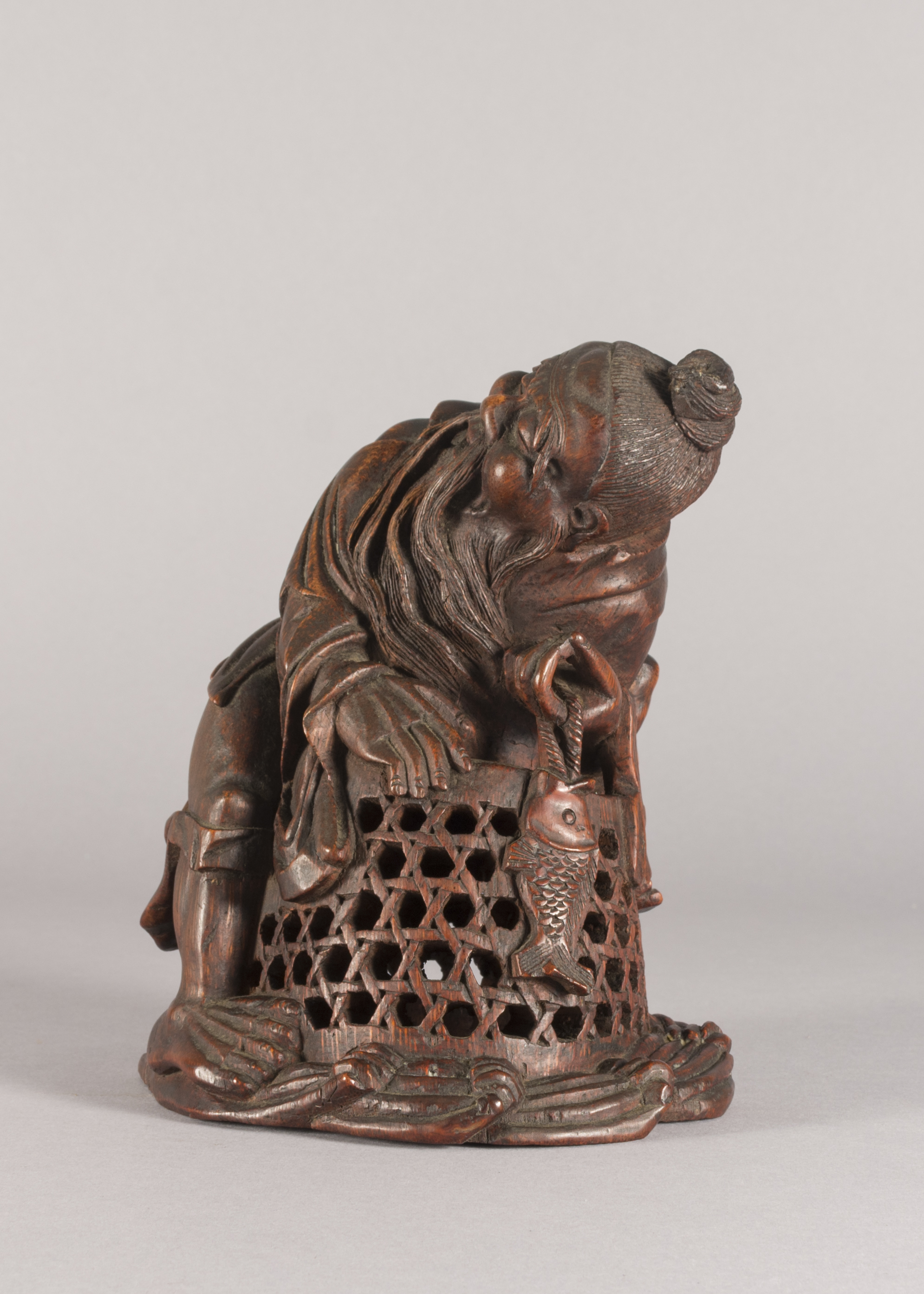 This is a Chinese bamboo carving of a fishermen. The natural world has been a consistent theme of Chinese artwork and can be seen in this artifact with the image of waves on the underside of the boat. This item is also constructed from bamboo which, while a difficult wood to carve, represents longevity given that it flourishes throughout winter.