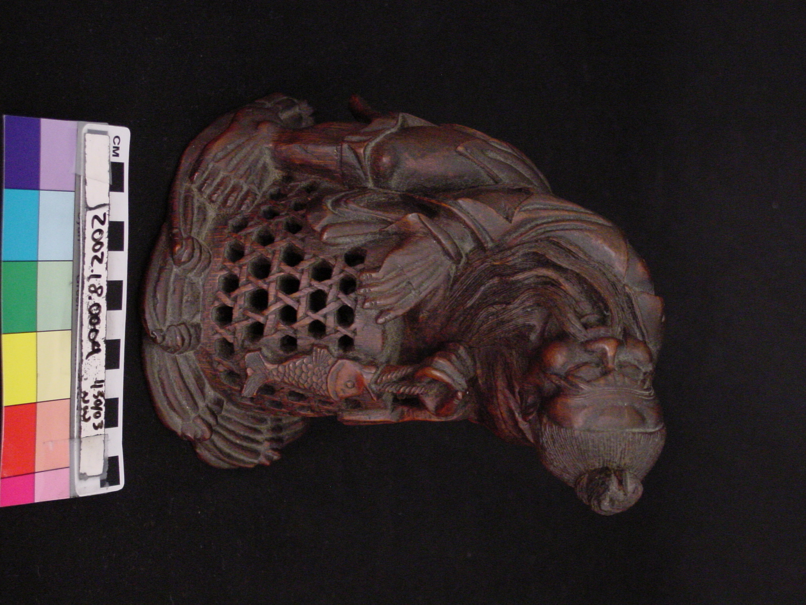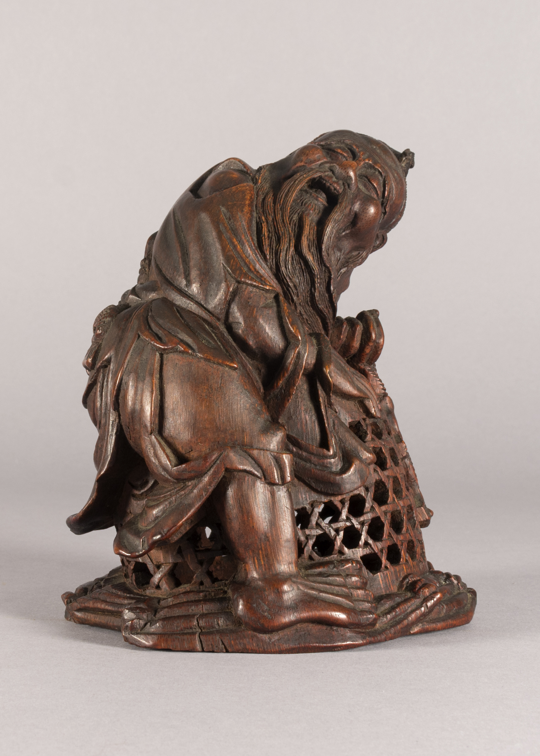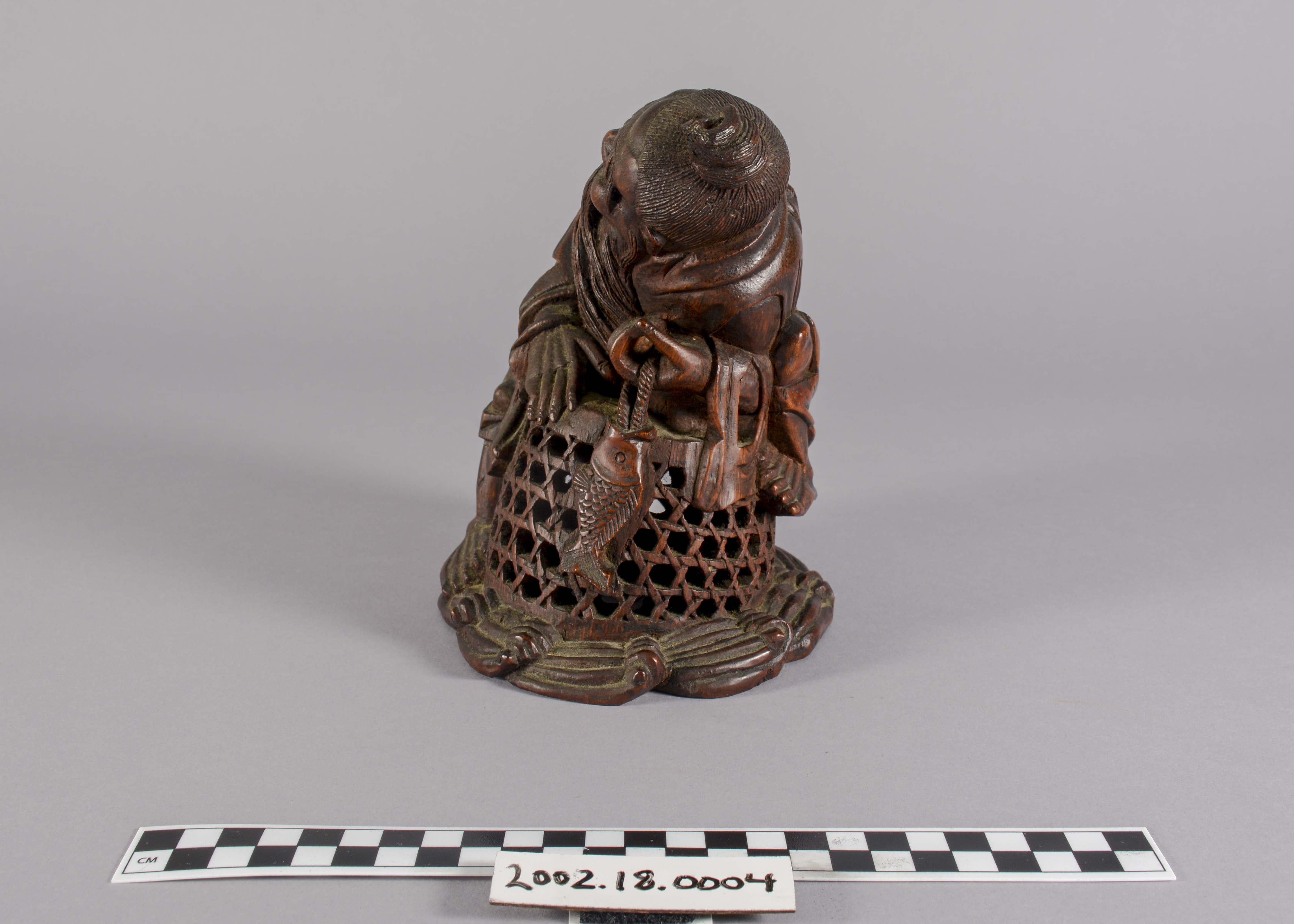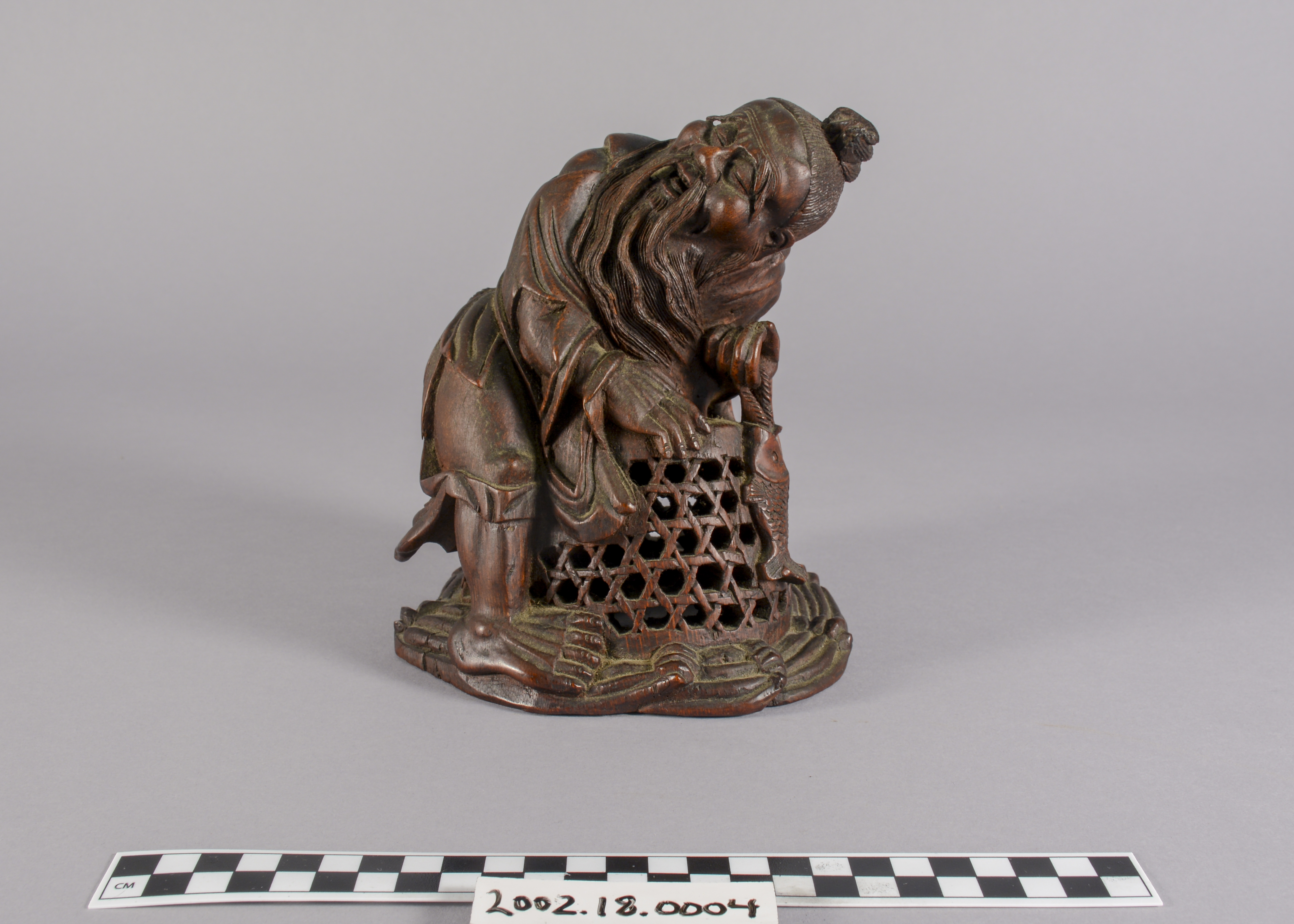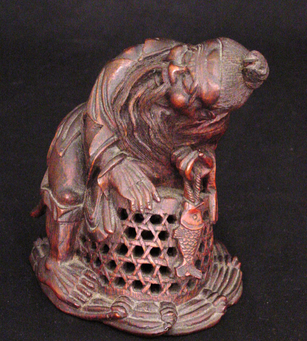 This is a Chinese bamboo carving of a fishermen. The natural world has been a consistent theme of Chinese artwork and can be seen in this artifact with the image of waves on the underside of the boat. This item is also constructed from bamboo which, while a difficult wood to carve, represents longevity given that it flourishes throughout winter.