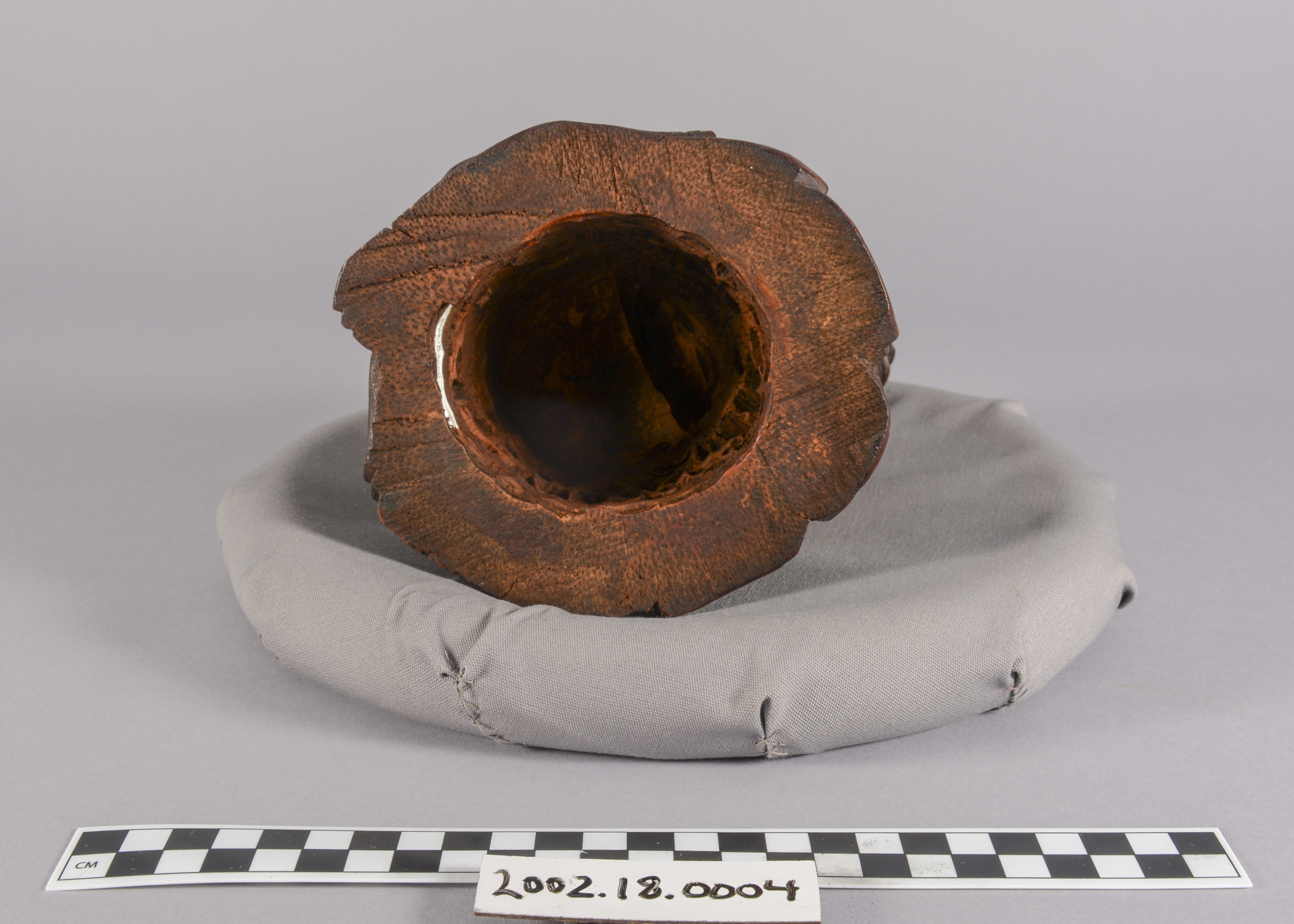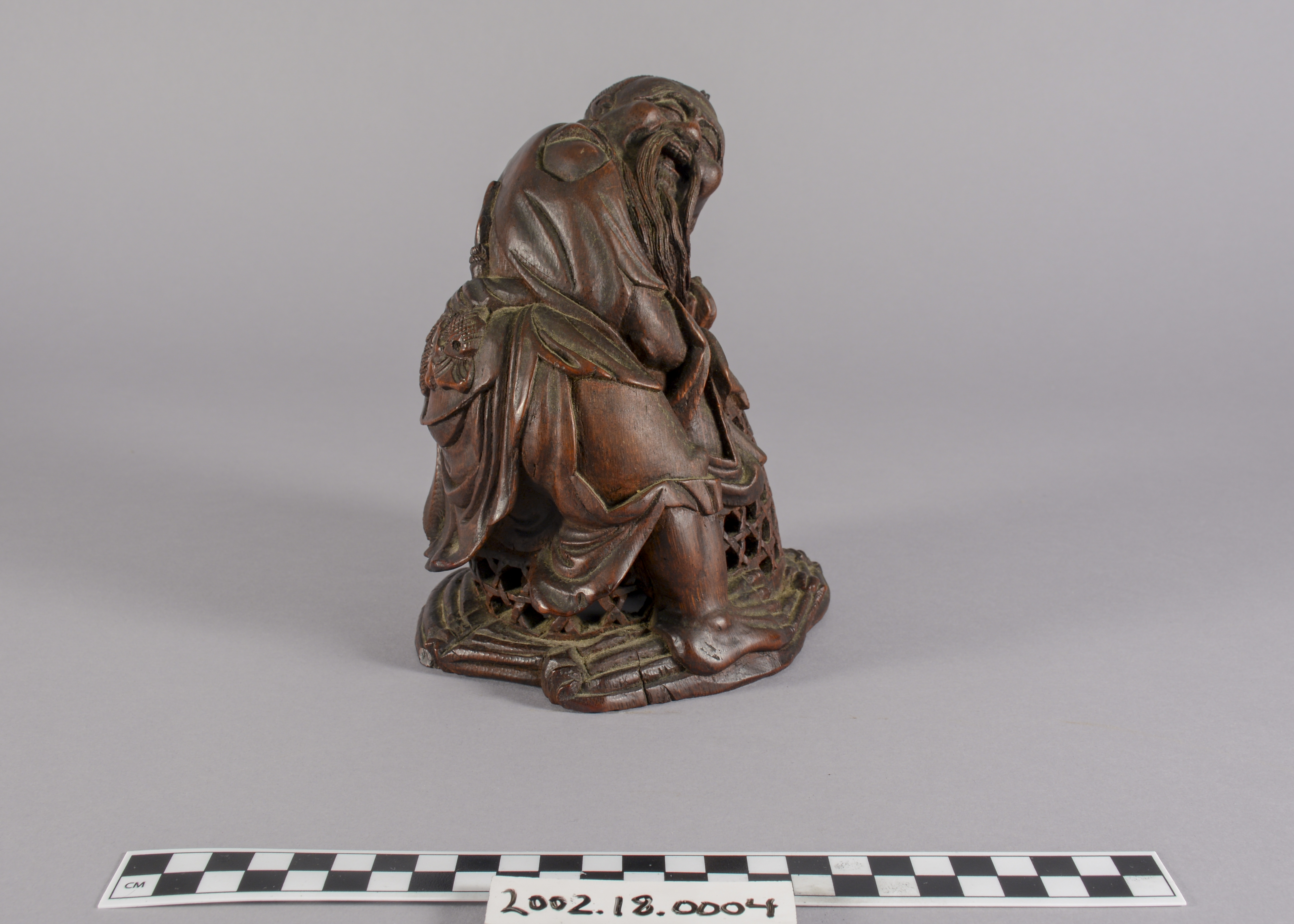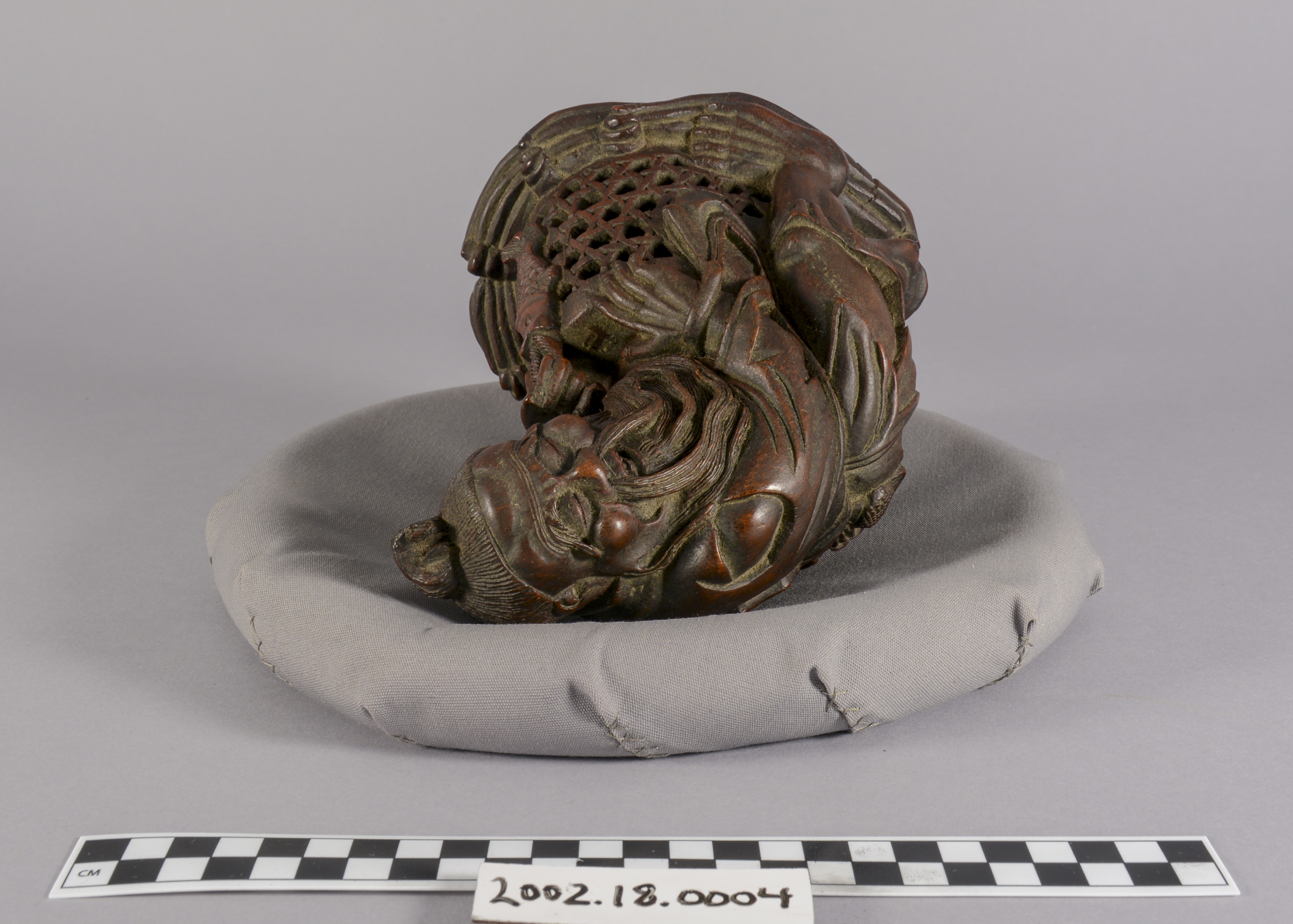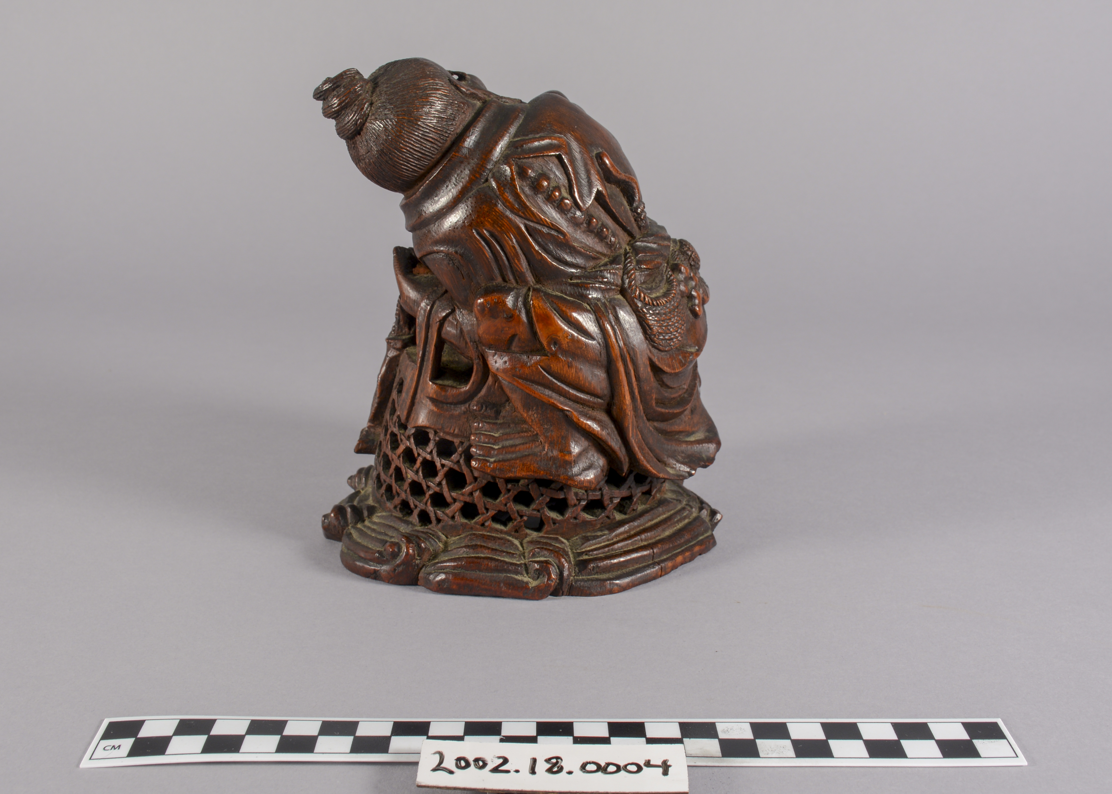 This is a Chinese bamboo carving of a fishermen. The natural world has been a consistent theme of Chinese artwork and can be seen in this artifact with the image of waves on the underside of the boat. This item is also constructed from bamboo which, while a difficult wood to carve, represents longevity given that it flourishes throughout winter.