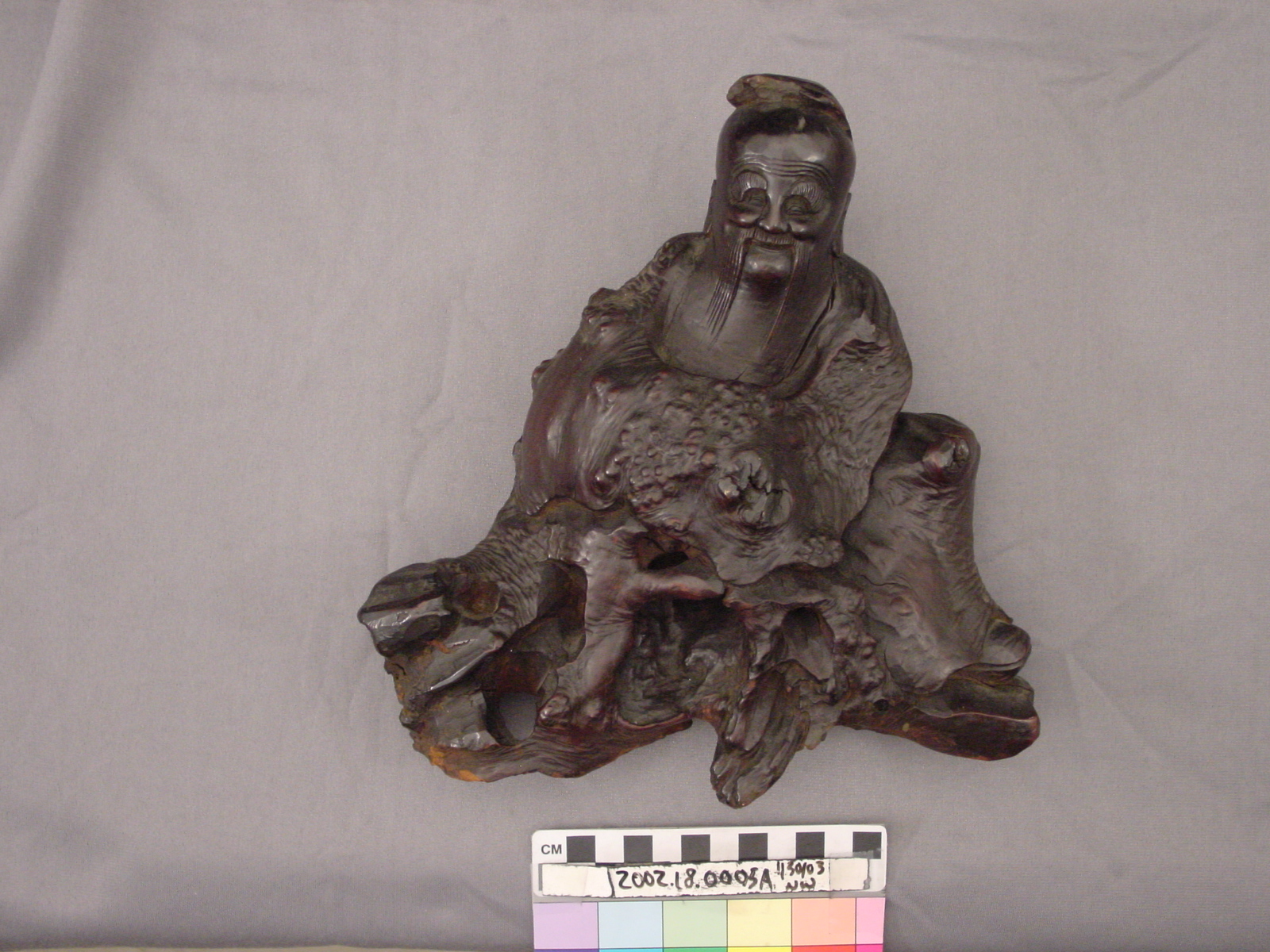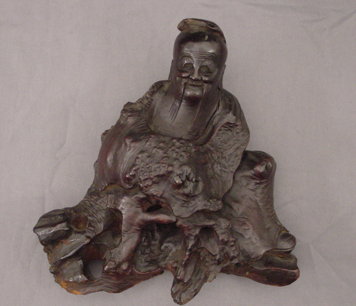 This is a boxwood carving of a Lohan, likely Rahula, who is one of the 500 Buddhist disciples to achieve enlightenment. As the second of the five Chinese elements, wood is highly venerated as a material for decorative art. Due to this perception, artists frequently ornamented their wooden materials with images of mythical and / or religious meaning. Rootwood designed works were appealing to scholars because of their irregular shapes, enabling the viewer to form various interpretations on what the resulting carved images could be. Sculptures and furniture were also obtained by Chinese collectors as early as the Song Dynasty (960-1279).
