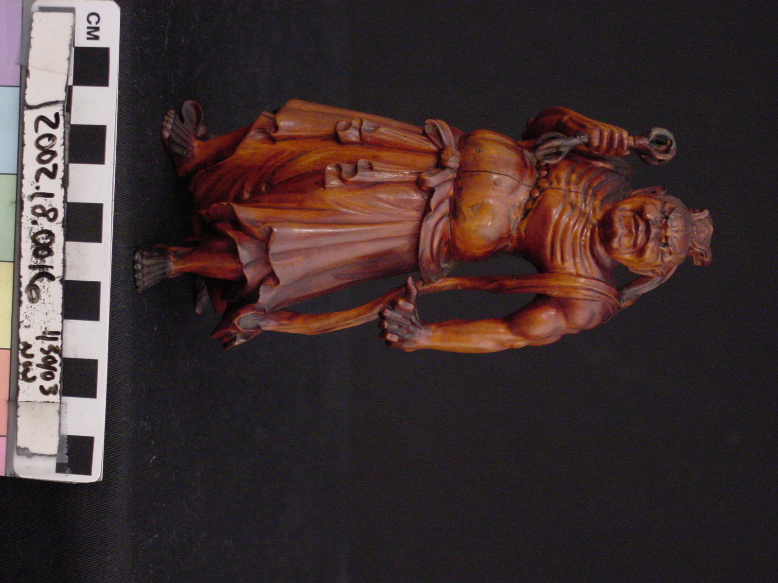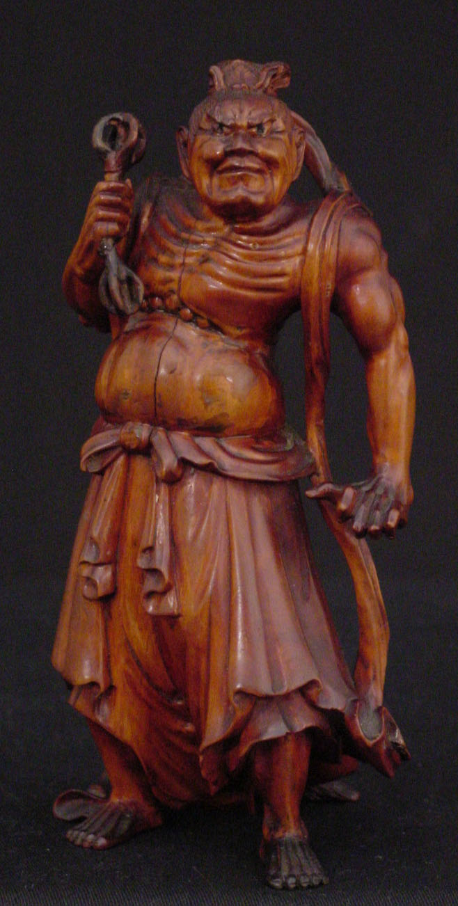 This is a Japanese okimono of one of the two Nio (Benevolent Kings), a pair of guardian deities who protect Buddhist sanctuaries. They are generally represented as warriors carrying a vajra, a club and ritualistic item of Hindu and Buddhist belief.