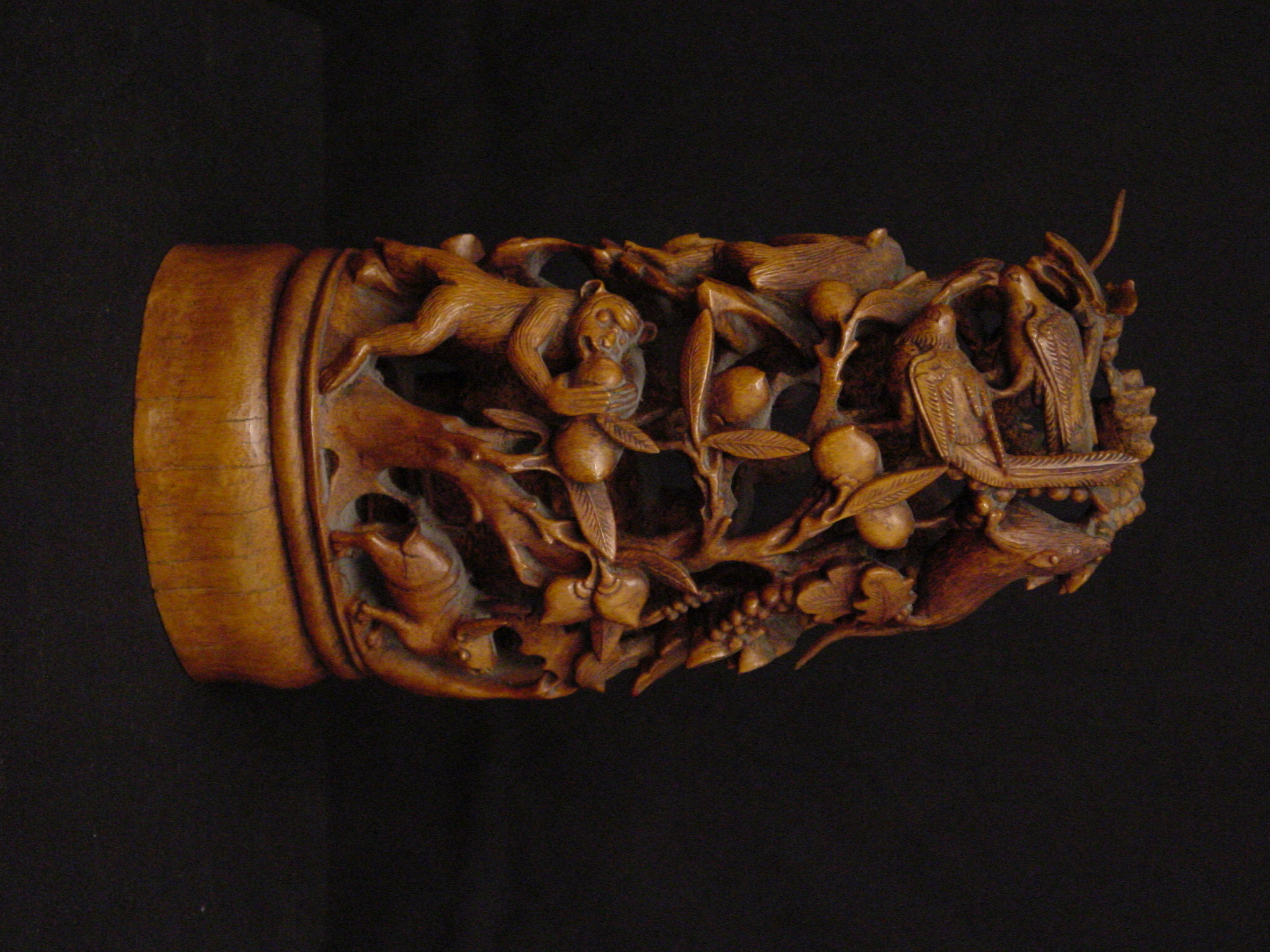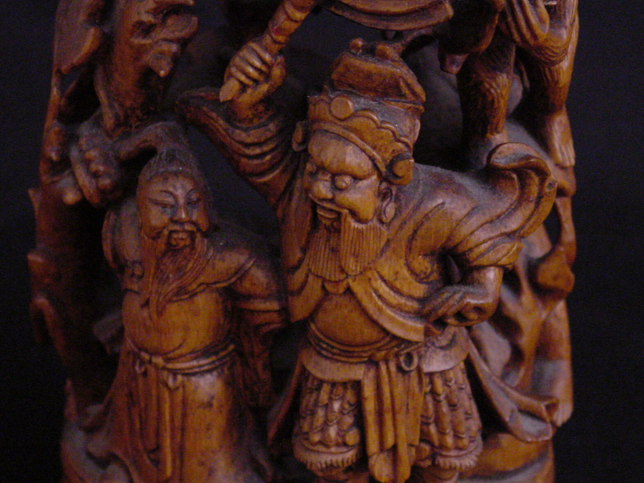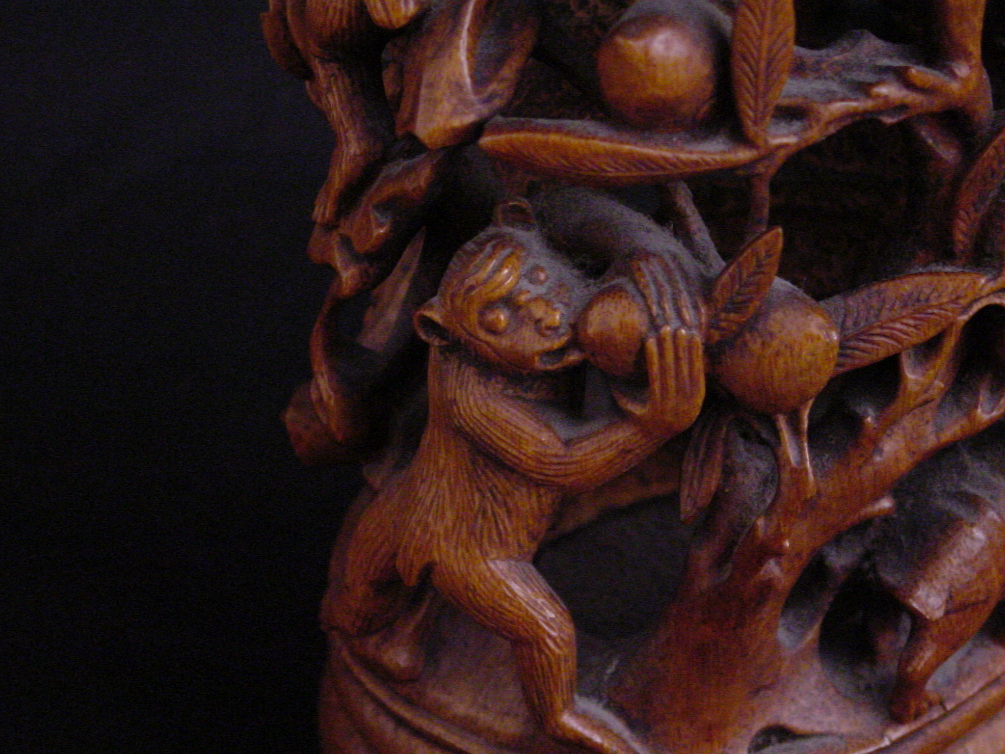 This carving from the Qing Dynasty (1644-1911) consists of a mountain in a continuous design of birds, animals, and figures. One of the figures is Kuan Ti, the god of war, patron of literature, and upholder of justice. During the Time of the Three Kingdoms, he was a supporter of the Han dynasty emperor Liu Bei and was one of the brothers to raise an army to suppress rebellious forces. Kuan Ti is also considered the tutelary deity of money making projects and was eventually regarded as the patron saint of wealth.