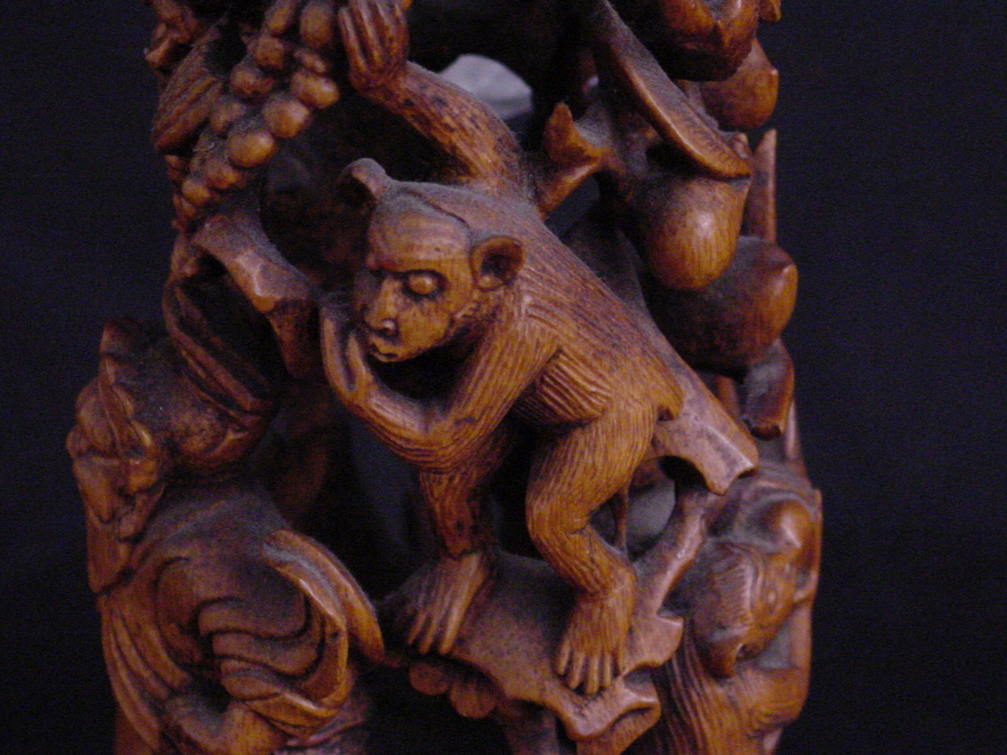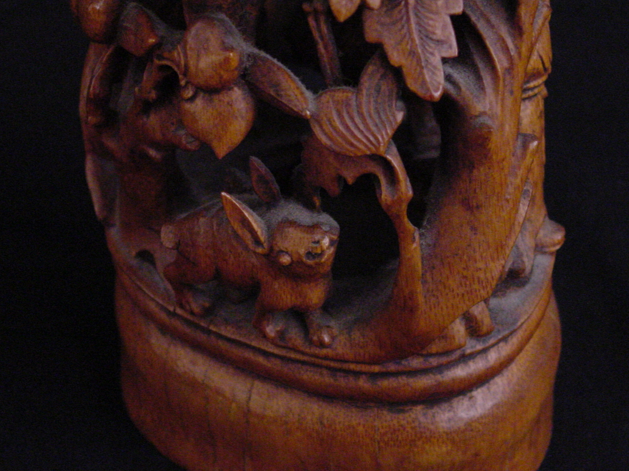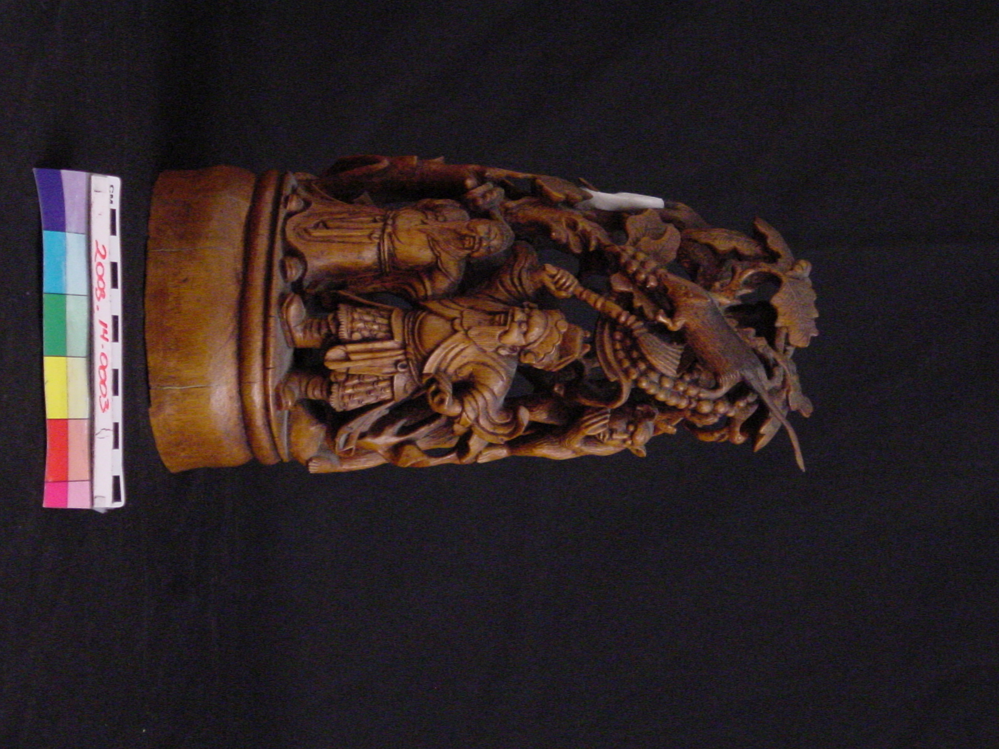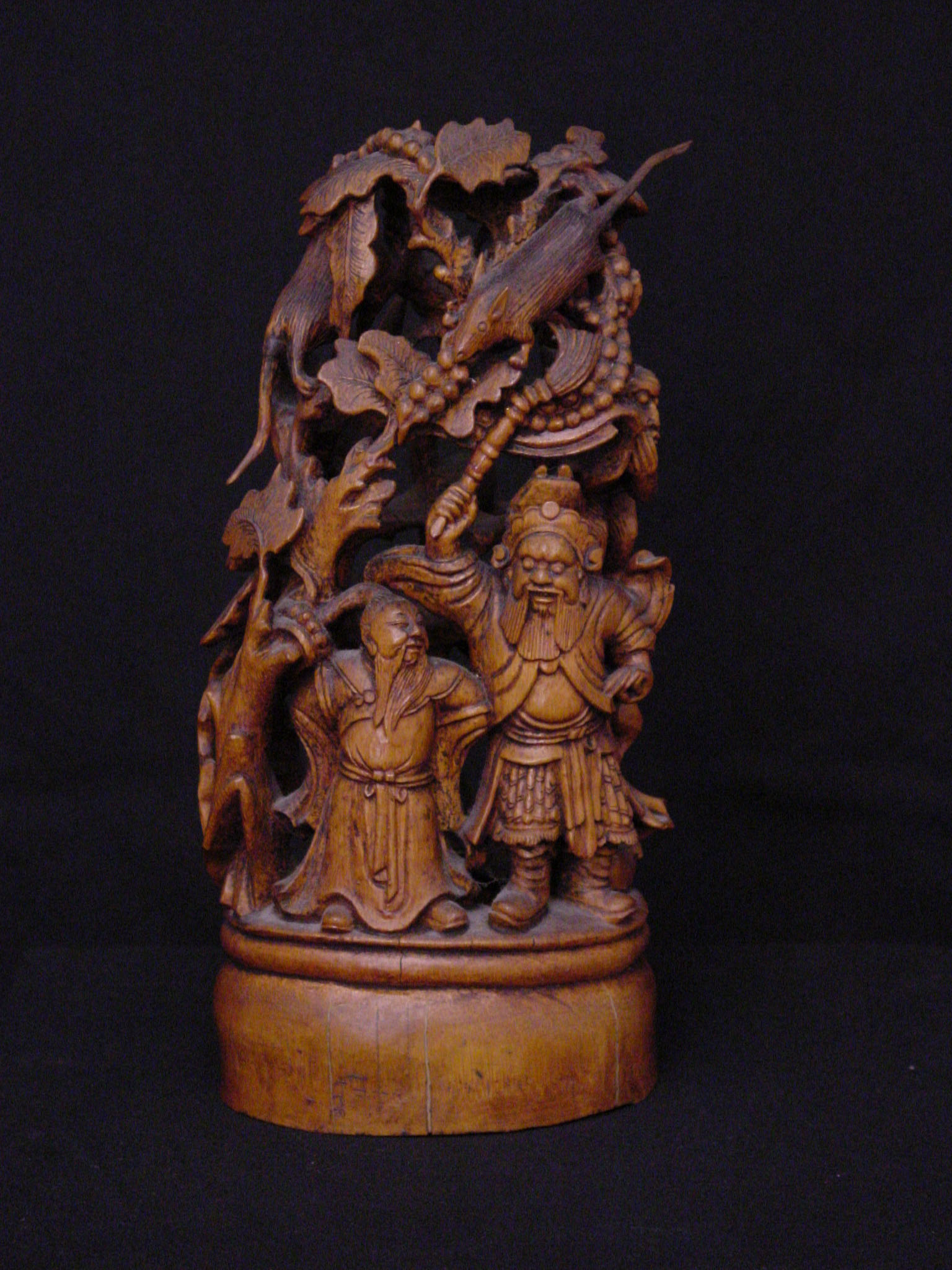 This carving from the Qing Dynasty (1644-1911) consists of a mountain in a continuous design of birds, animals, and figures. One of the figures is Kuan Ti, the god of war, patron of literature, and upholder of justice. During the Time of the Three Kingdoms, he was a supporter of the Han dynasty emperor Liu Bei and was one of the brothers to raise an army to suppress rebellious forces. Kuan Ti is also considered the tutelary deity of money making projects and was eventually regarded as the patron saint of wealth.