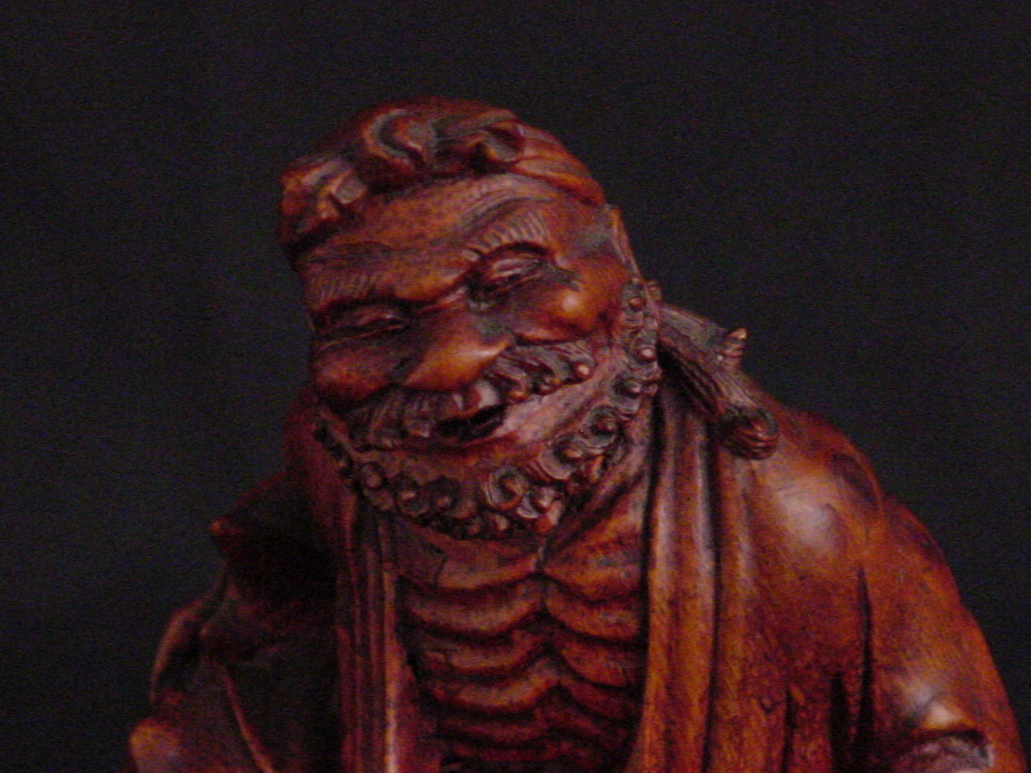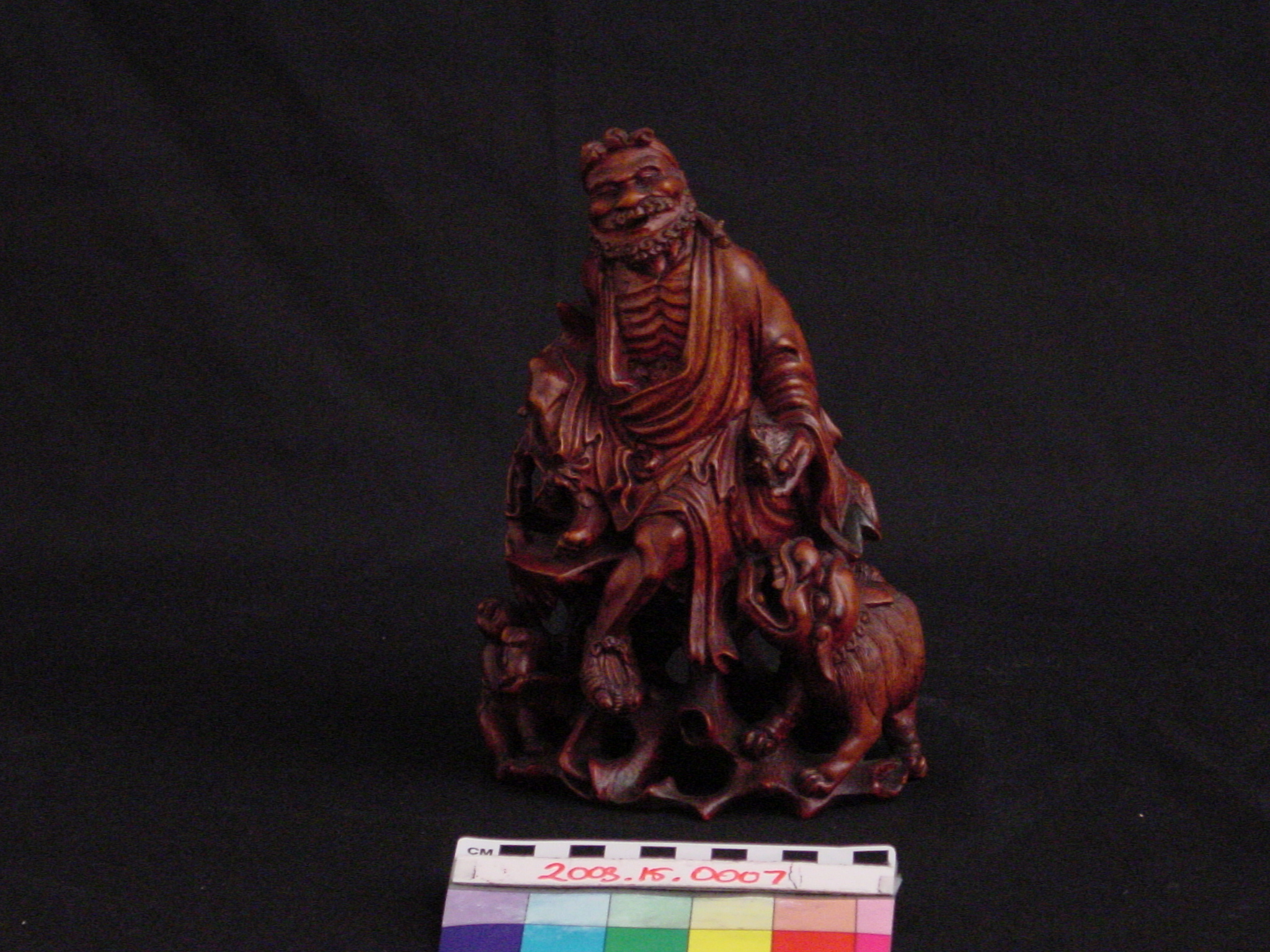 The Spurlock museum holds a variety of Chinese lacquer figures created during the Qing Dynasty (1644-1911) which serve as representations of regional beliefs and ethics, cultural figureheads, and the human condition. Rootwood designed works were appealing to scholars because of their irregular shapes, enabling the viewer to form various interpretations on what the resulting carved images could be. Sculptures and furniture were also obtained by Chinese collectors as early as the Song Dynasty (960-1279). Common muses of Chinese lacquered items included famed scholars and poets, arhats (Buddhist holy men), bodhisattvas (Buddhists who have achieved enlightenment but choose to remain in the world to help others end their suffering), deities of East Asian belief structures, and the Chinese zodiac. Animals, plants, and other natural objects were also carved and are typically associated with good fortune and other favorable life conditions.