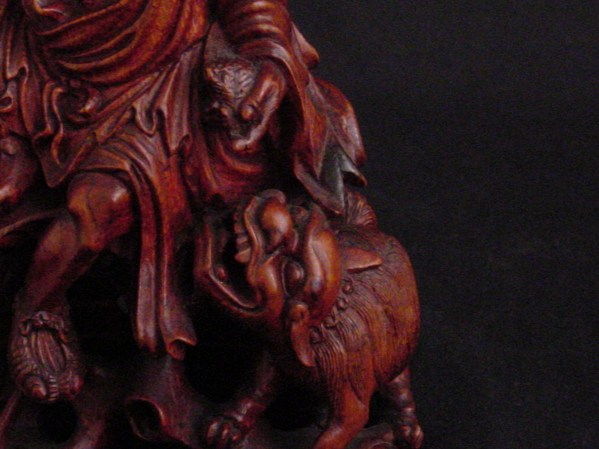 This is a Chinese lacquer carving of a Lohan with a Ch'i-lin (Qilin) and a small child. A Lohan is one of the 500 Buddhist disciples to achieve enlightenment. Lohans have learned the teachings of the Shaka (historical Buddha) and earned the title of Mugaku (nothing else to learn). The Ch'i-lin, also known as the Chinese unicorn, is one of the four mythological animals, the others being the dragon, phoenix, and tortoise. In legend, the rare appearance of the Ch'i-lin coincides with the imminent birth or death of a sage or illustrious ruler.