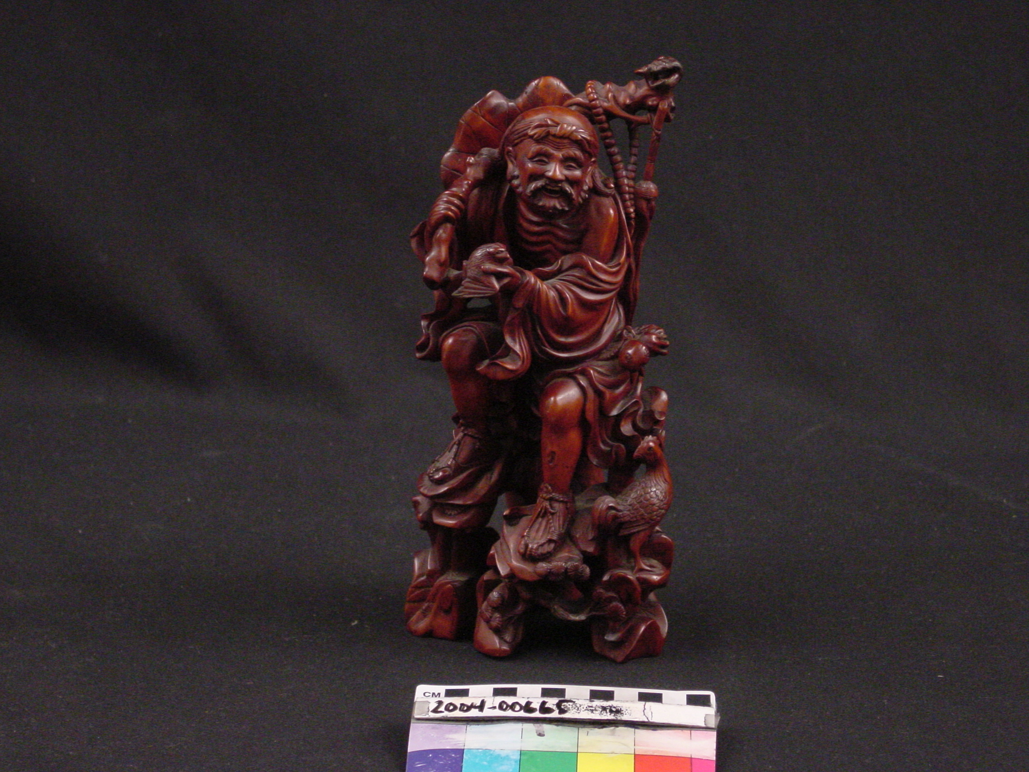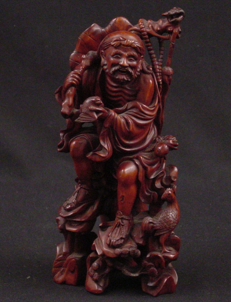 This is a boxwood carving of a Lohan, one of the 500 Buddhist disciples to achieve enlightenment. Among his regalia is a fly whisk, a tool which prevents Buddhists from killing even the smallest creatures, and a finger citron which connotes Buddhism due to its form resembling the classic position of Buddha's hand (index and little finger pointed upward). Wood, as the second of the five Chinese elements, is highly venerated as a material for decorative art. Due to this perception, artists frequently ornamented their wooden materials with images of mythical and / or religious meaning.