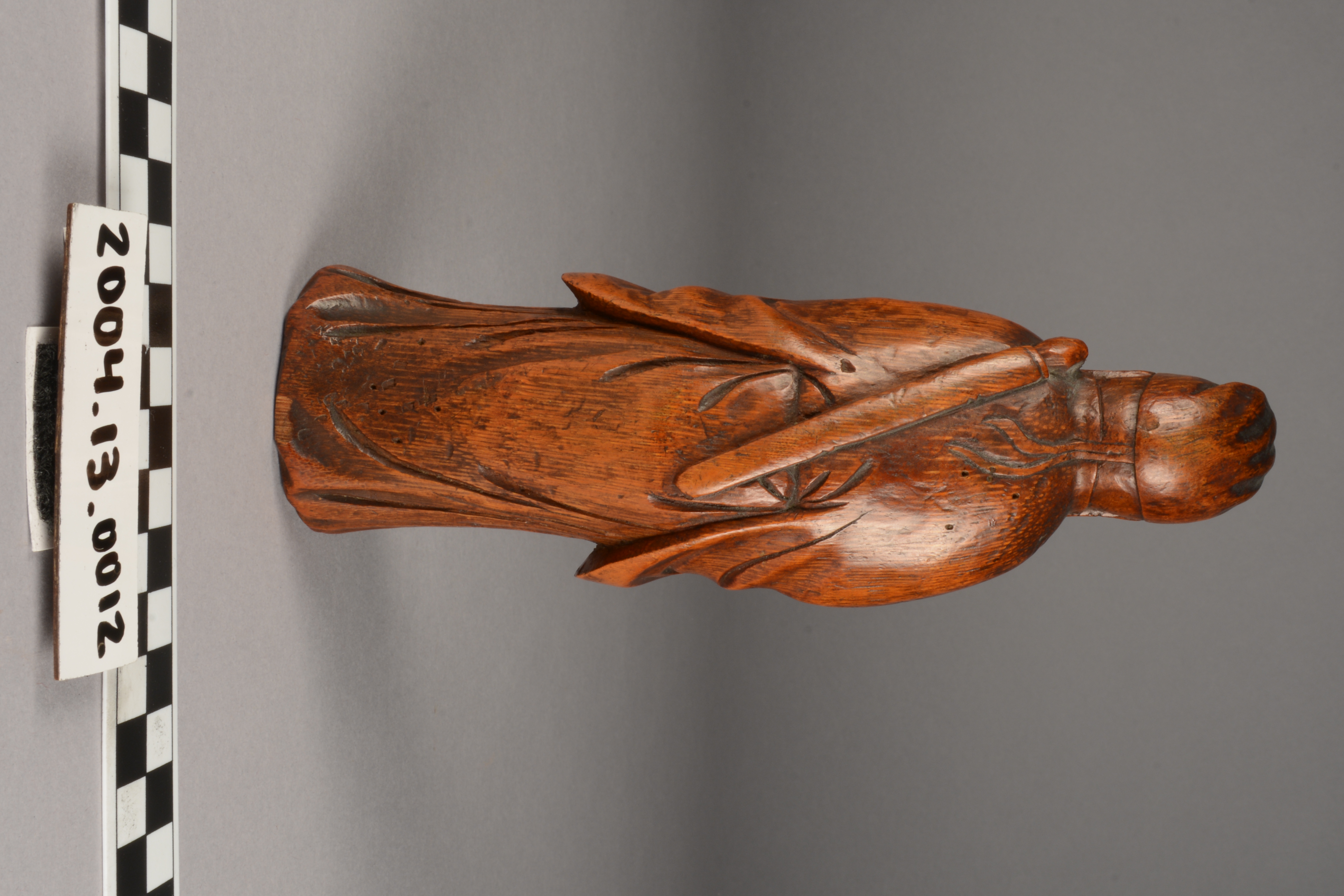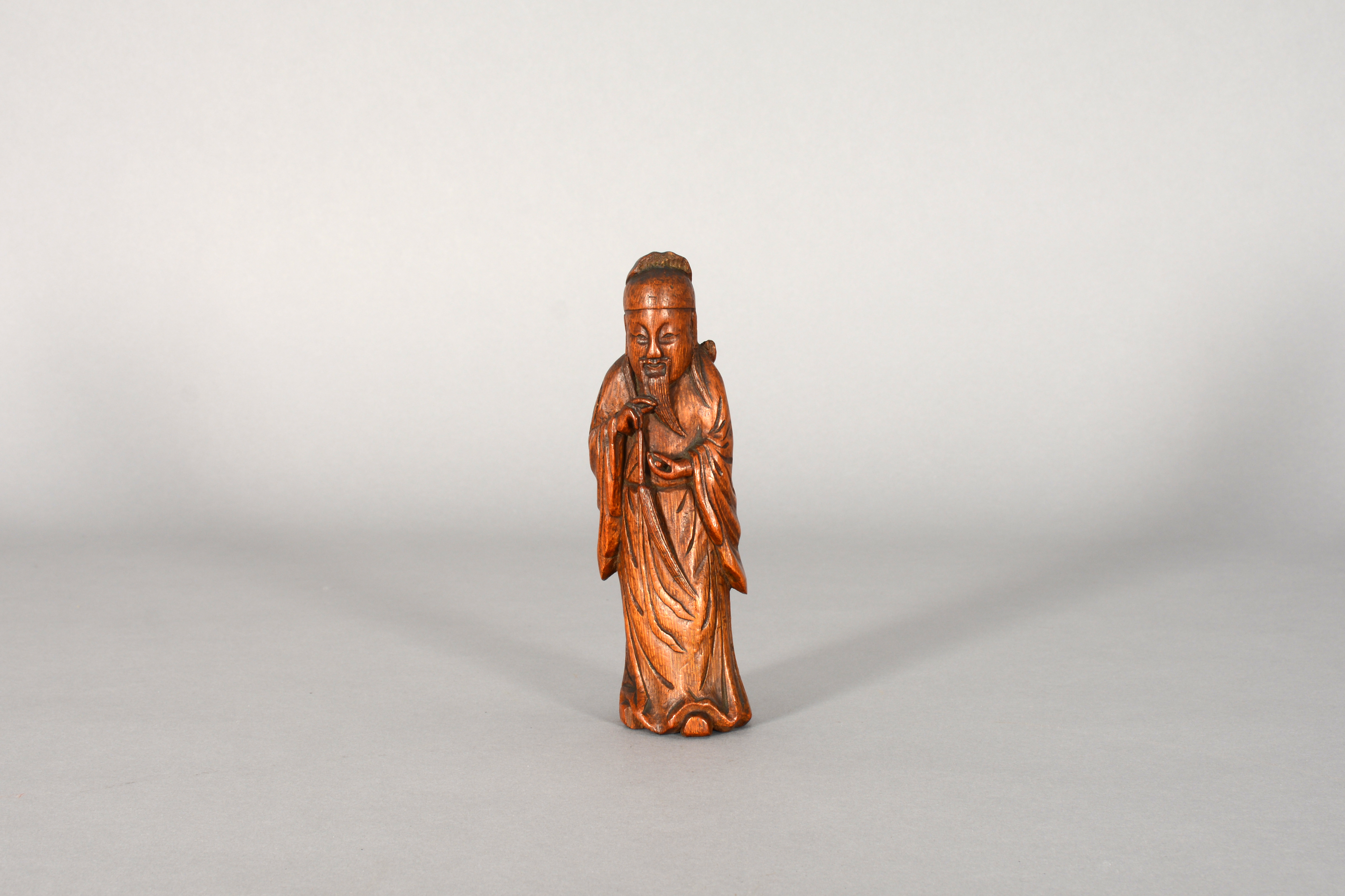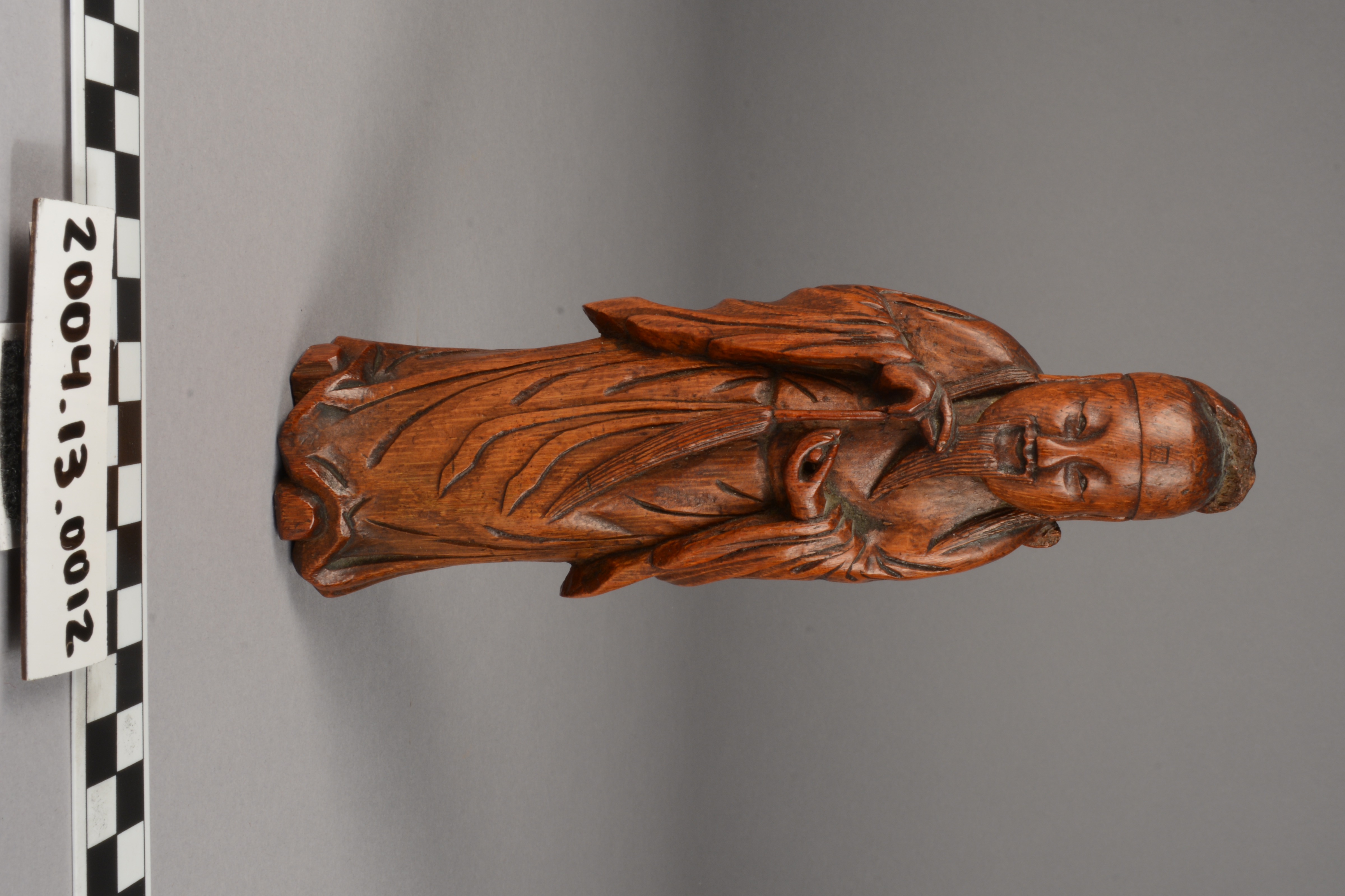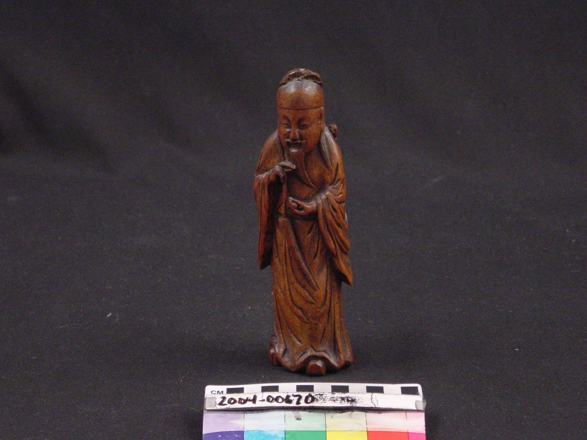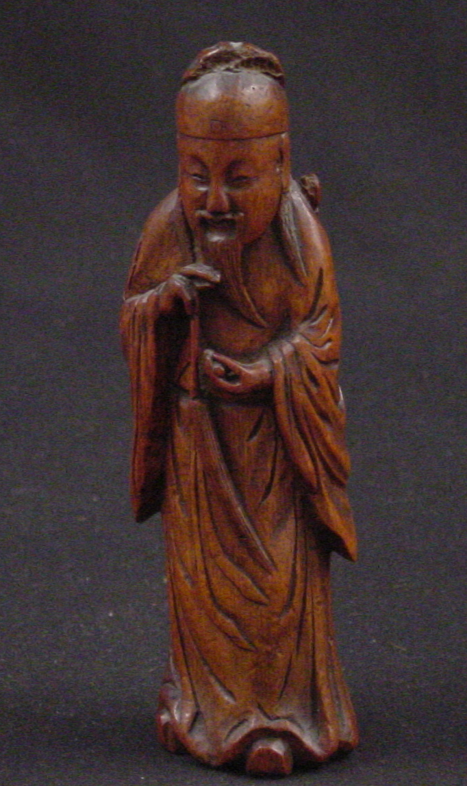 This is a carving of Lu Tung-pin, a scholar and recluse who learned the secrets of Daoism and became one of the eight Daoist immortals (Pa Hsien). He learned this knowledge from Chun-li-Ch'uan, the chief of the immortals. The carving, from a material perspective, is also of high symbolic value as it is constructed from bamboo, a plant which represents longevity considering it consists of stalks that tend to flourish throughout winter.