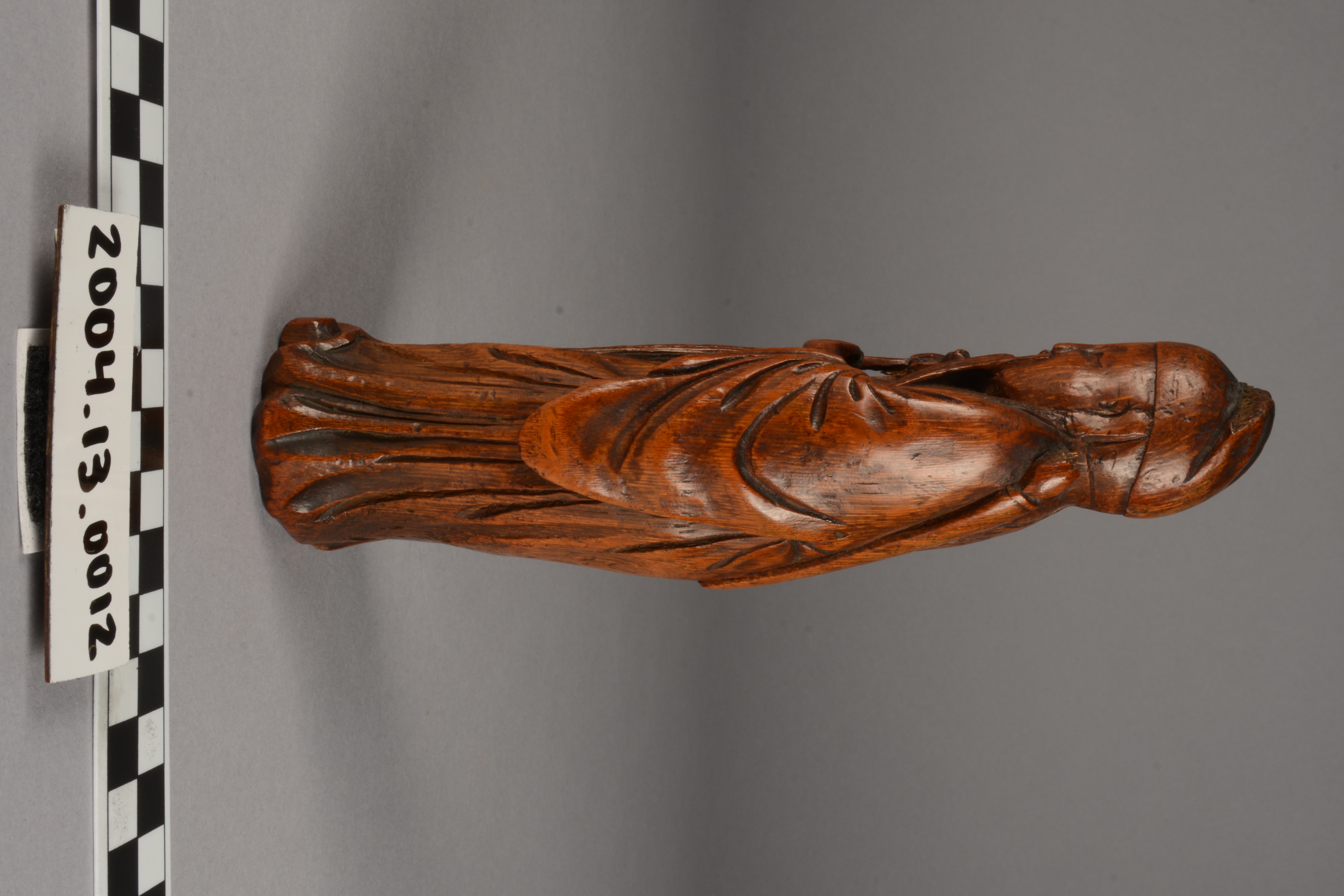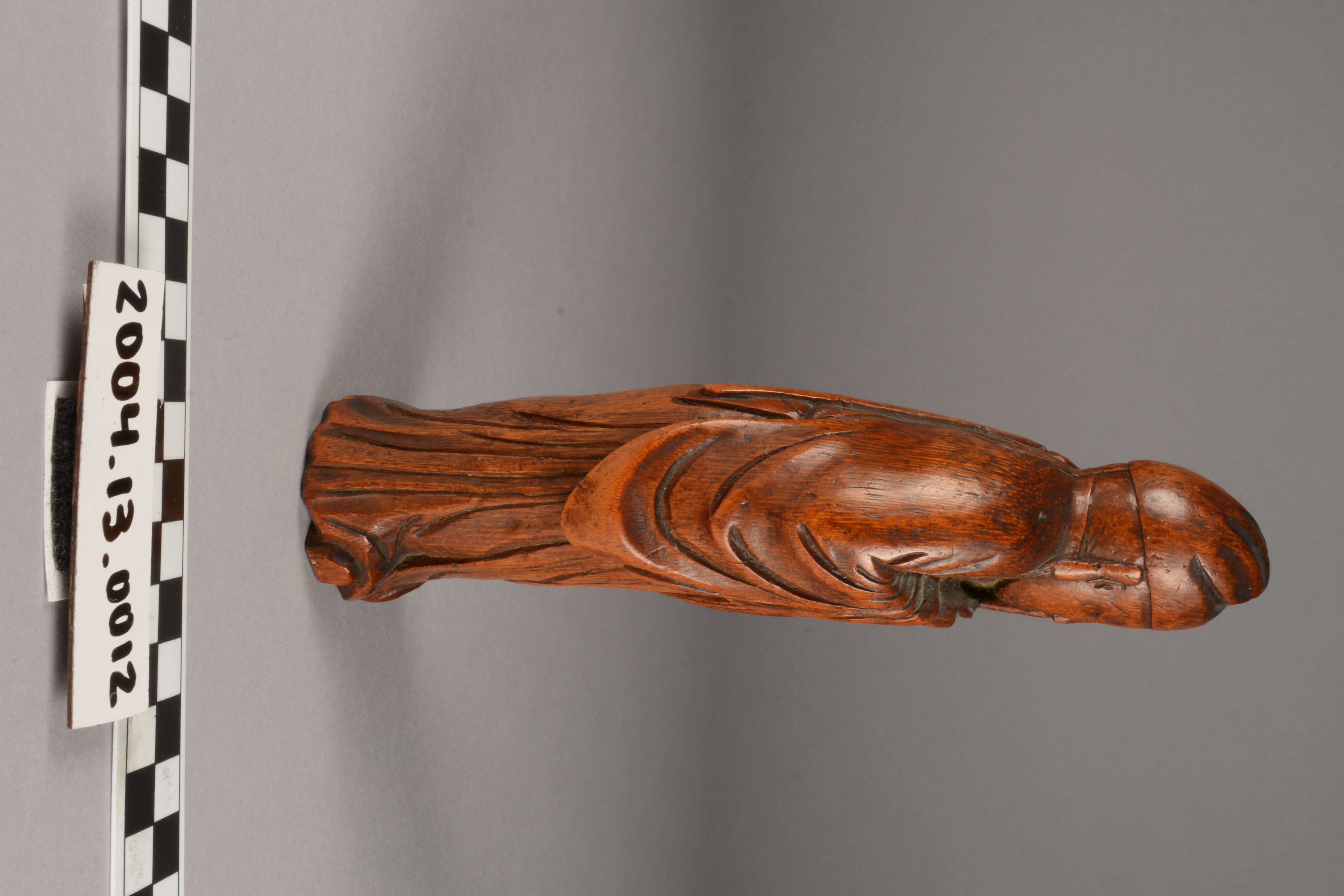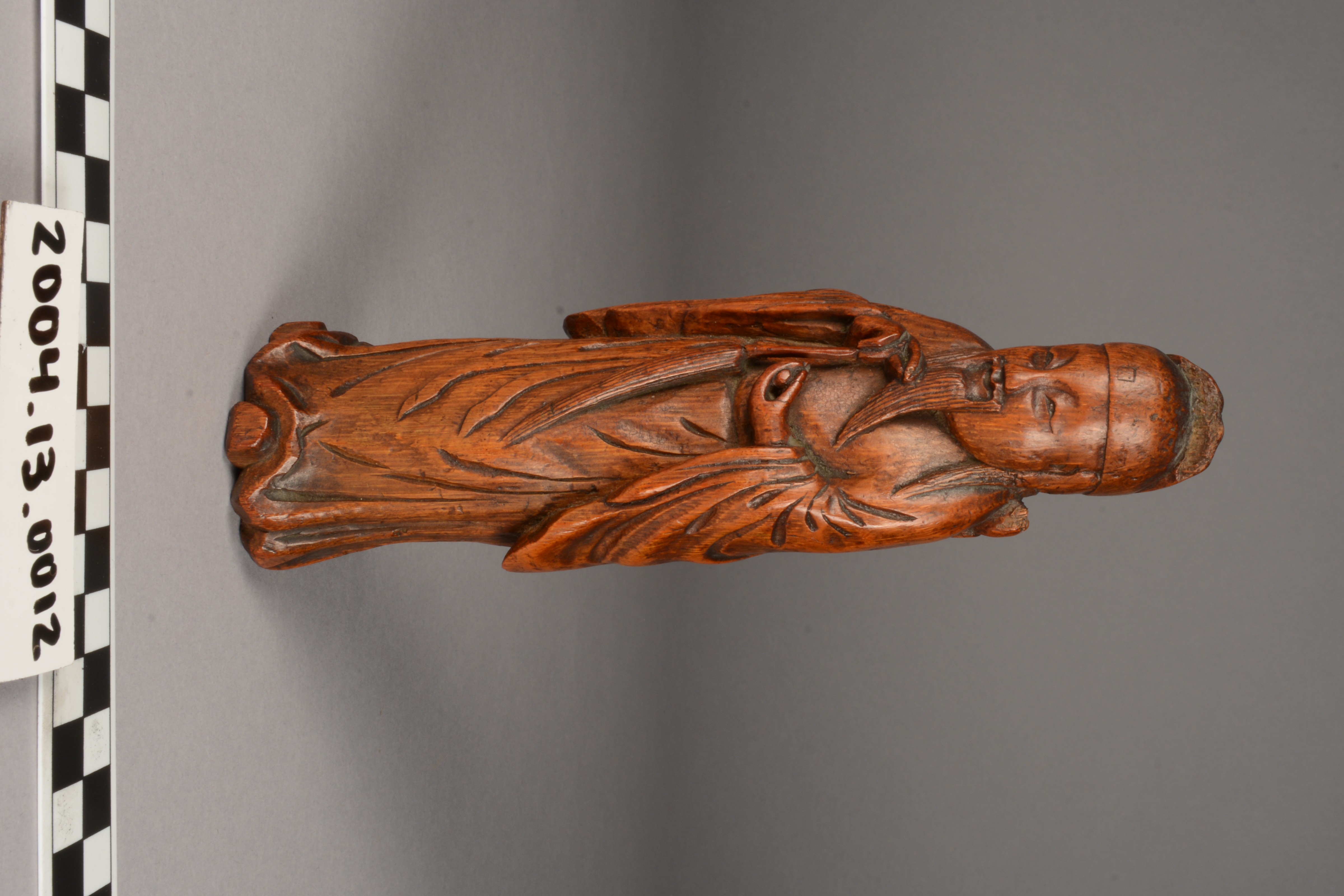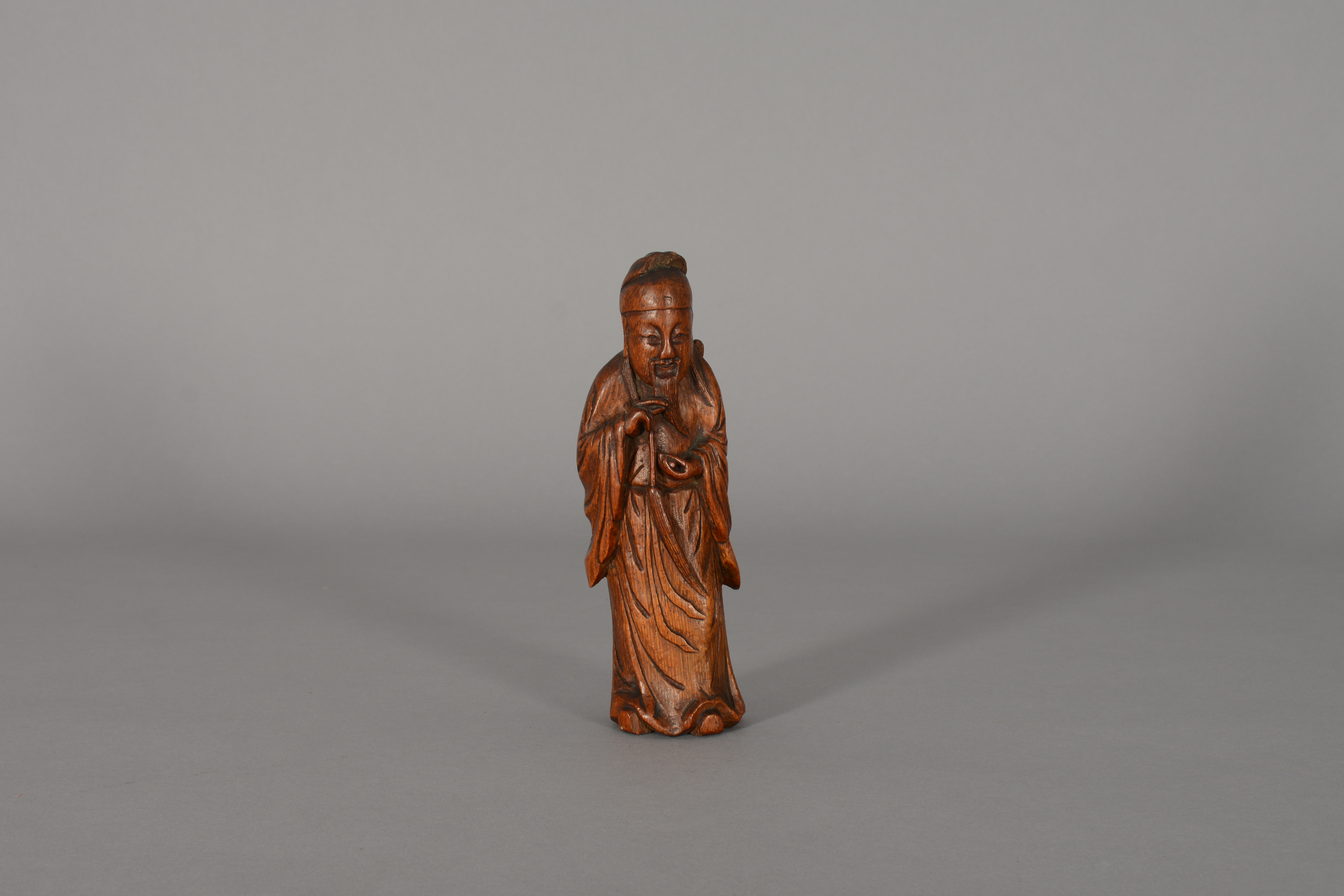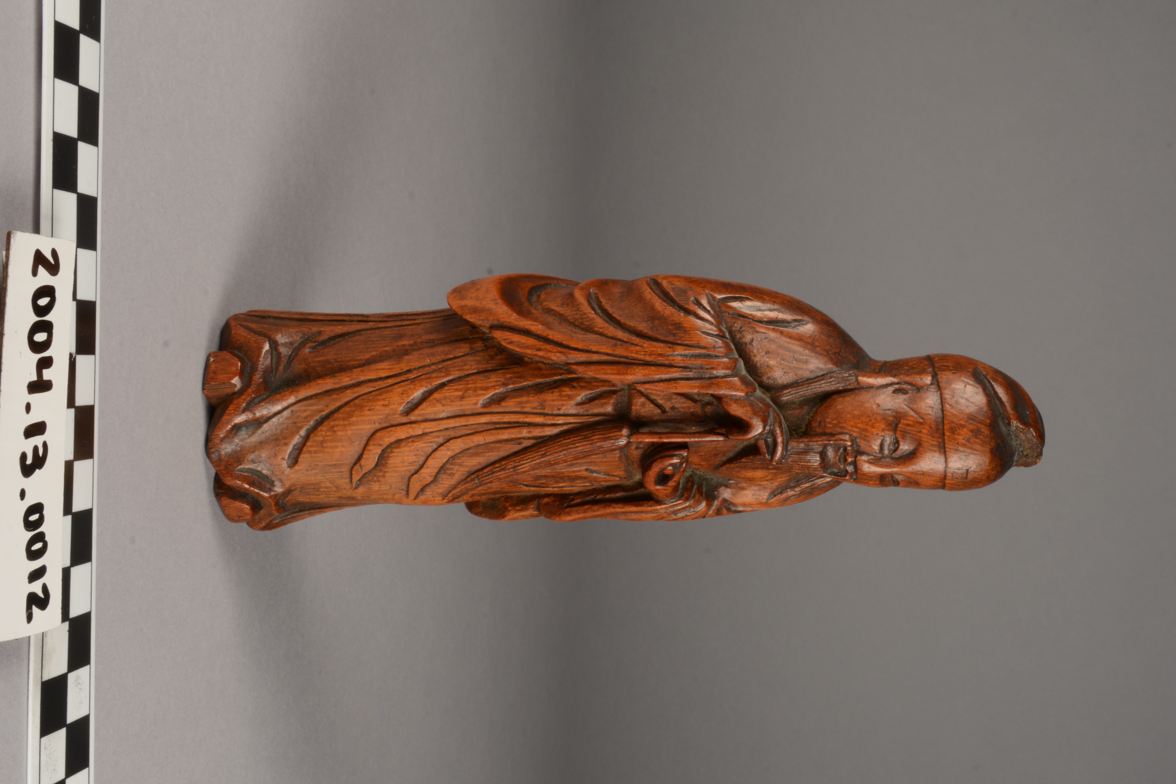 This is a carving of Lu Tung-pin, a scholar and recluse who learned the secrets of Daoism and became one of the eight Daoist immortals (Pa Hsien). He learned this knowledge from Chun-li-Ch'uan, the chief of the immortals. The carving, from a material perspective, is also of high symbolic value as it is constructed from bamboo, a plant which represents longevity considering it consists of stalks that tend to flourish throughout winter.