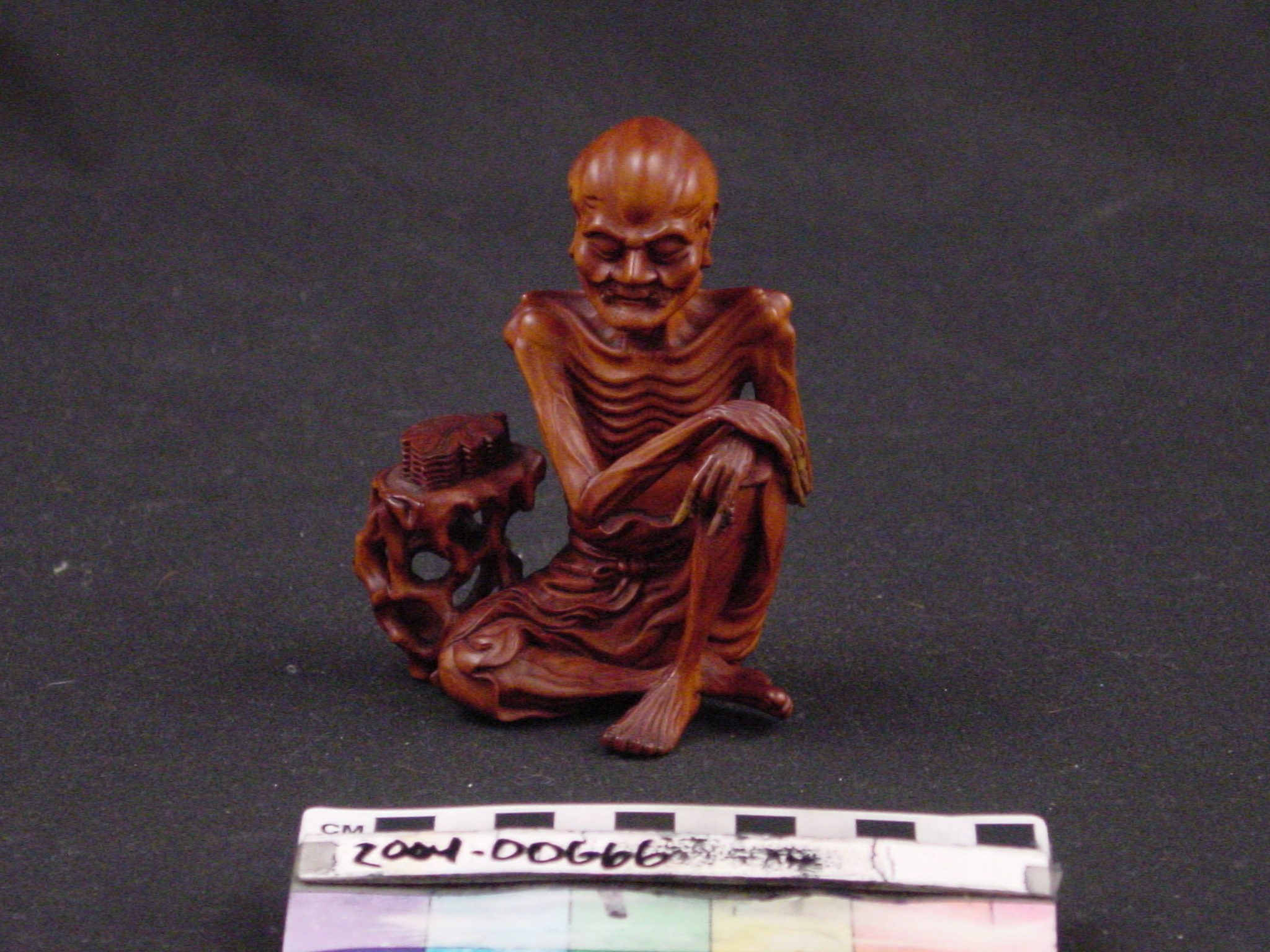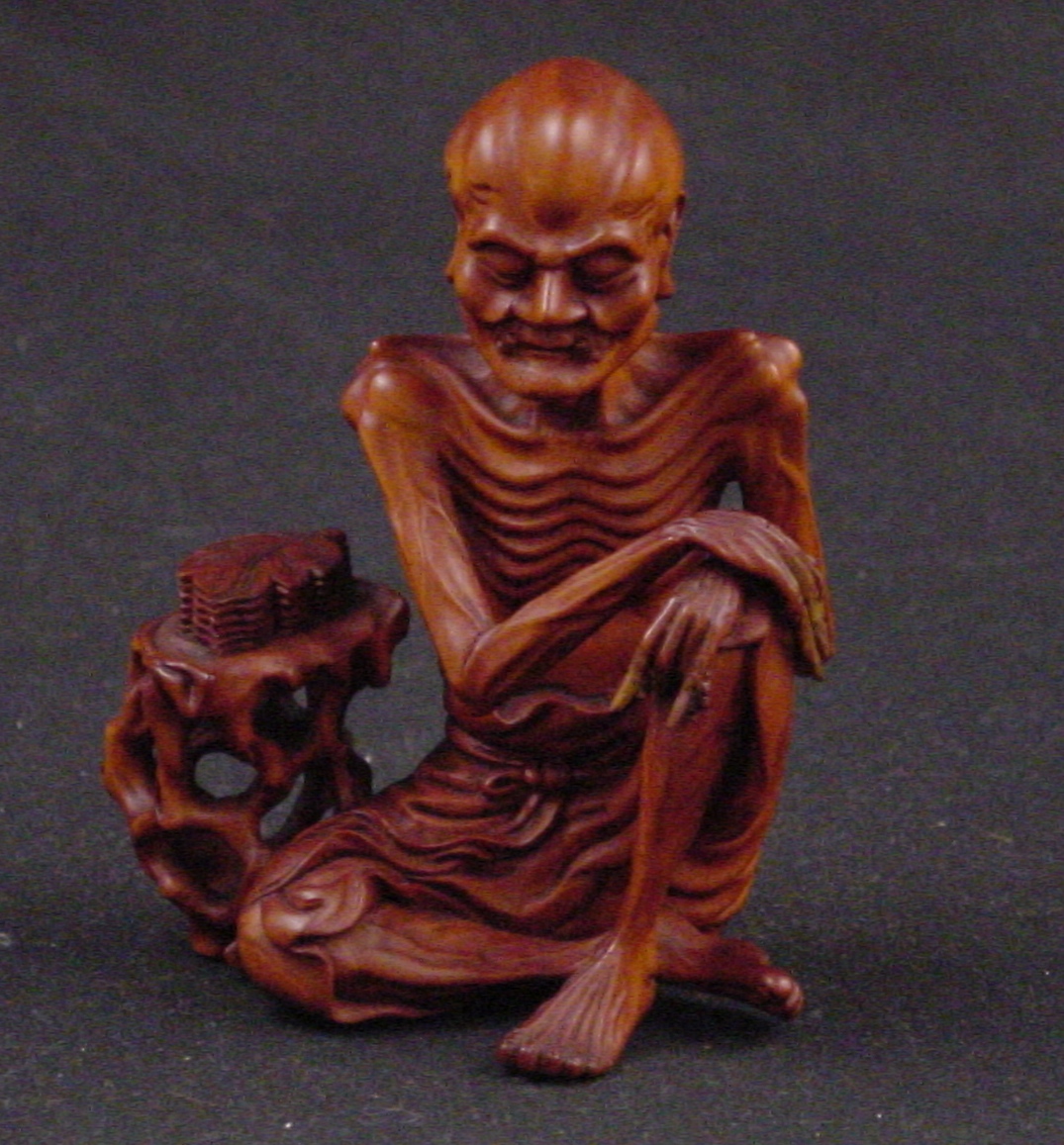 This is a boxwood lacquered carving of a an emaciated Lohan, one of the 500 Buddhist disciples to achieve enlightenment.