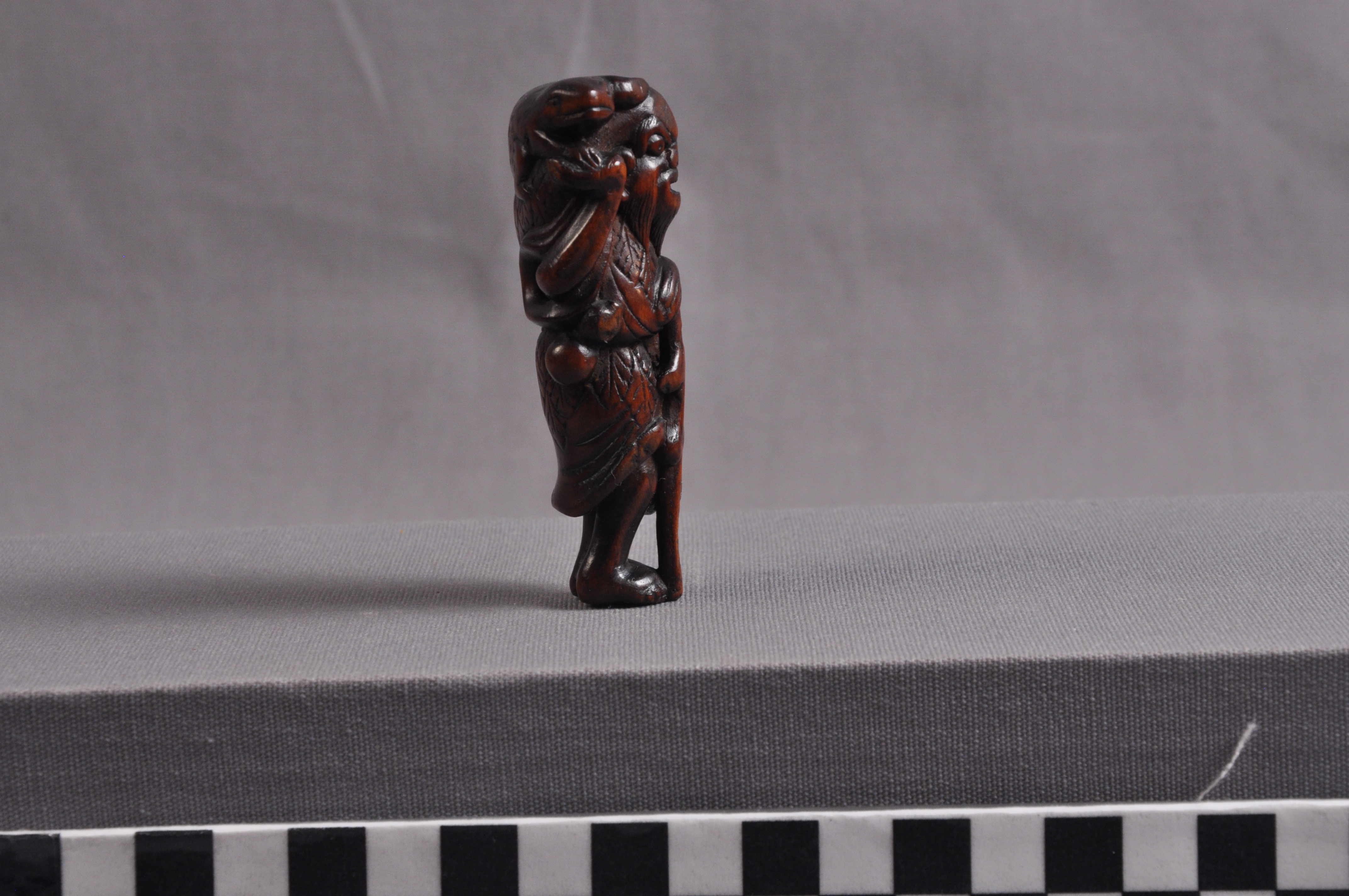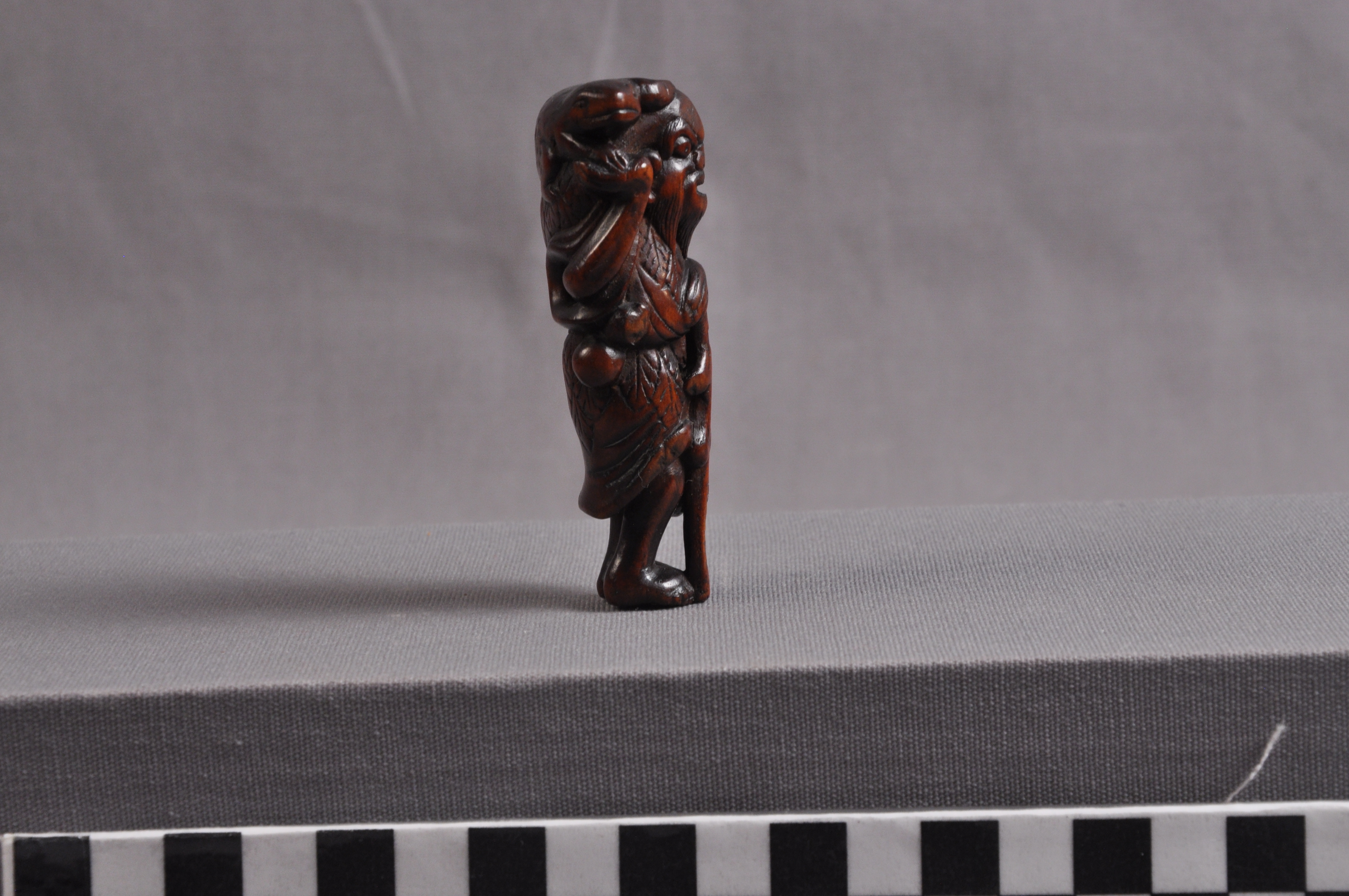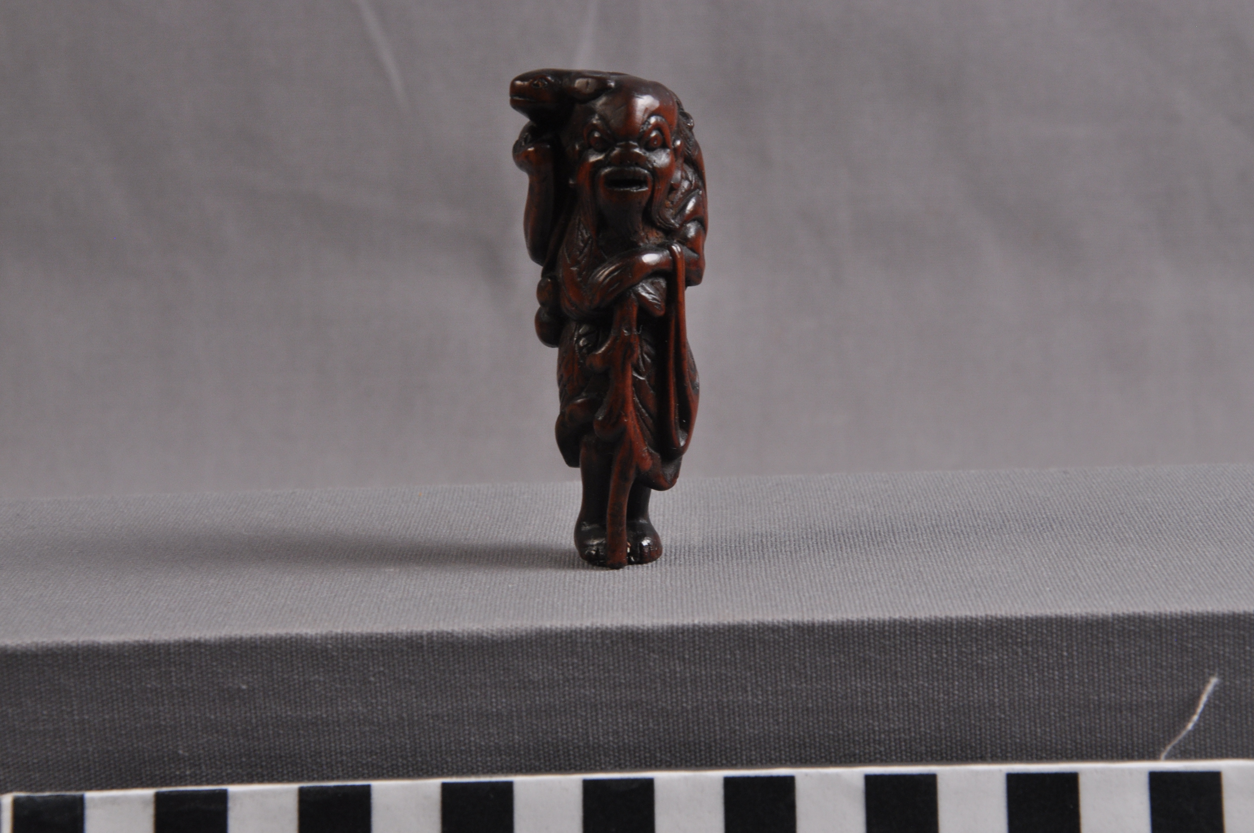 This is a netsuke of Gama Sennin with a three-legged toad. Sennin are Daoist holy men who have reached immortality. Frogs and toads are significant in East Asian culture as symbols of healing and frivolity, with the three-legged variety being particularly auspicious.