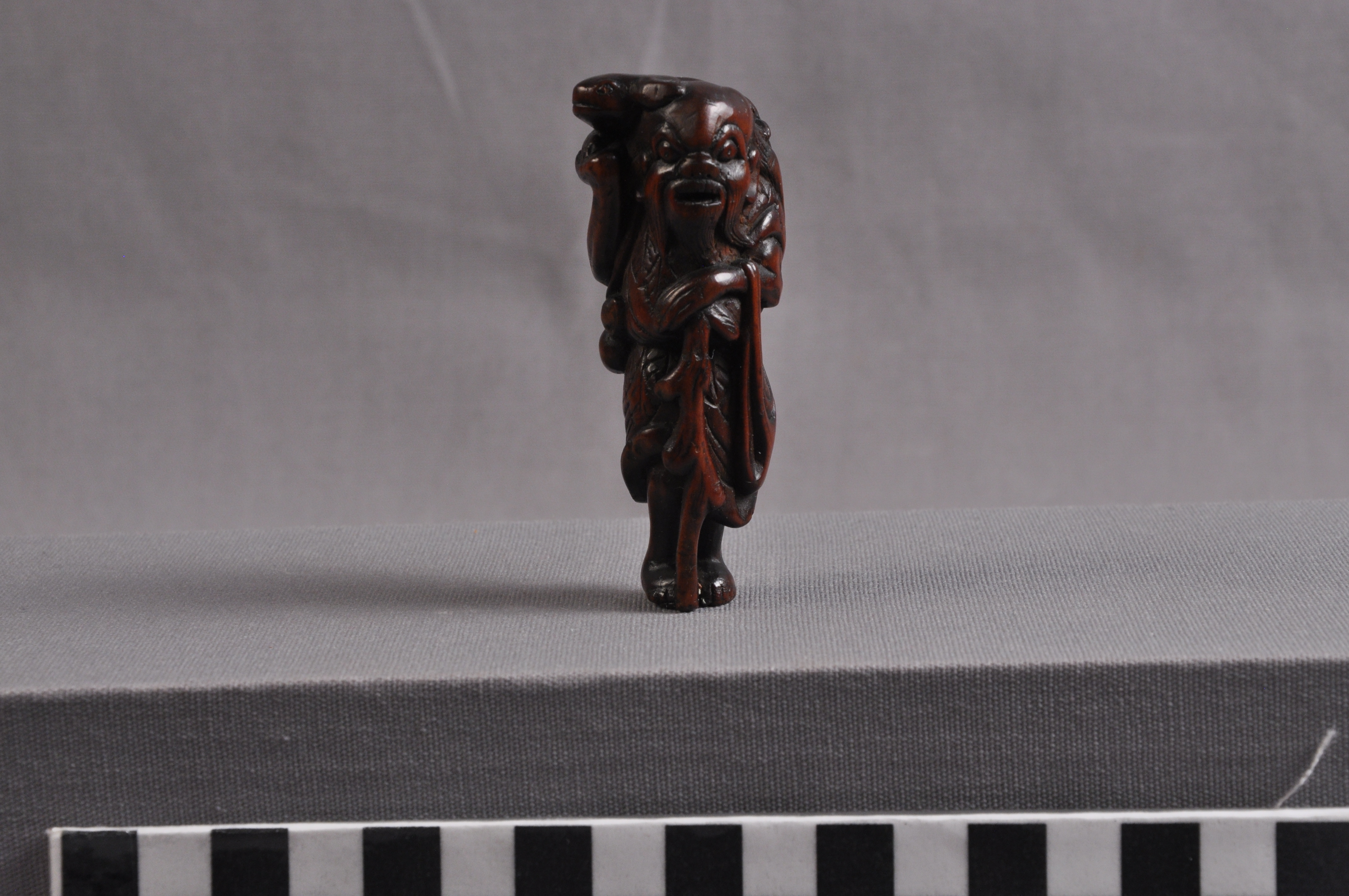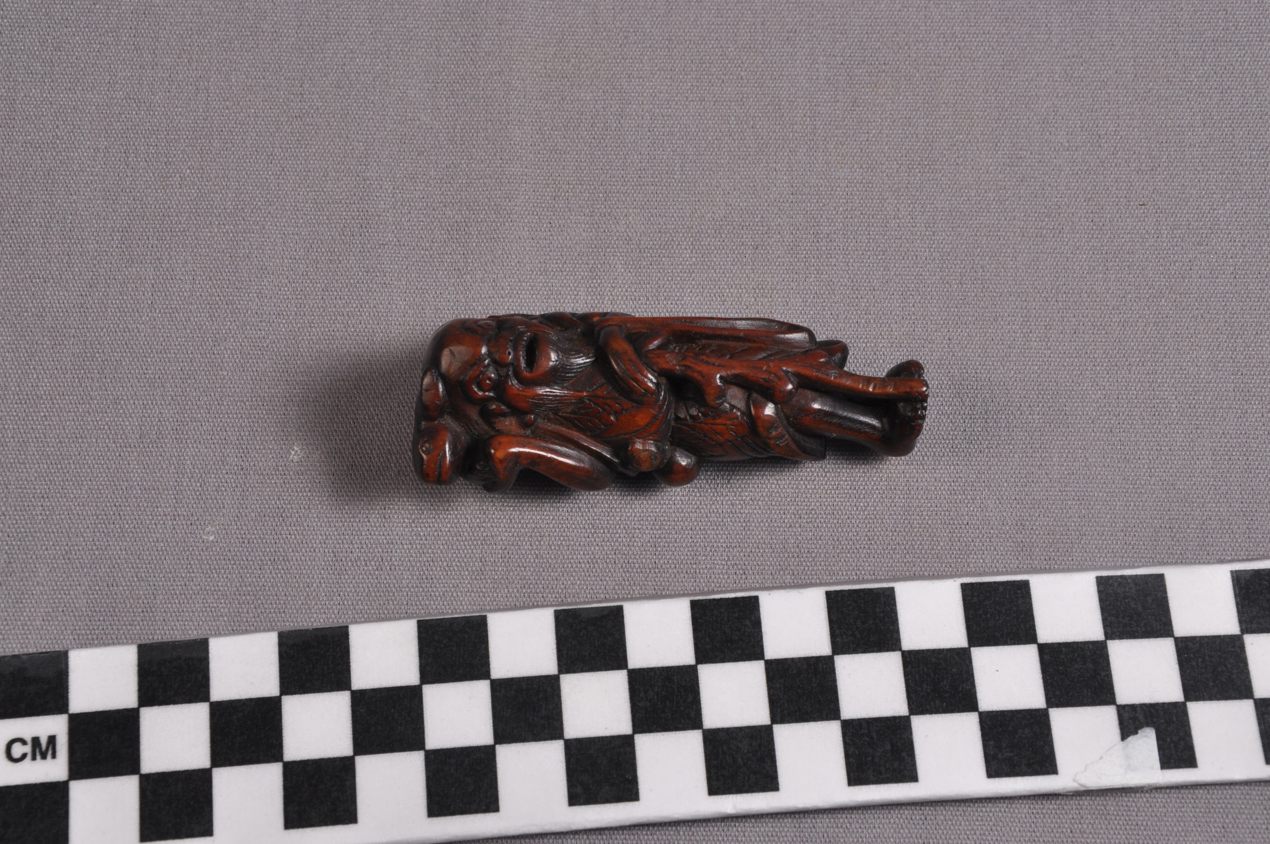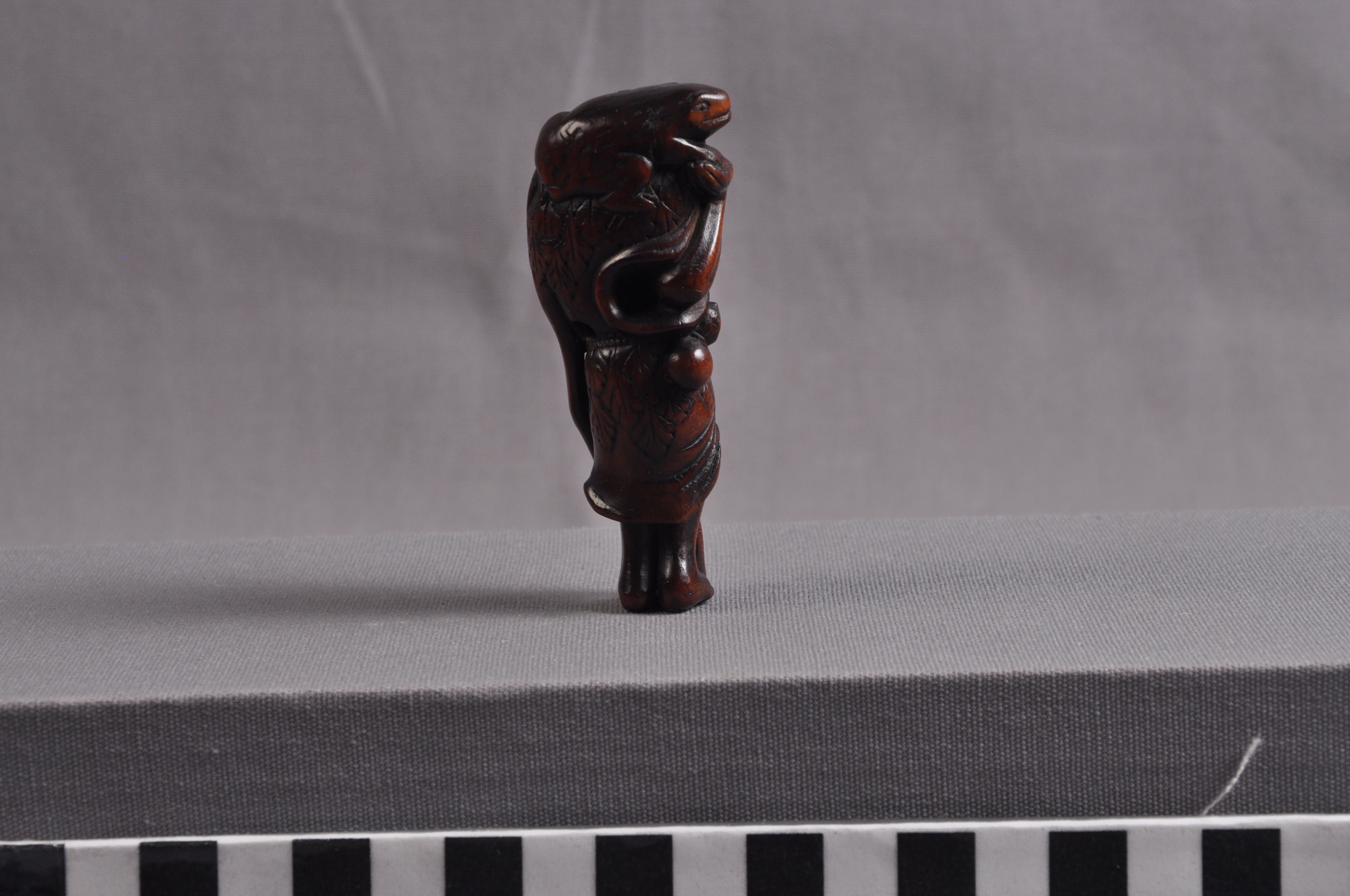 This is a netsuke of Gama Sennin with a three-legged toad. Sennin are Daoist holy men who have reached immortality. Frogs and toads are significant in East Asian culture as symbols of healing and frivolity, with the three-legged variety being particularly auspicious.