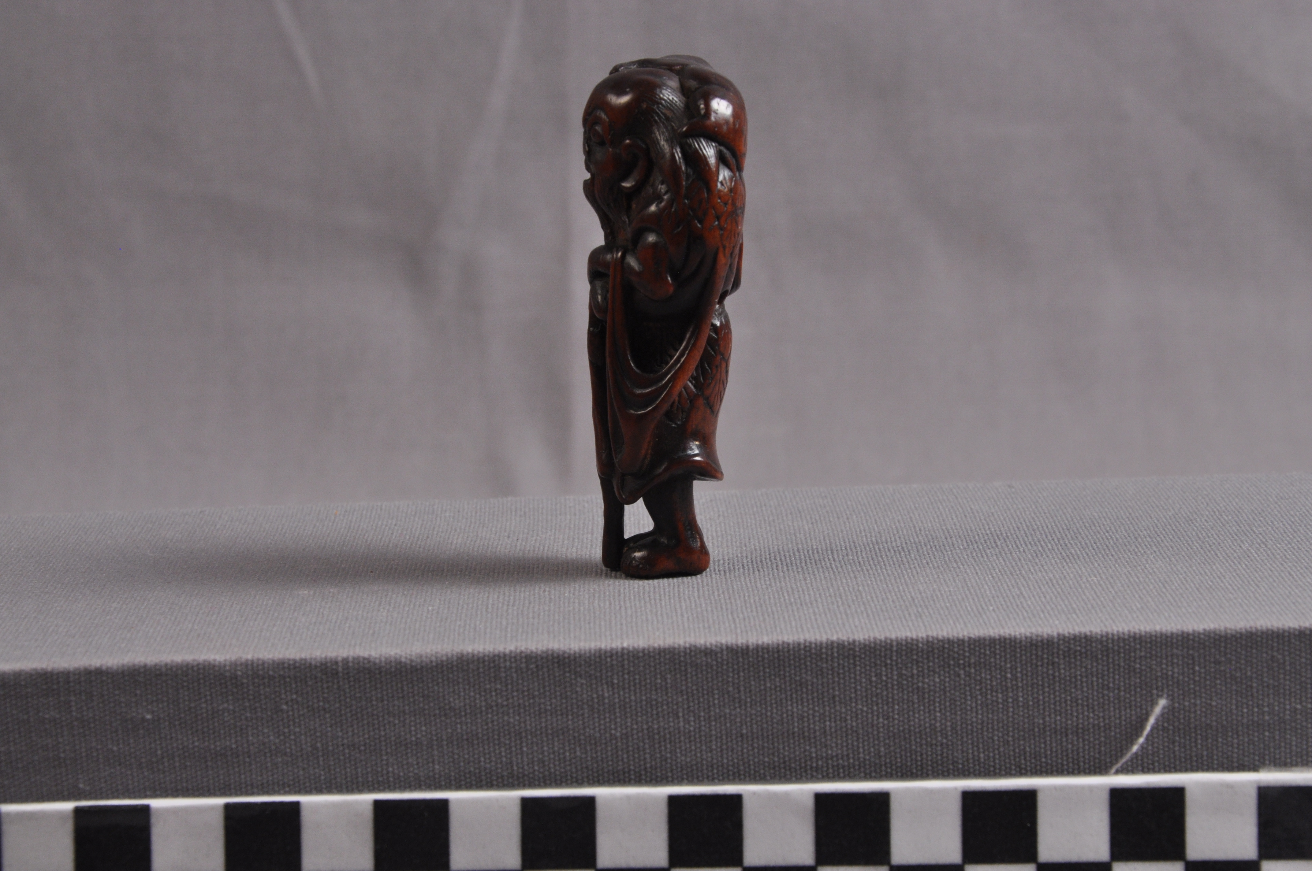 Before the netsuke, a wheel-shaped object called a obiguruma would allow for inros and money purses (kinchaku) to be attached to the obi. Later, a center peg was added to hide the obi's knot, a style which was named manju netsuke after the shape of the New Year rice cake. In general, netsuke measure to be 1” - 2.5” and typically take the form of a miniature three-dimensional carved figure or a flattened and engraved button or box. In the latter half of the seventeenth century, more complicated, figural netsukes became fashionable. It was originally a utilitarian item, but gradually became an ornamental piece worn by all classes of people. It was during the rise in demand of netsuke in the 19th century that the three-dimensional figure form became commonplace for artists. Further specialization of the craft led artists and art schools to use specific carving techniques as well as special materials and subject matter. There also seemed to be a growing prominence of the arts during the Edo period as it was possible for artisans like lacquerers and netsuke carvers to receive the traditionally monastic ranks of hoin (seal of the law), hogen (eye of the law), and hokkyo (bridge of the law).