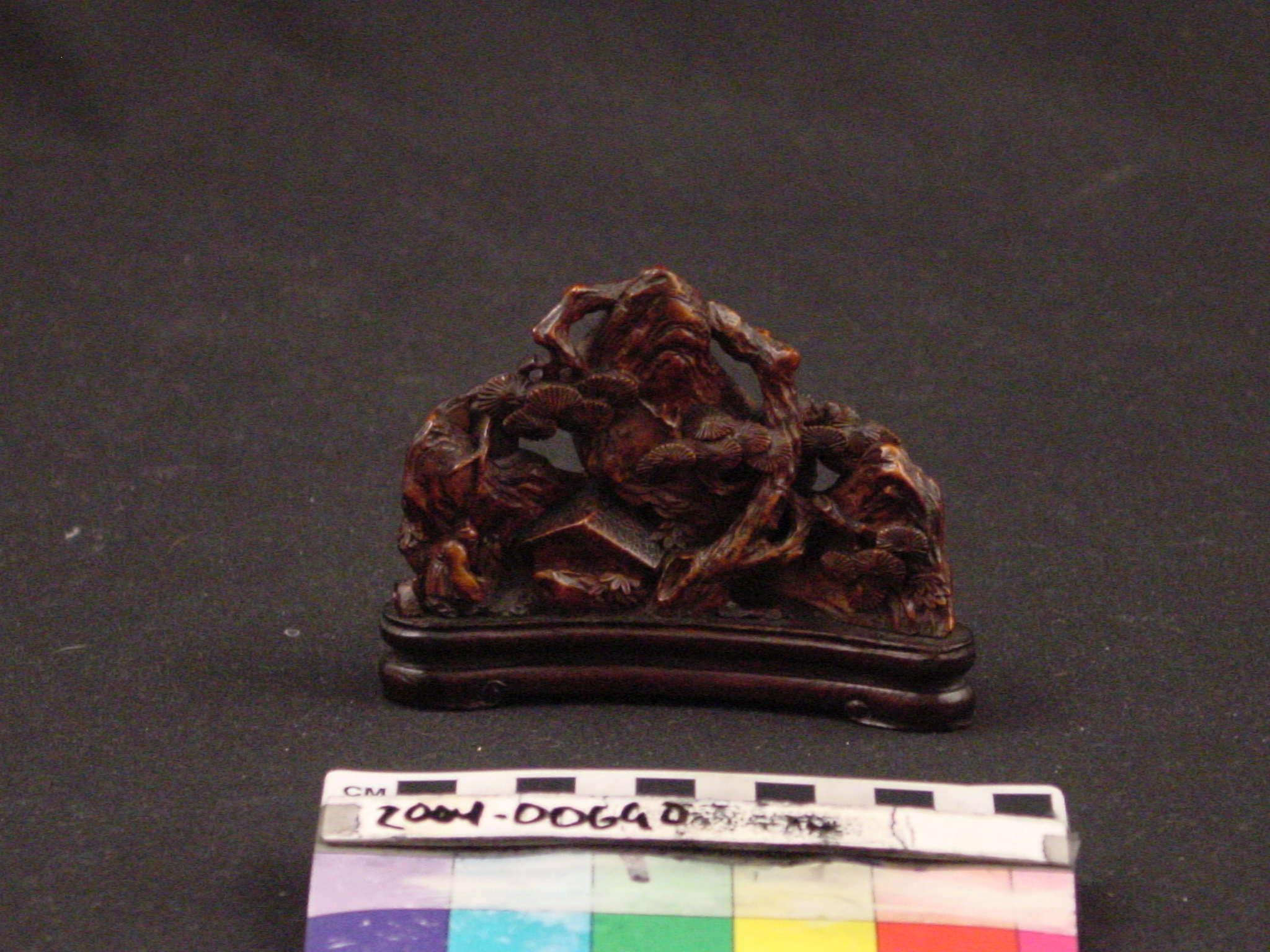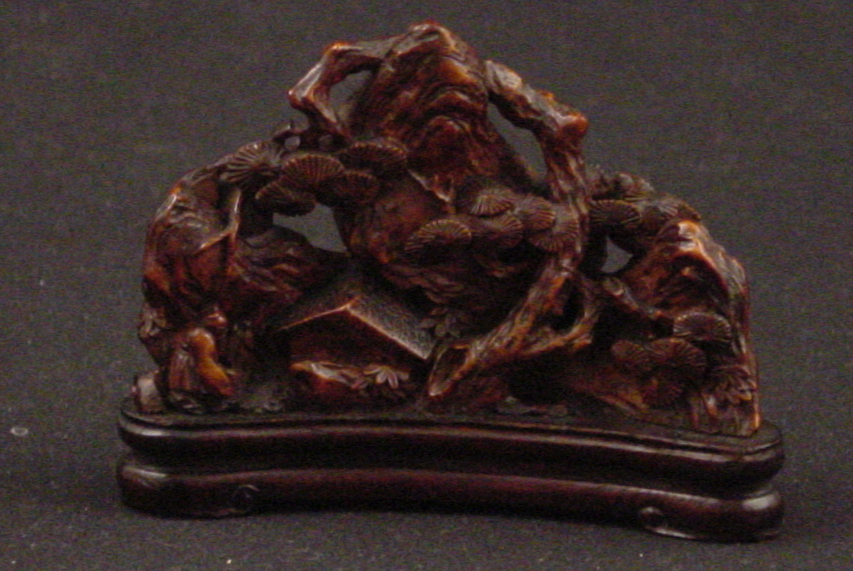 Brush rests were among the coveted items made for the Chinese scholar's desk. This type of brush rest, typically constructed of ivory, is made of bamboo. The concept of the "four treasures" (inkstone, ink, brush, and paper) of a scholar's study became an appreciated facet of interior design during the Song Dynasty (960-1279). Additional desk items which were appreciated for their function and beauty included brush pots, wrist rests, scroll pots, and desk screens. This item is carved with mountain peaks, trees, a house and figures. In addition, its bamboo structure is symbollic of longevity as bamboo stalks are capable of flourishing throughout winter.