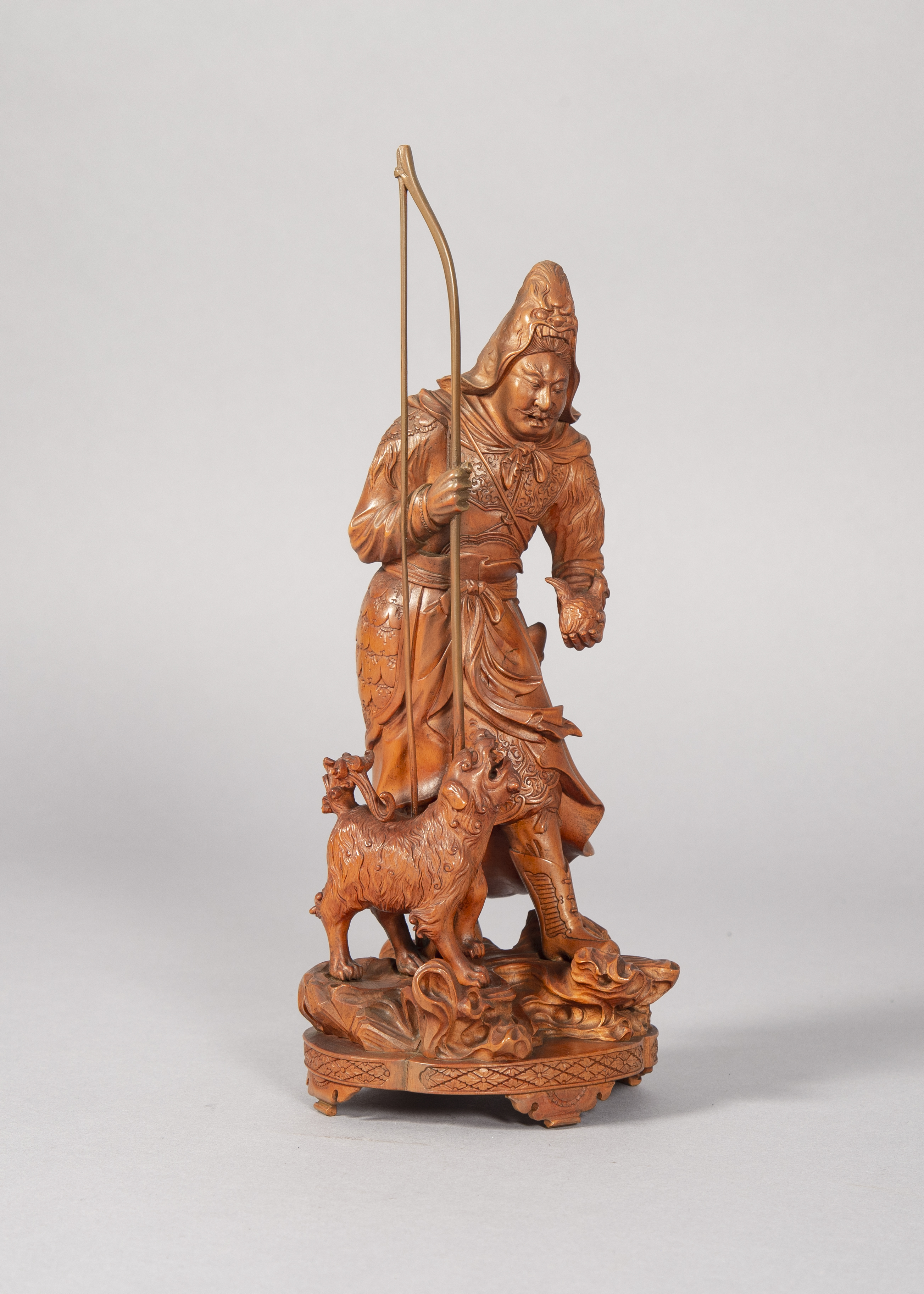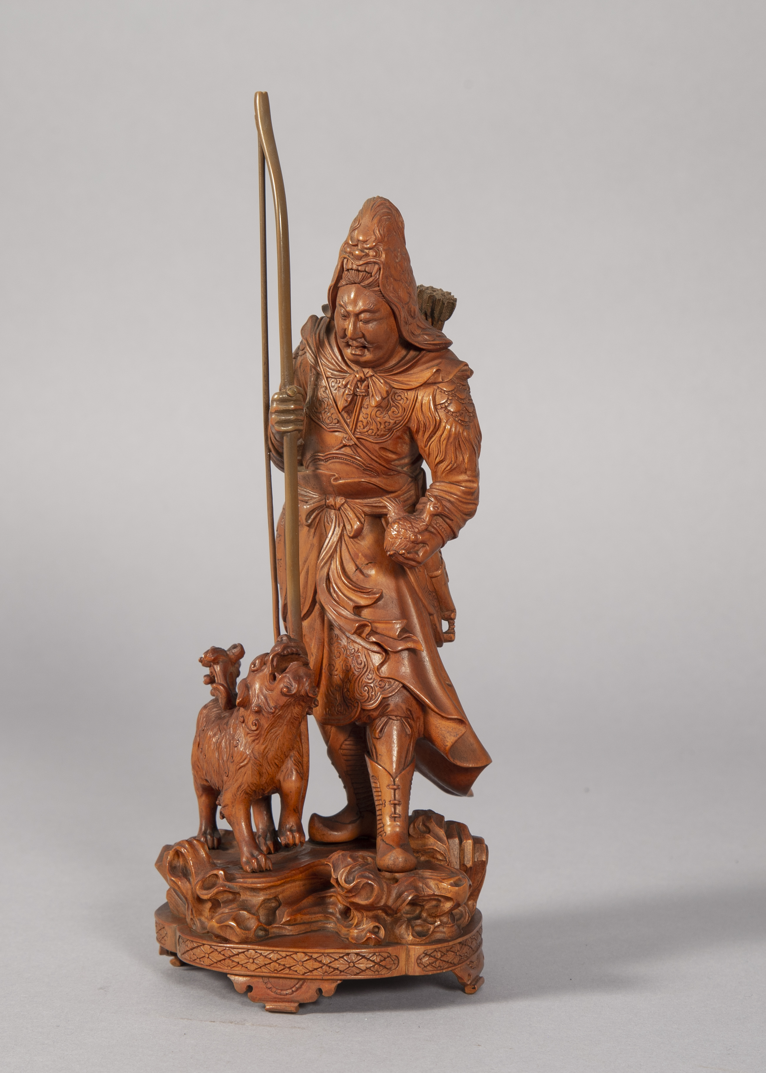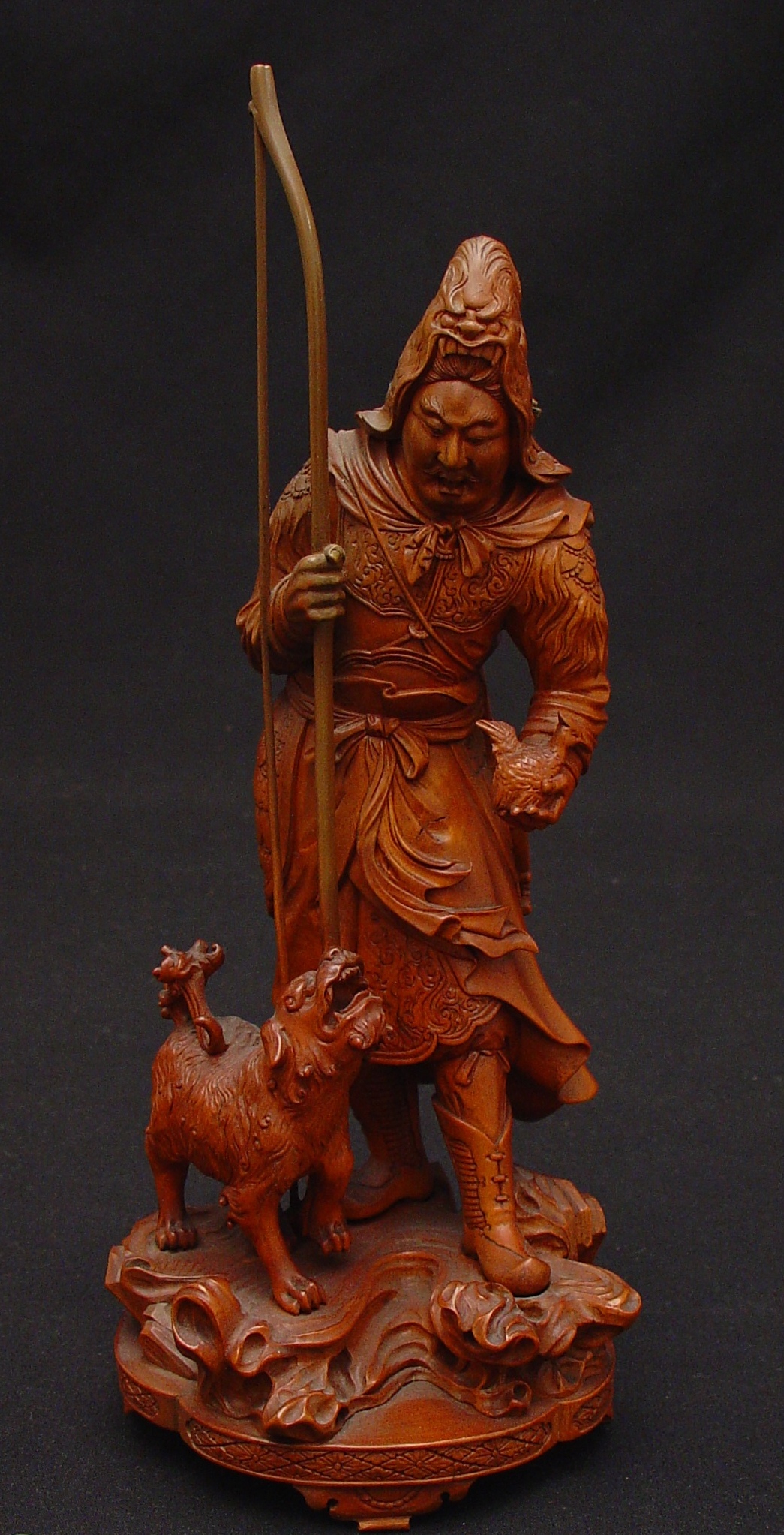 This is a Japanese okimono of an archer and dog seemingly in the process of hunting a bird.