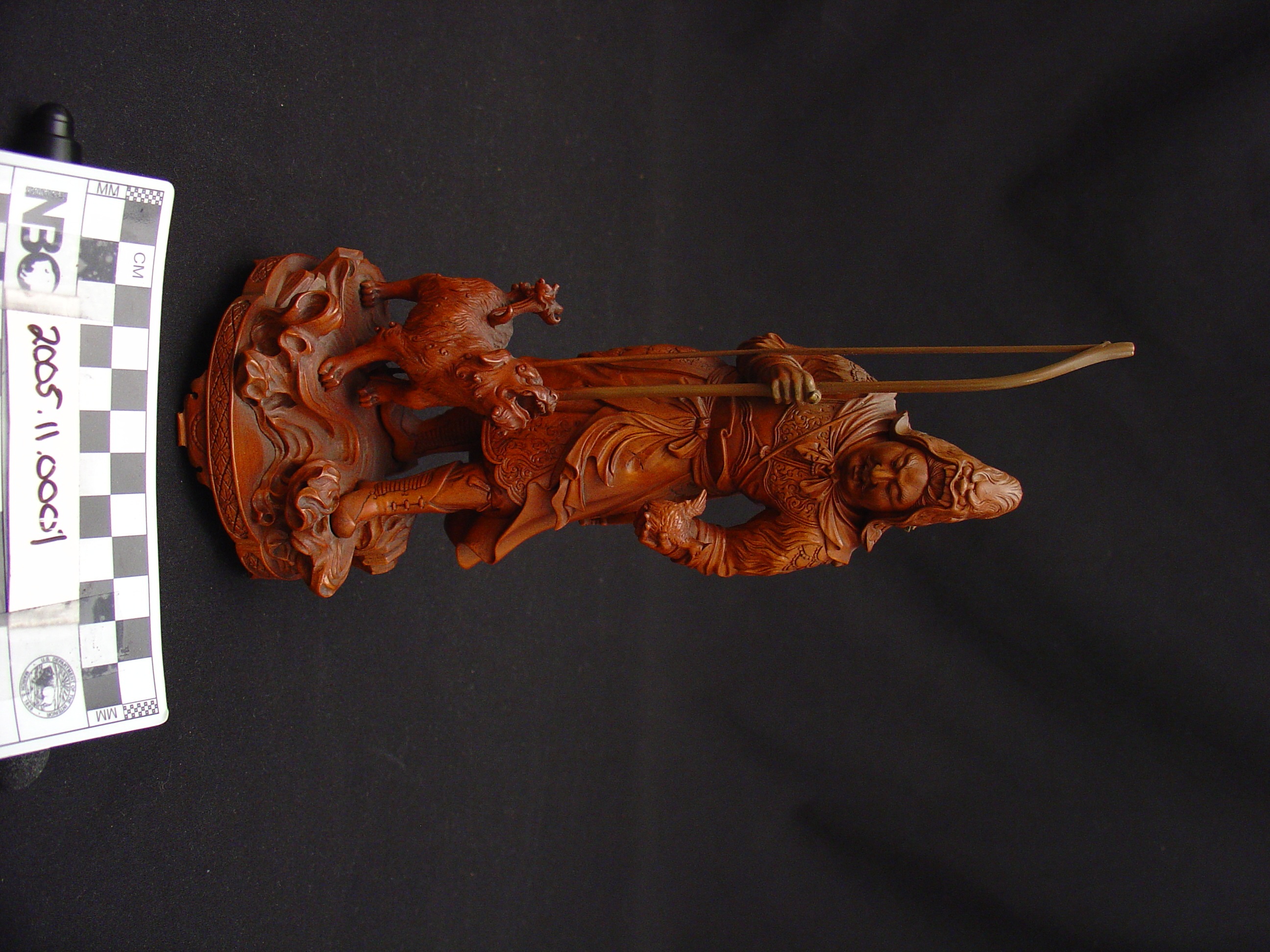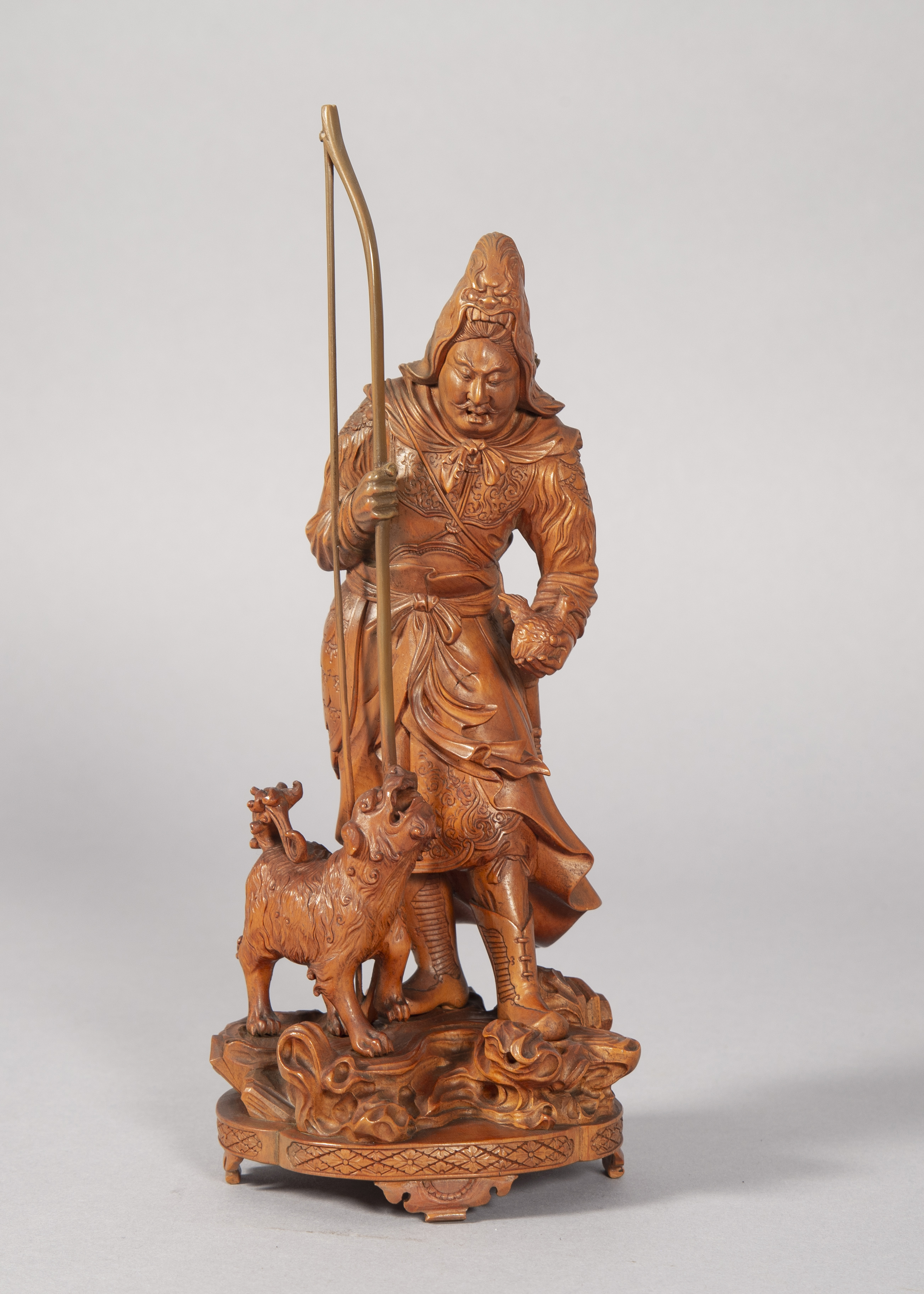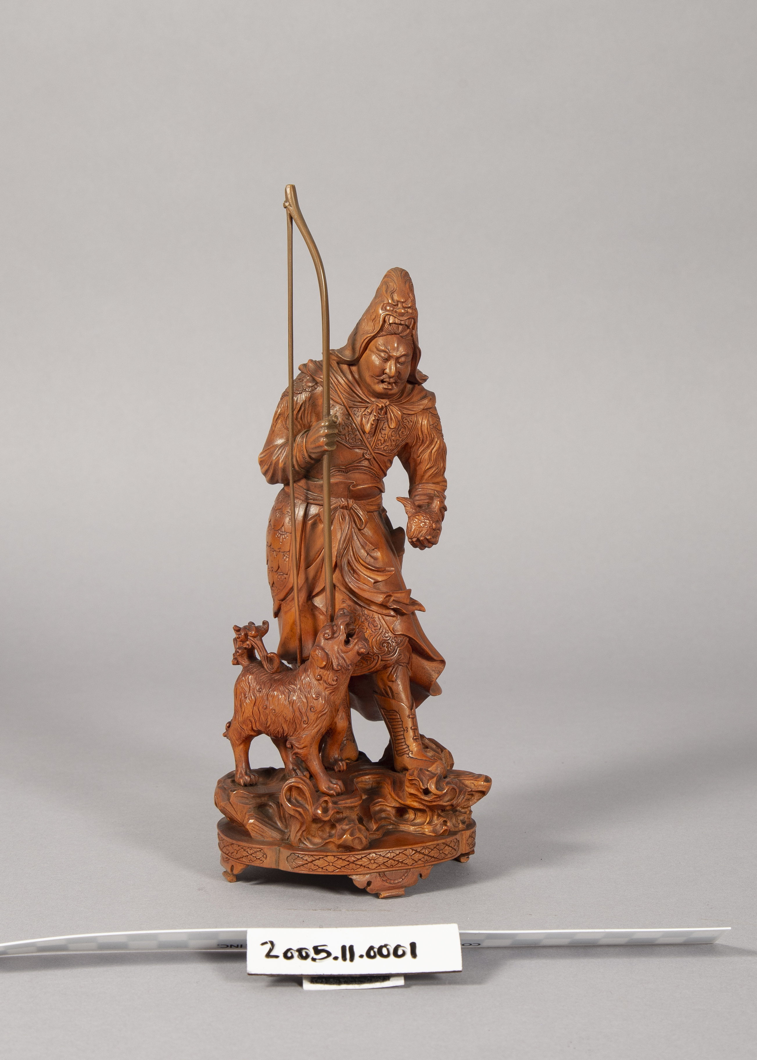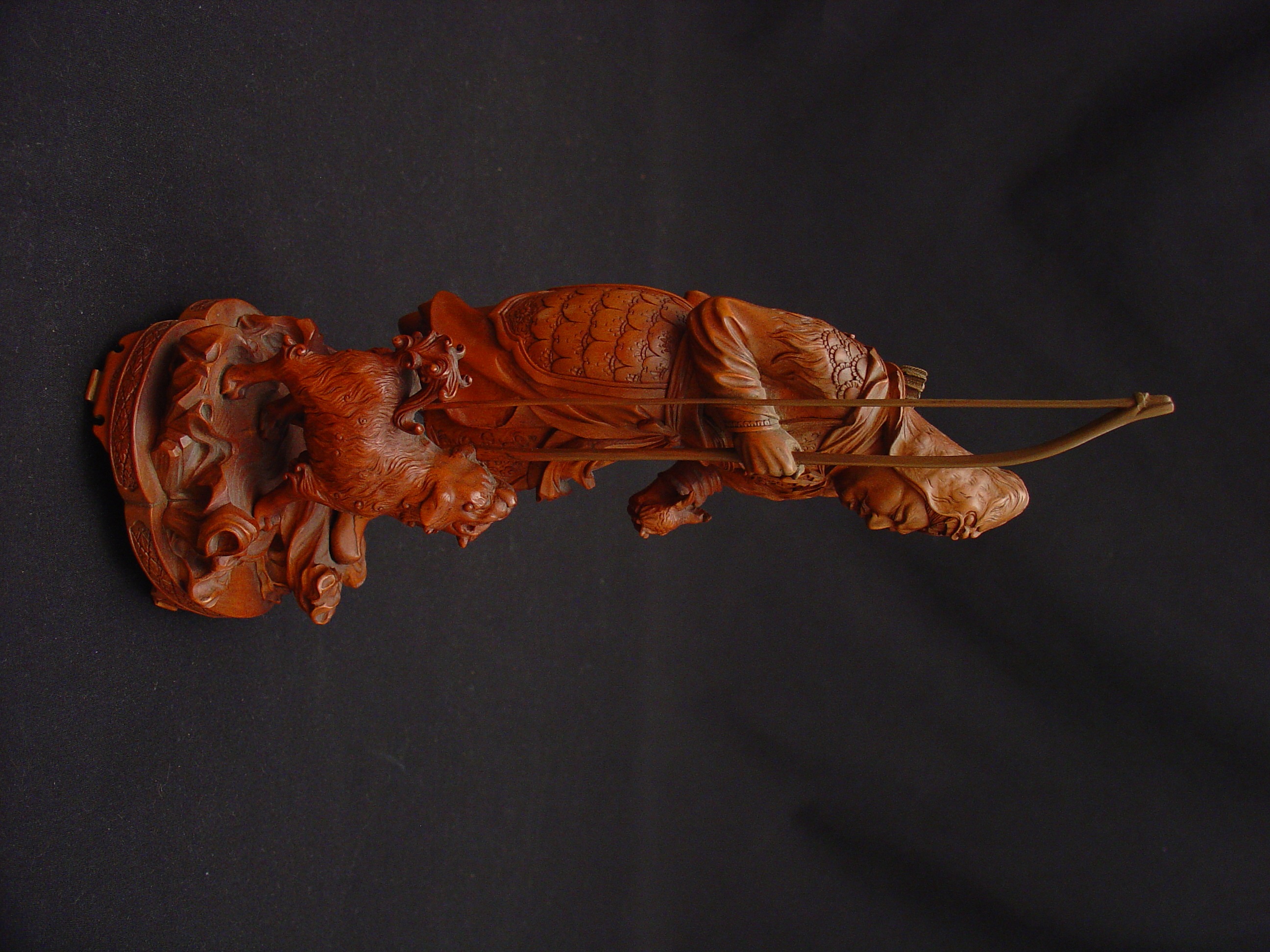 This is a Japanese okimono of an archer and dog seemingly in the process of hunting a bird.