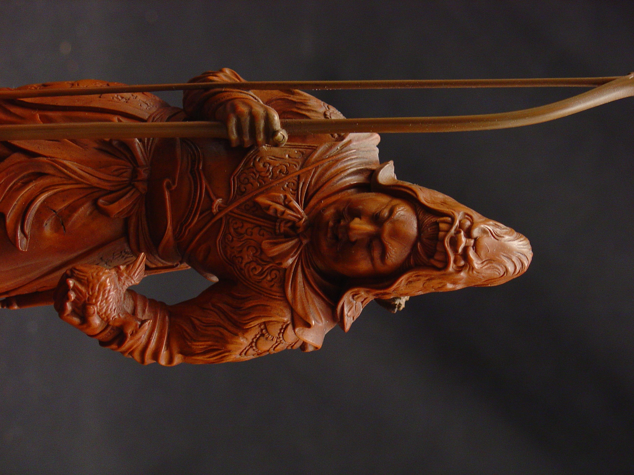 The okimono, meaning “object of display,” is a Japanese model or free-standing figure that developed from the smaller netsukes, which were clothing fasteners that appeared as three-dimensional carved figures or flattened and engraved buttons or boxes. As okimono were ornamental pieces, they were frequent exports for western markets. They took on various sizes and were typically carved from wood or ivory.