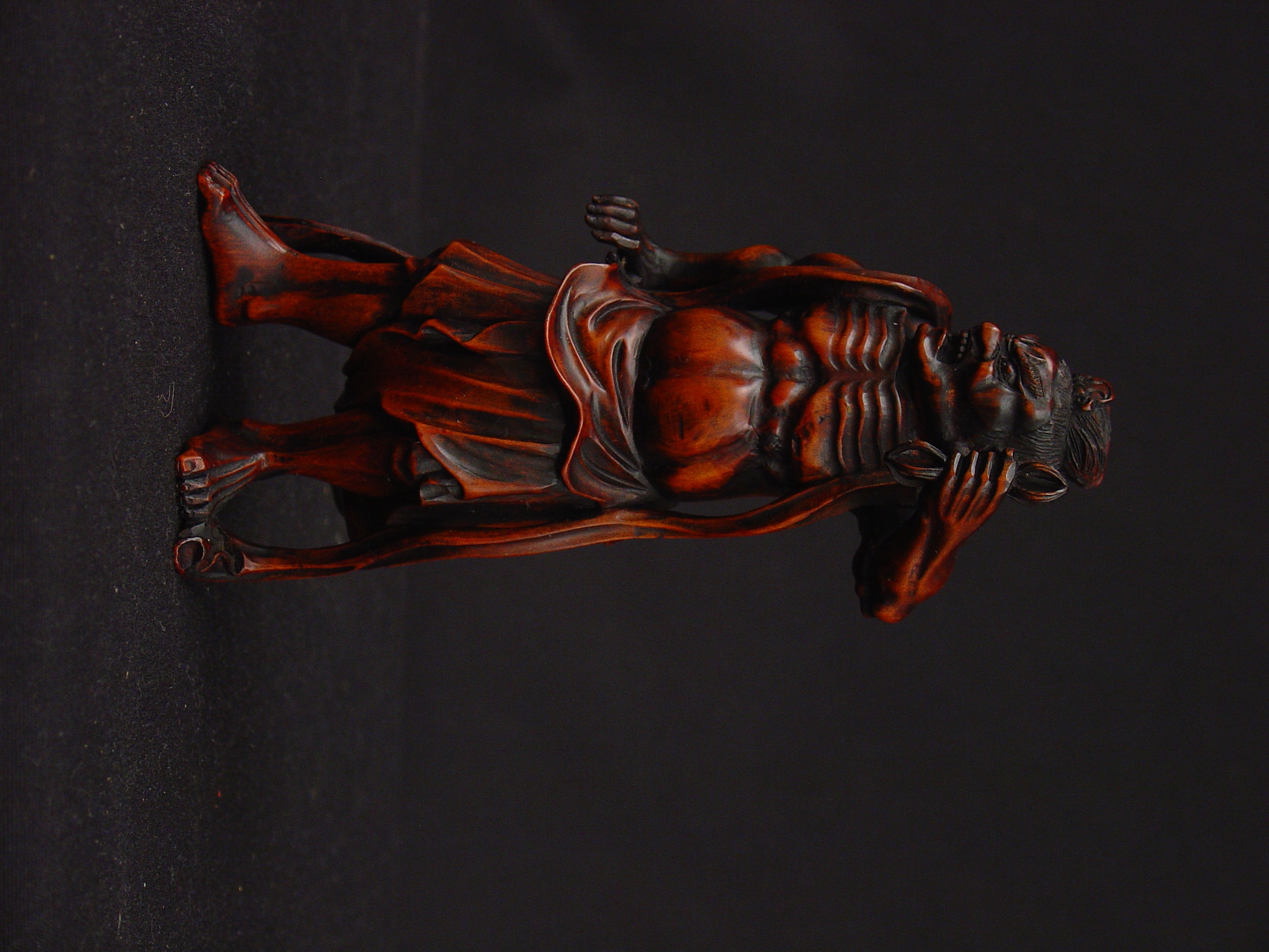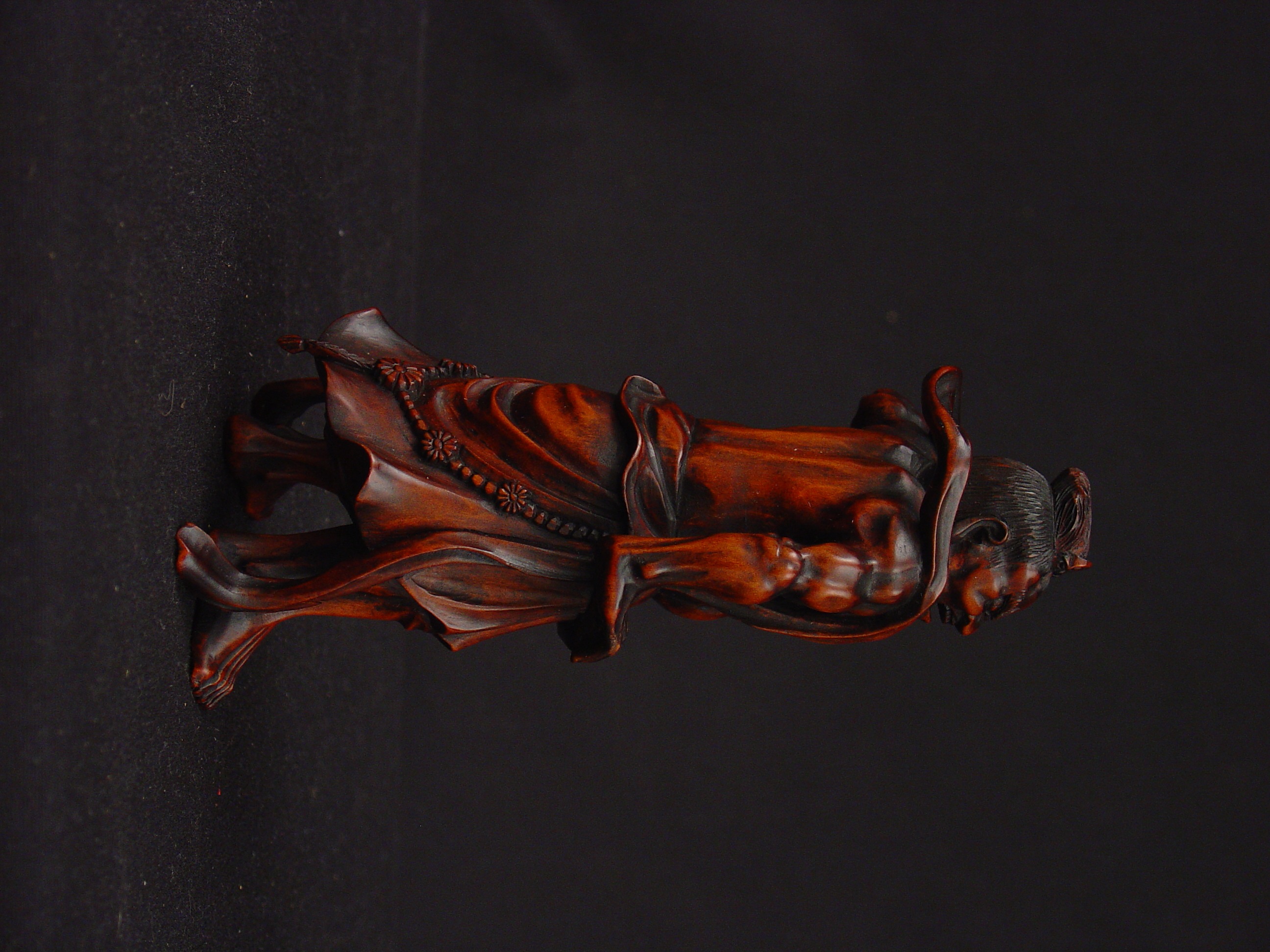 The okimono, meaning “object of display,” is a Japanese model or free-standing figure that developed from the smaller netsukes, which were clothing fasteners that appeared as three-dimensional carved figures or flattened and engraved buttons or boxes. As okimono were ornamental pieces, they were frequent exports for western markets. They took on various sizes and were typically carved from wood or ivory.