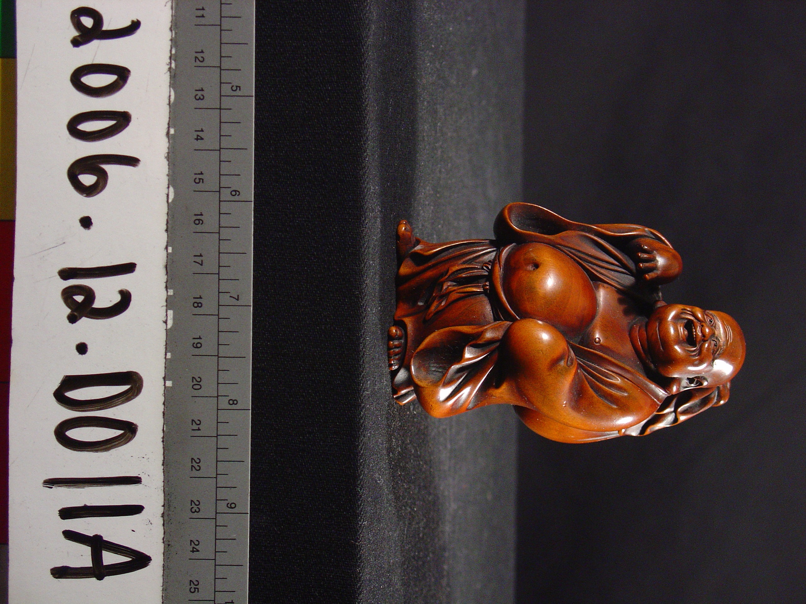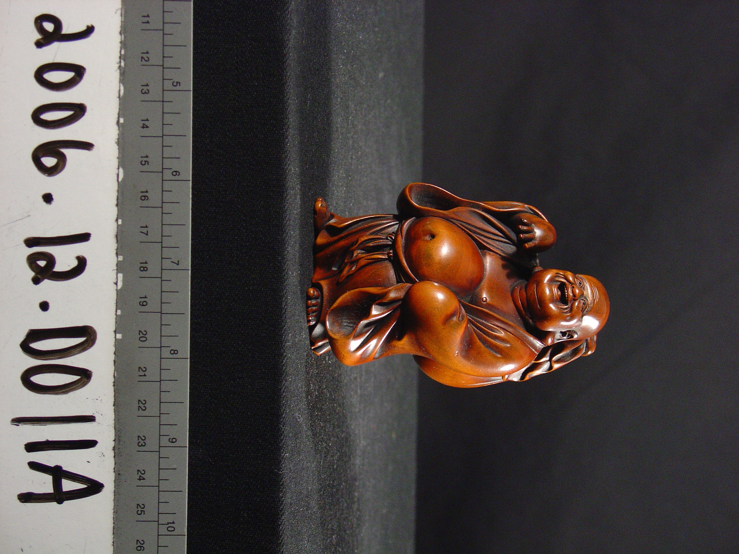 This is a Japanese okimono of Hotei, one of the Shichi Fukujin (Seven Gods of Good Luck). He is often depicted as a deity with a protruding stomach that carries a large sack and a staff. Hotei is also known as "the laughing Buddha" given that he has overcome the cares and anxieties which burden people. In Buddhist belief, he is regarded as a saintly figure with an unconventional approach to traditional Buddhist ideas.