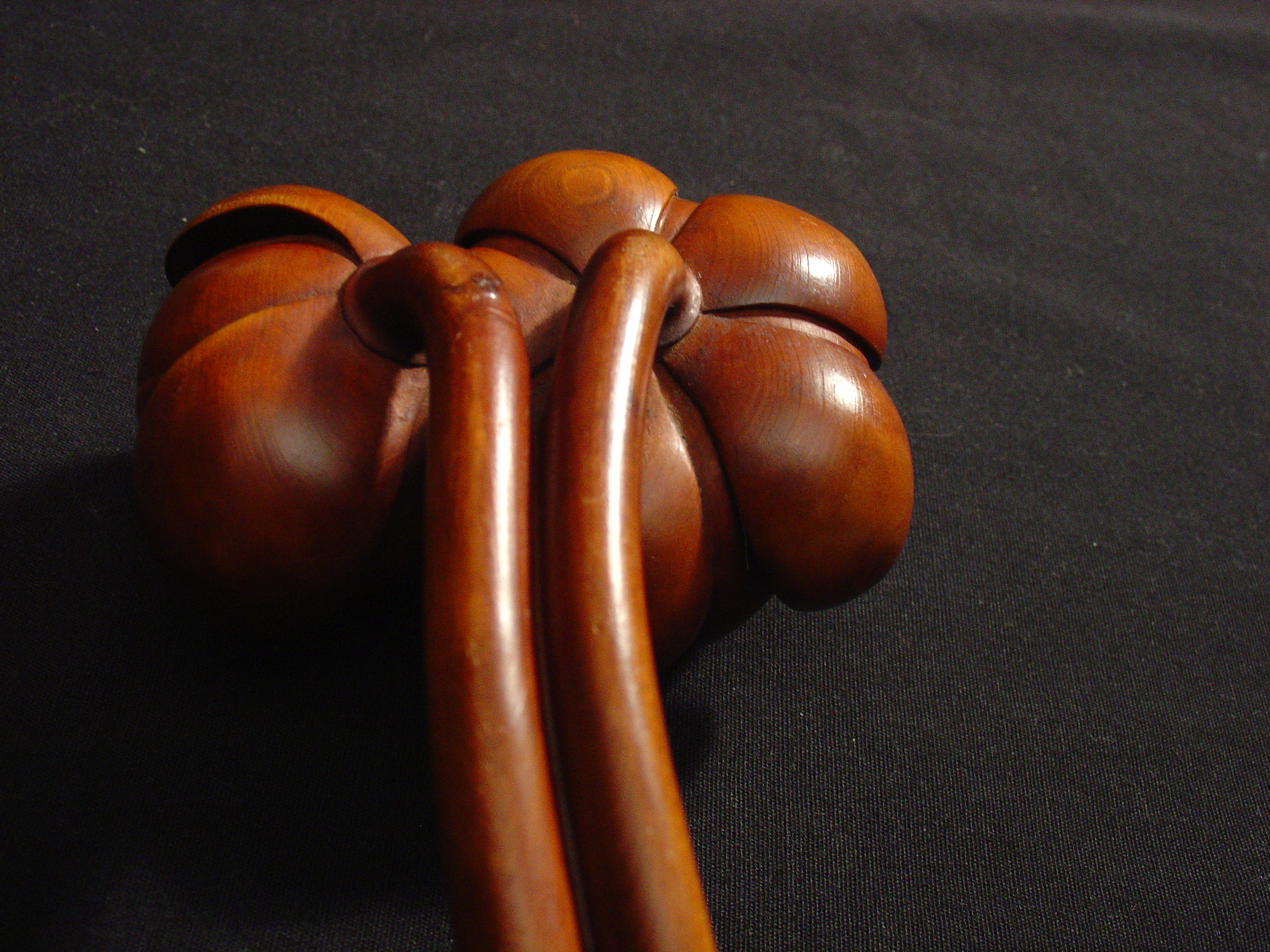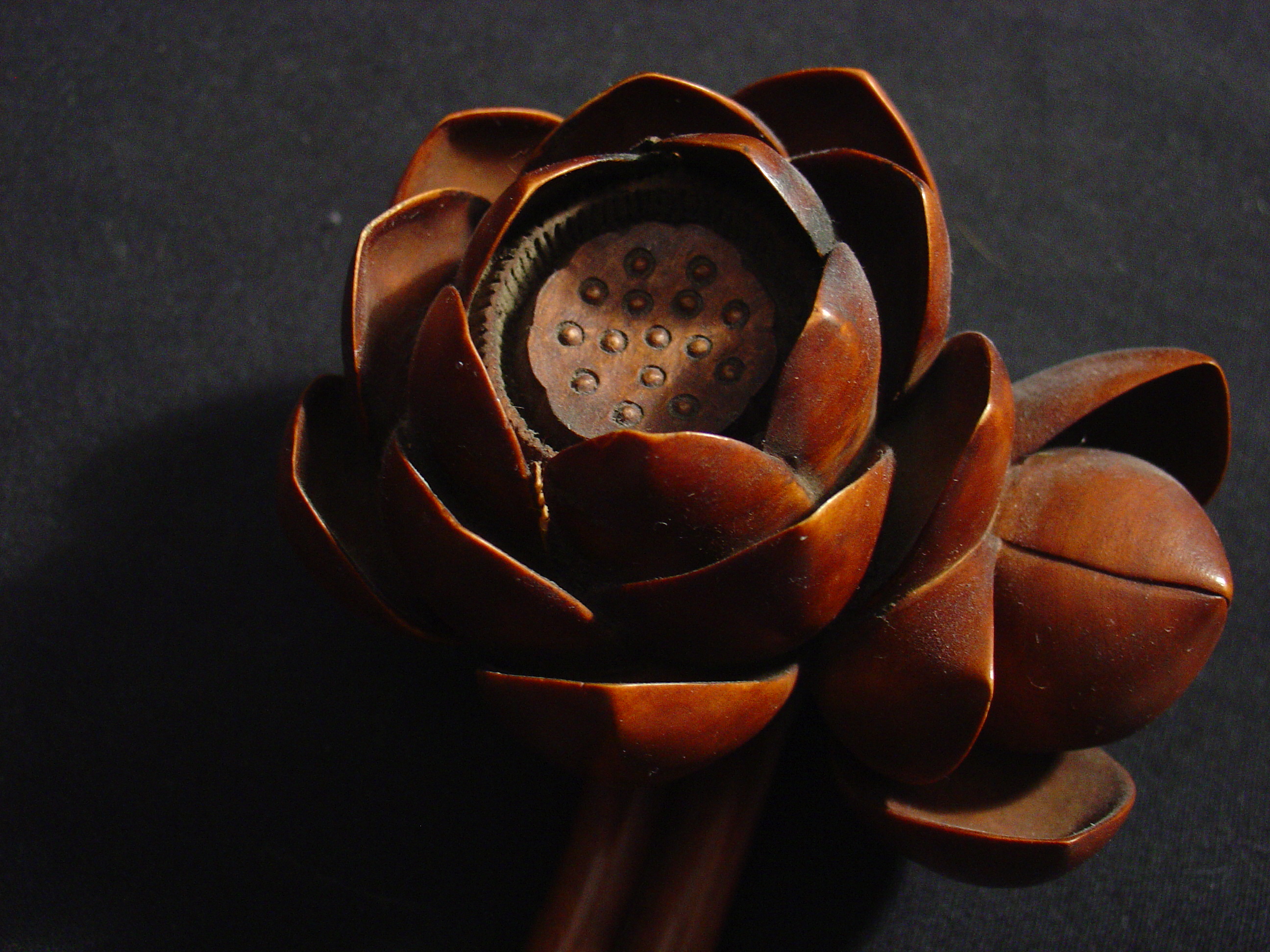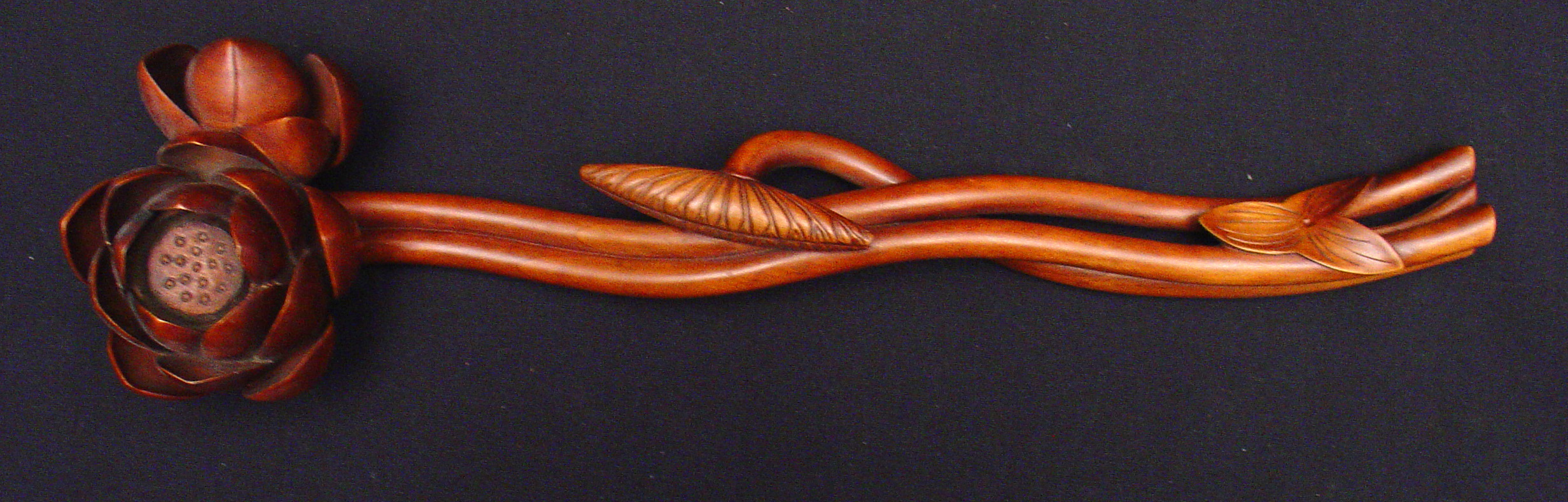 | Description | "A Japanese boxwood ruyi (scepter) with a network of seeds within the open lotus at the terminal of a long stalk, a second stalk with a closed lotus, and a third furled lotus emanating from a 3rd lower stalk, the stalks gently and gracefully curved, the lower section of the stalks with another leaf. Dating from the late Edo period, this rare 13.5” long scepter has a fitted wood storage box. The ruyi is termed the Plant of Long Life. It is a species of fungus, likely Poly porus lusidus, which grows at the roots of trees. When dried it becomes durable, and thus is considered as an emblem of long life and immortality. The ruyi is also a symbol of Buddha and his doctrines. It is used for the Sanskrit riddhi and riddhi-pada, in the sense of magical powers. The ruyi is also used for guarding against the unexpected, as well as for self defense and for pointing the way. In Buddhism it also represents the mystic Lotus, which is sometimes carved on the superior end." - Bernie McManus, Appraiser, Woodbury House, Connecticut, 08/29/2006 |