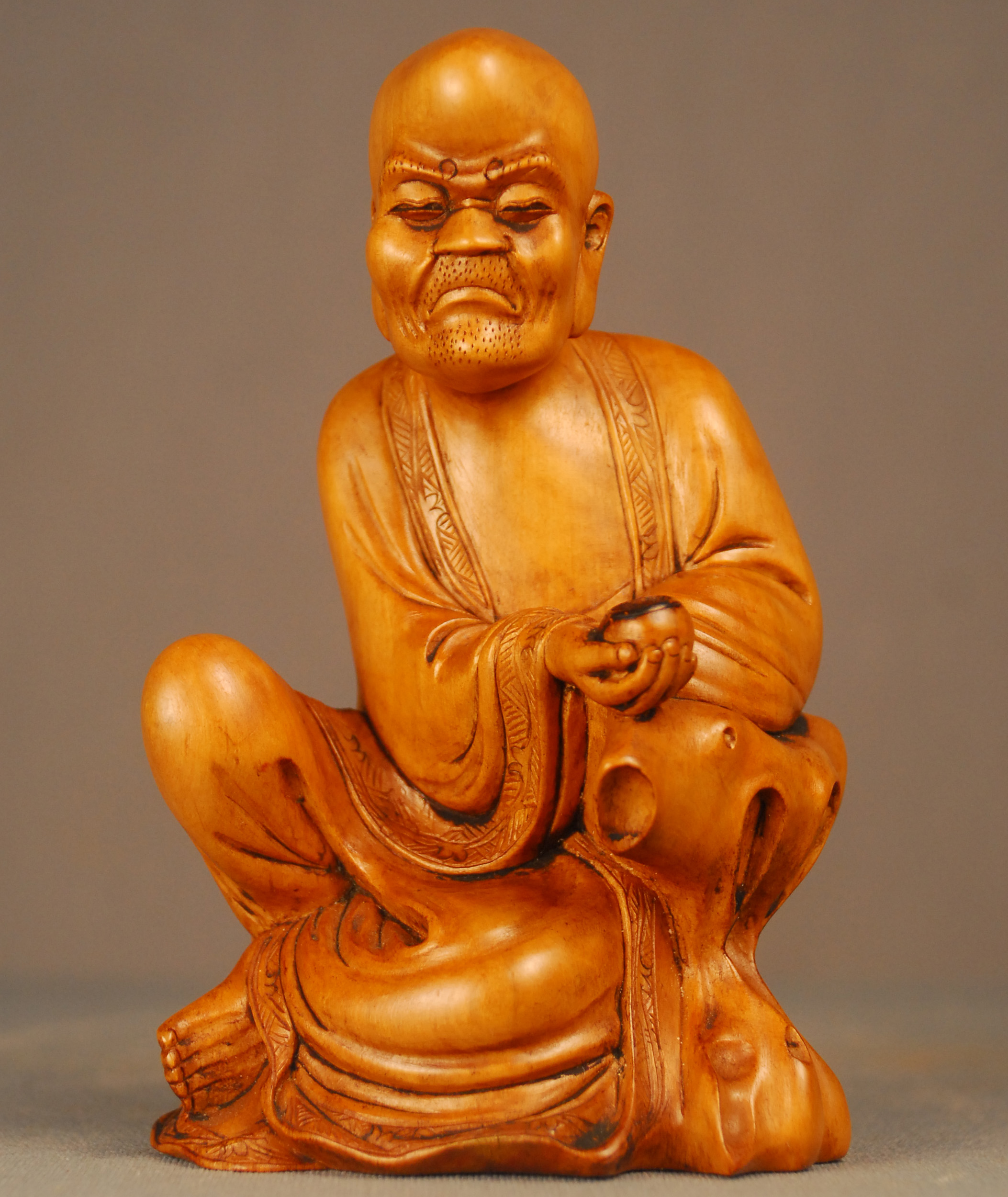 This is a Chinese lacquer carving of Nagasena, an enlightened Buddhist disciple (Lohan) whose answers to the questions posed by Menander I, a king that administered a large territory in the northwestern region of the Indian subcontinent, are recorded in the Milinda Panha.