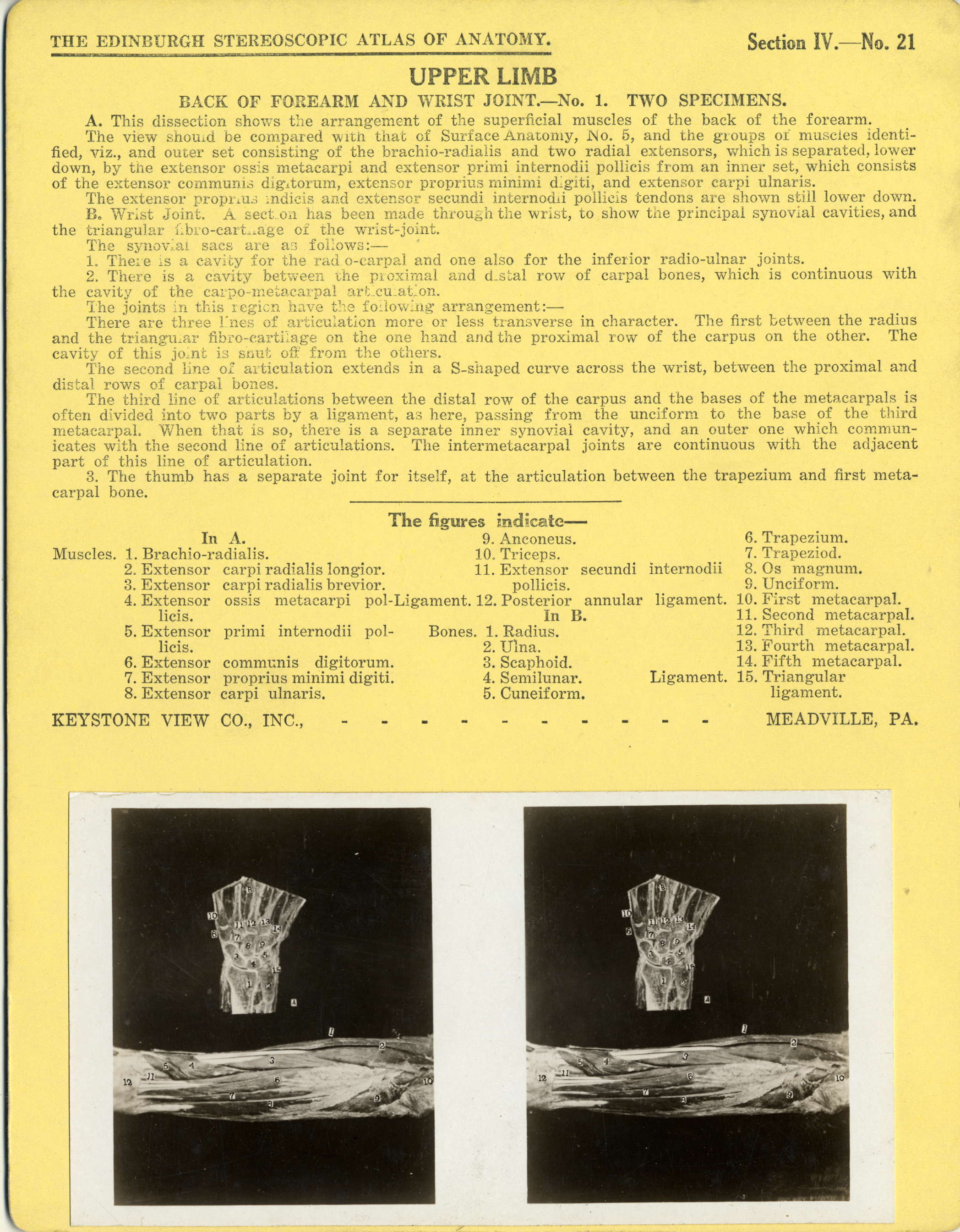 | Artifact Identification | Stereoscope Cards, Edinburgh Anatomy: Mediastina, Lungs, Upper Limb - Upper Limb, Back of Forearm and Wrist Joint - No. 1. (2009.10.0002X) |