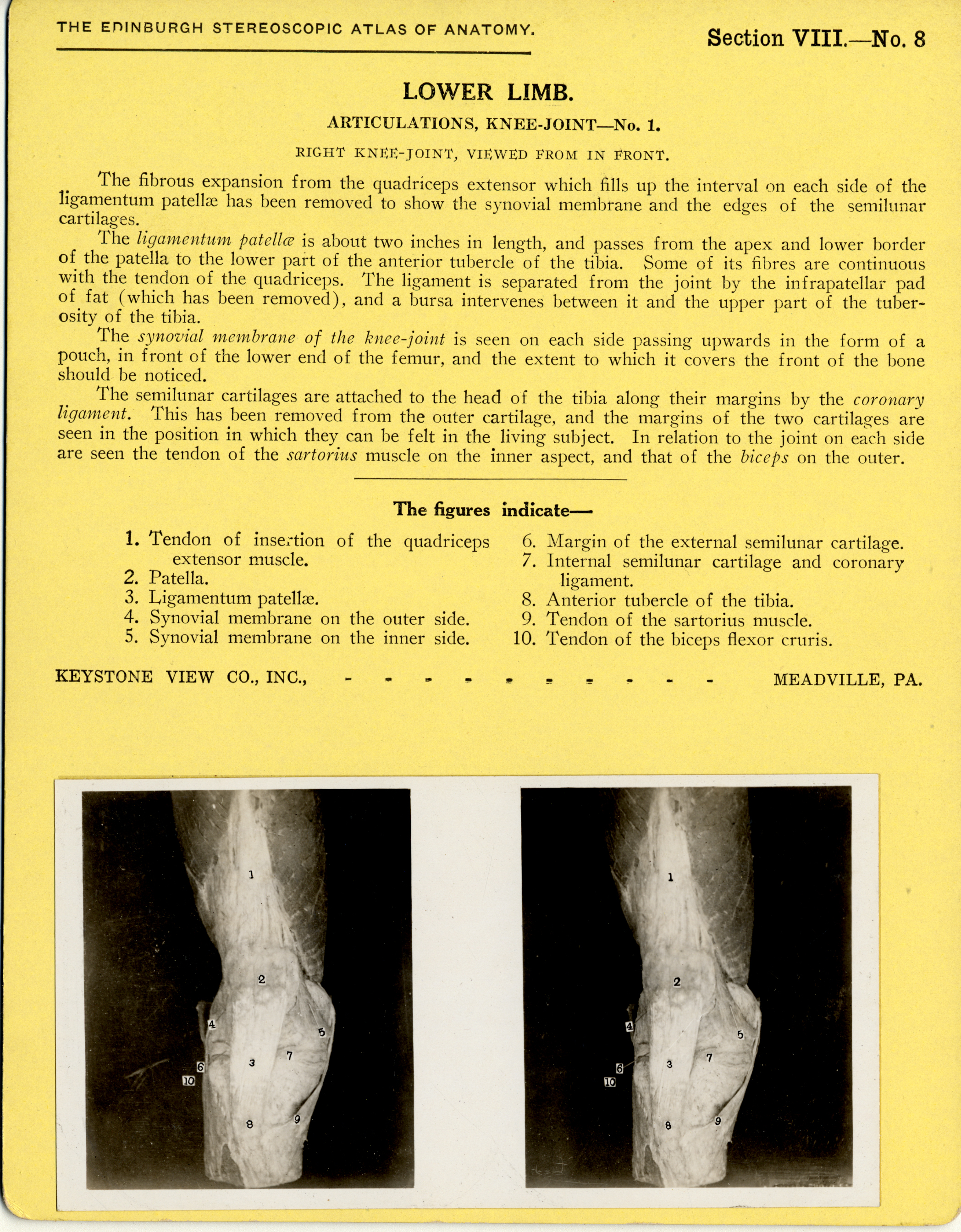| Artifact Identification | Stereoscope Cards, Edinburgh Anatomy: Lower Limb Continued - Lower Limb, Articulations, Knee-Joint - No. 1. (2009.10.0003K) |