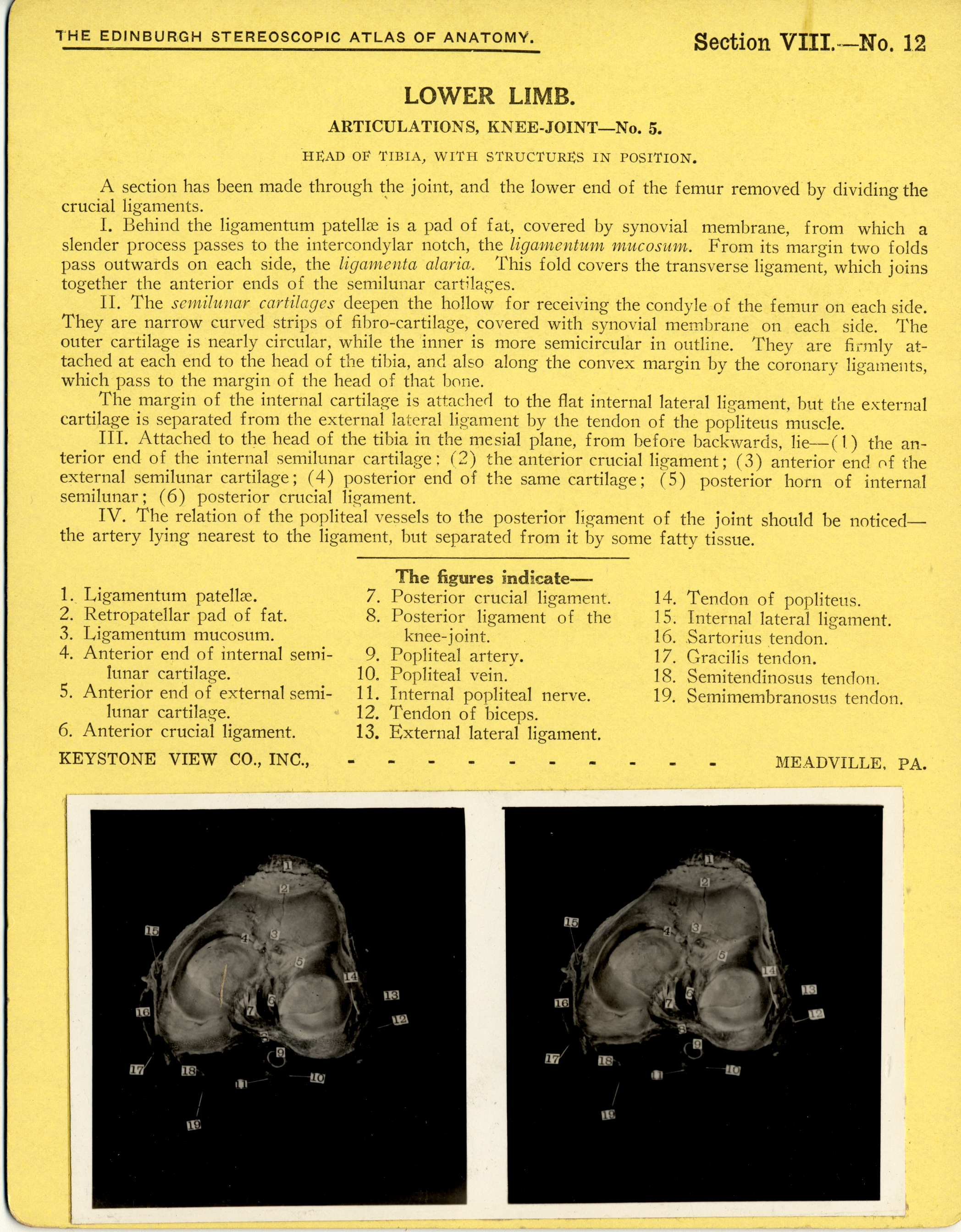 | Artifact Identification | Stereoscope Cards, Edinburgh Anatomy: Lower Limb Continued - Lower Limb, Articulations, Knee-Joint - No. 5. (2009.10.0003O) |