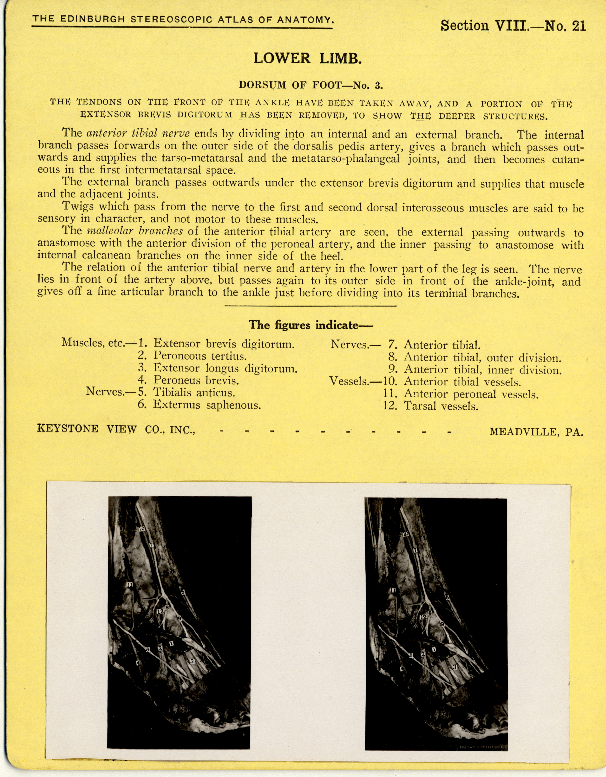 | Artifact Identification | Stereoscope Cards, Edinburgh Anatomy: Lower Limb Continued - Lower Limb, Dorsum of Foot - No. 3. (2009.10.0003X) |