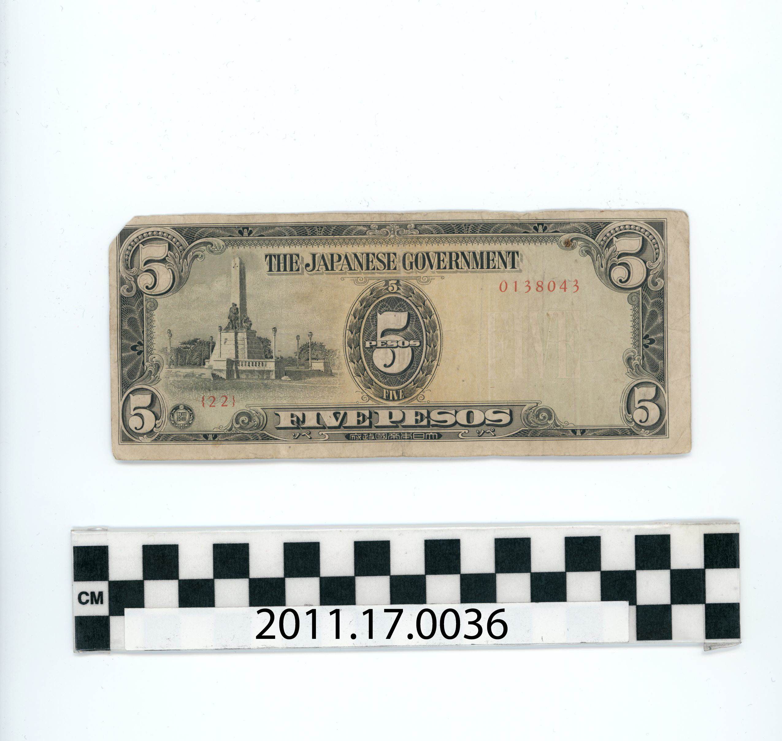 | Artifact Identification | Bank Note: Japanese Government-Issued Philippine Occupation Fiat, 5 Pesos (2011.17.0036) |