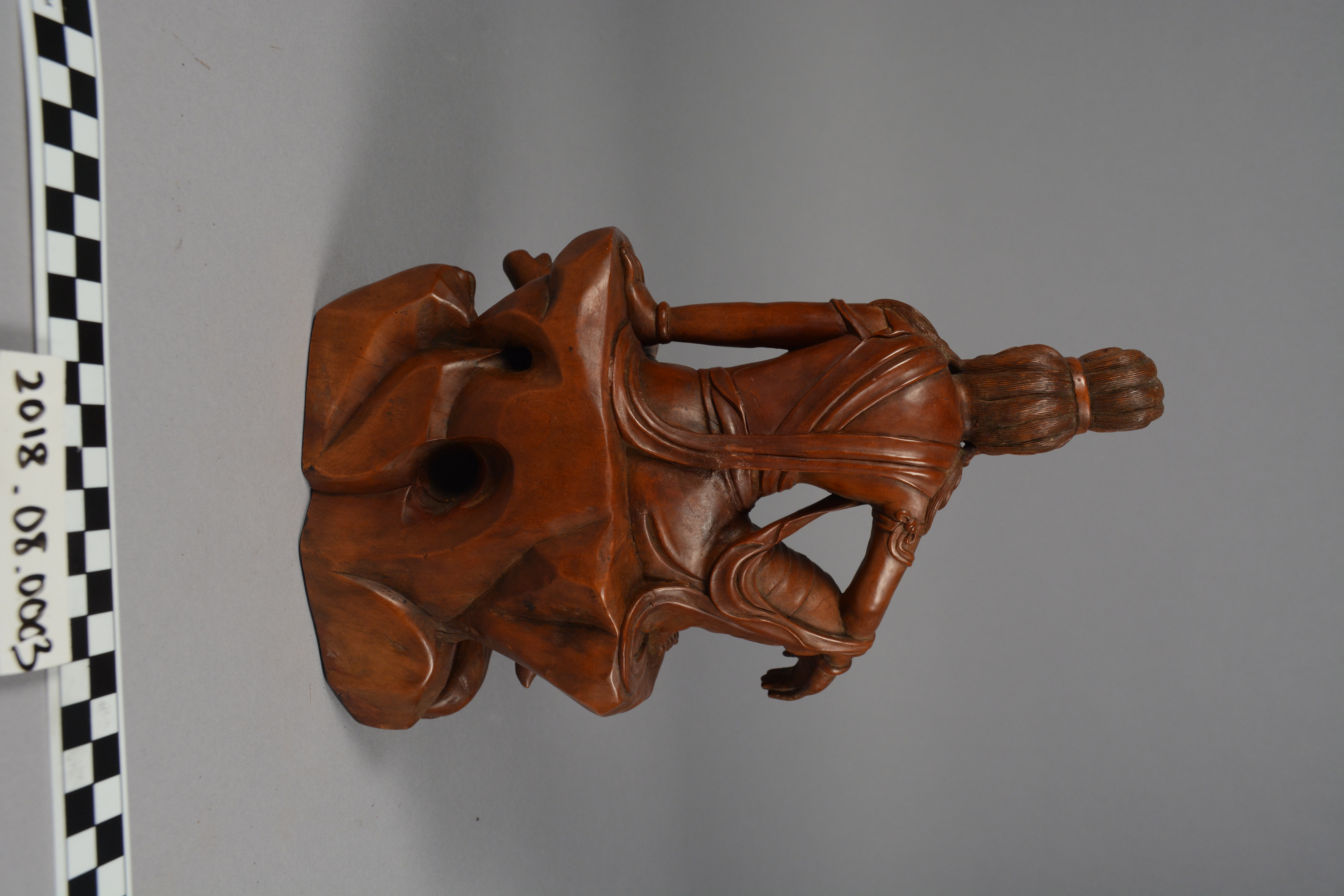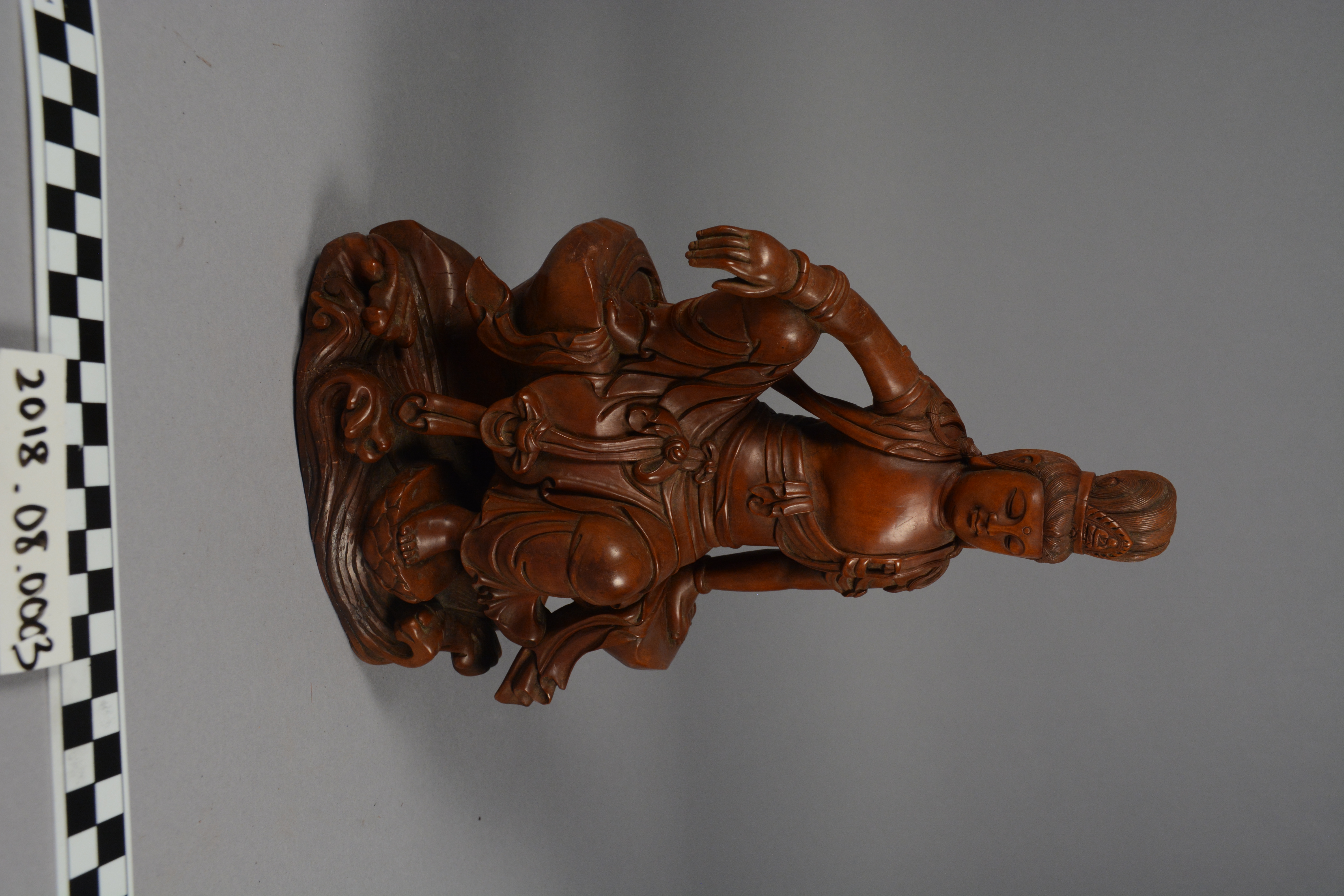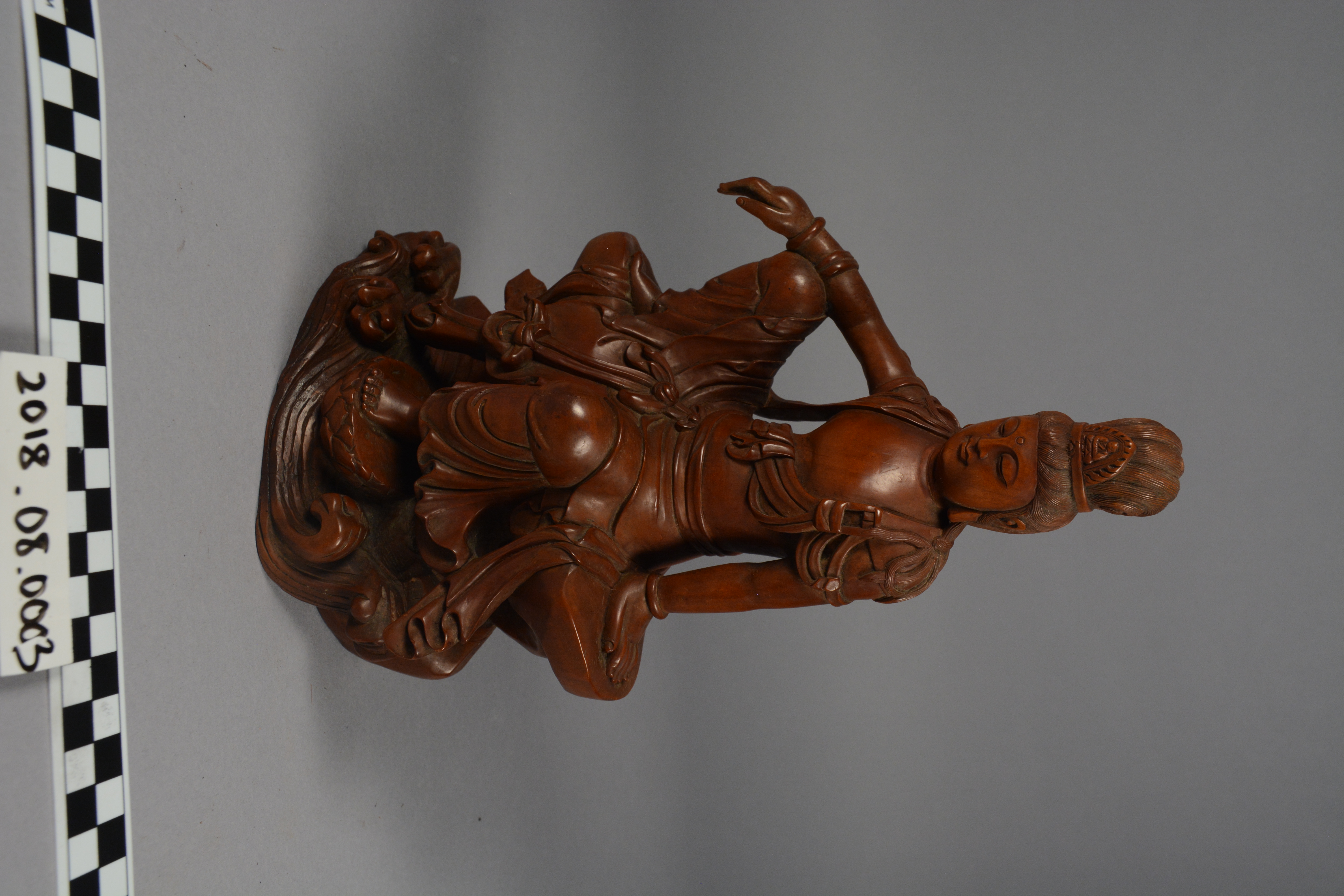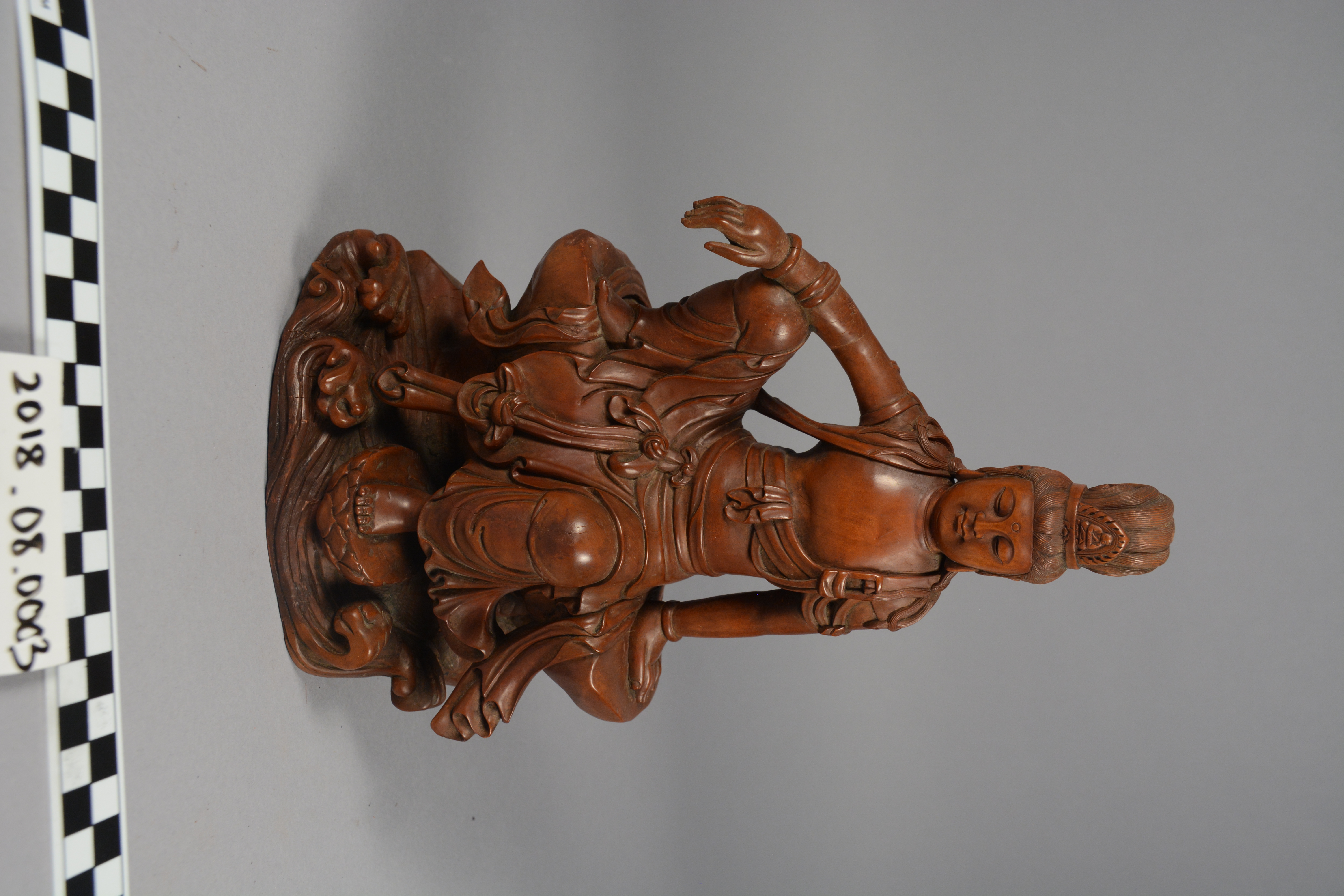 This is a Chinese boxwood carving of Guanyin (Kuan Yin), the Chinese name for the Bodhisattva Avalokitesvara. Though male in India, Guanyin has been represented as female in East and Southeast Asia, a portrayal made common in China after the Song Dynasty (960-1279). In this depiction, she is worshipped for her mercy and compassion as well as her power to help women who want to have children.