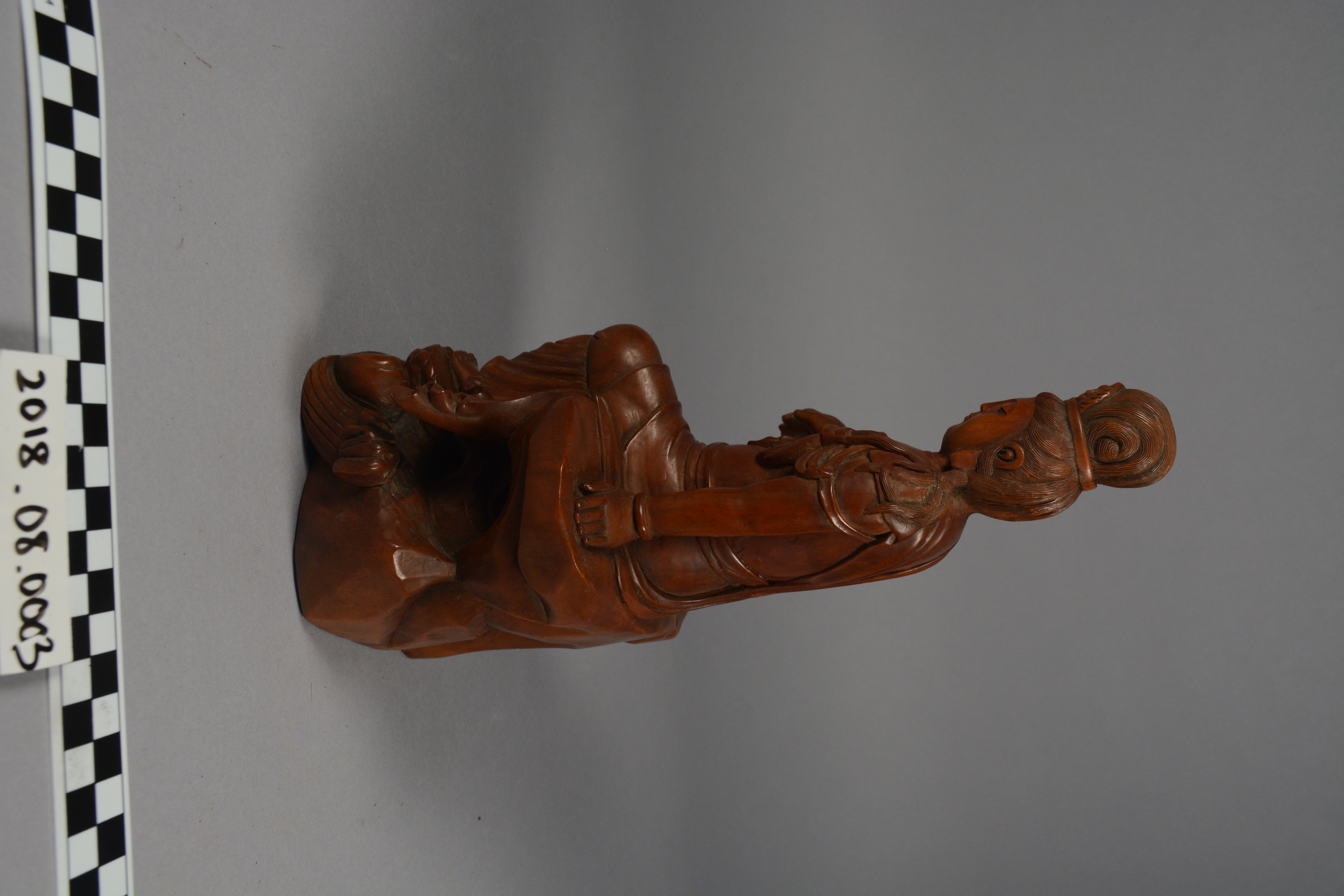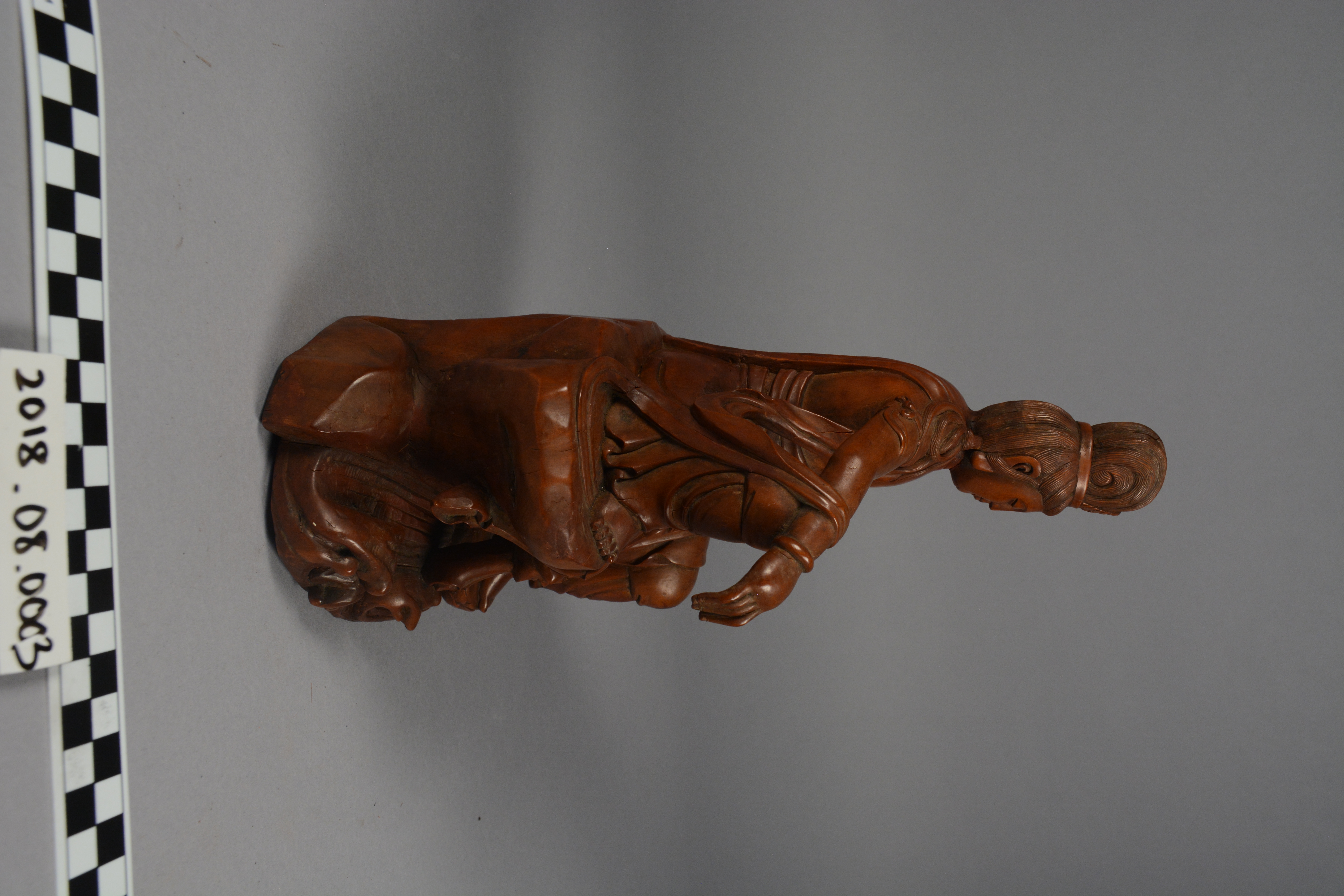 The Spurlock museum holds a variety of Chinese lacquer figures created during the Qing Dynasty (1644-1911), and they serve as representations of regional beliefs and ethics, cultural figureheads, and the human condition. Common muses included famed scholars and poets, arhats (Buddhist holy men), bodhisattvas (Buddhists who have achieved enlightenment but choose to remain in the world to help others end their suffering), deities of East Asian belief structures, and the Chinese zodiac. Animals, plants, and other natural objects were also carved and are typically associated with good fortune and other favorable life conditions.