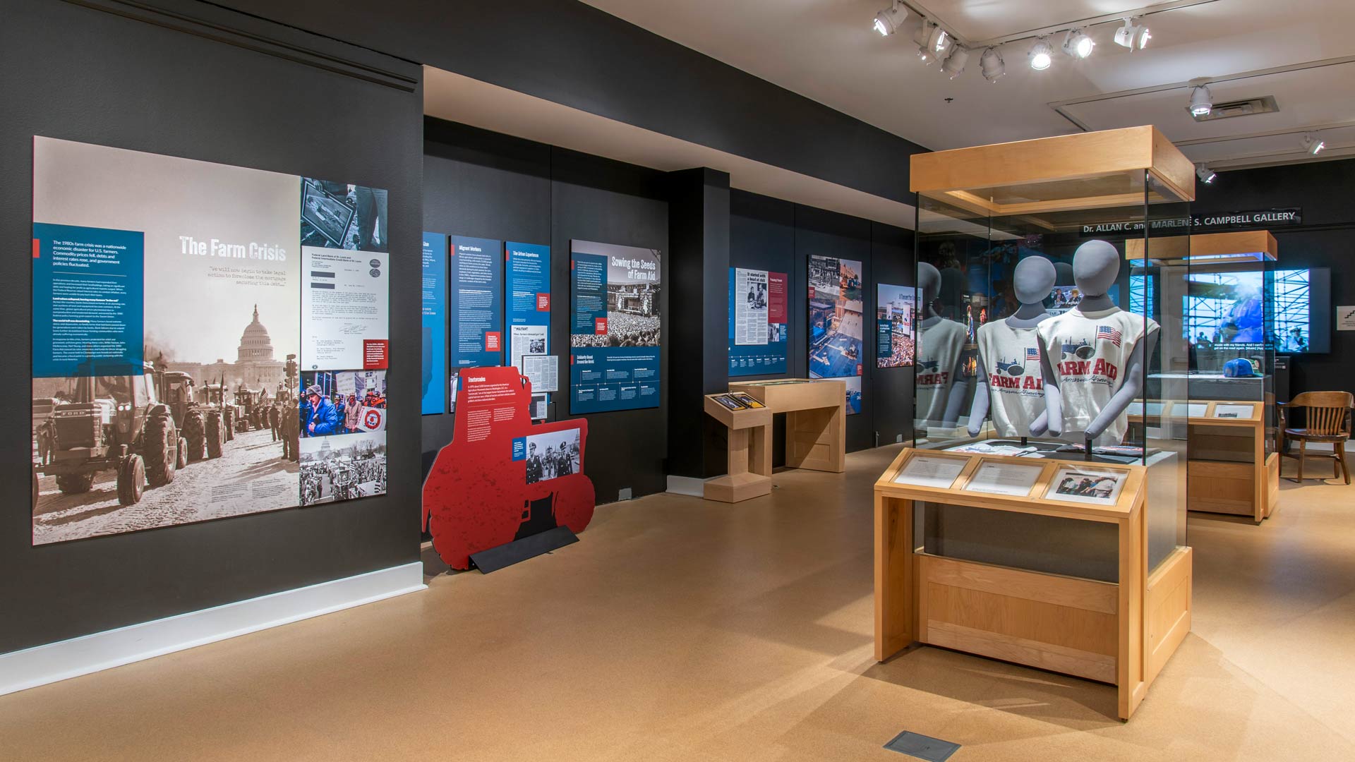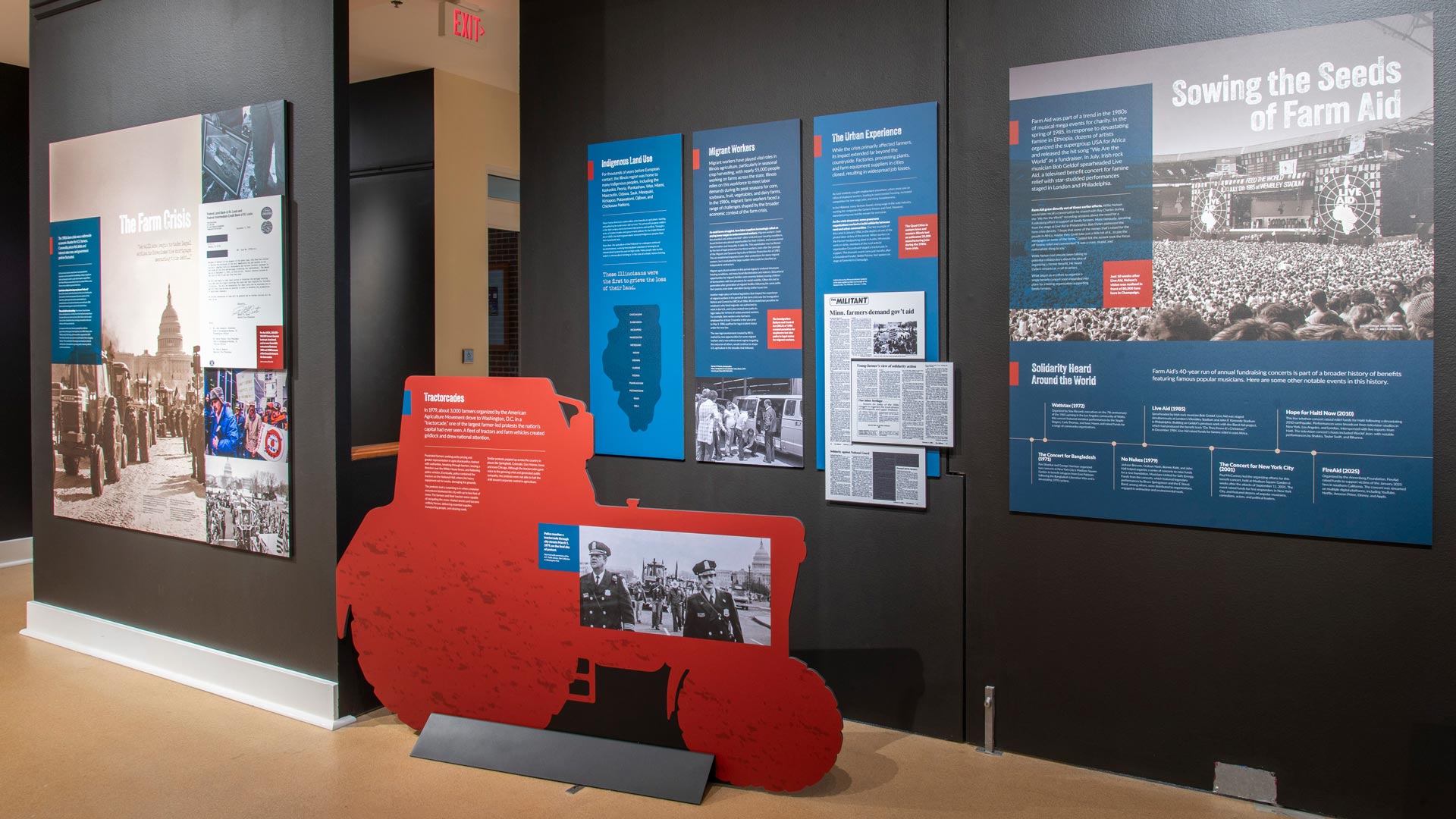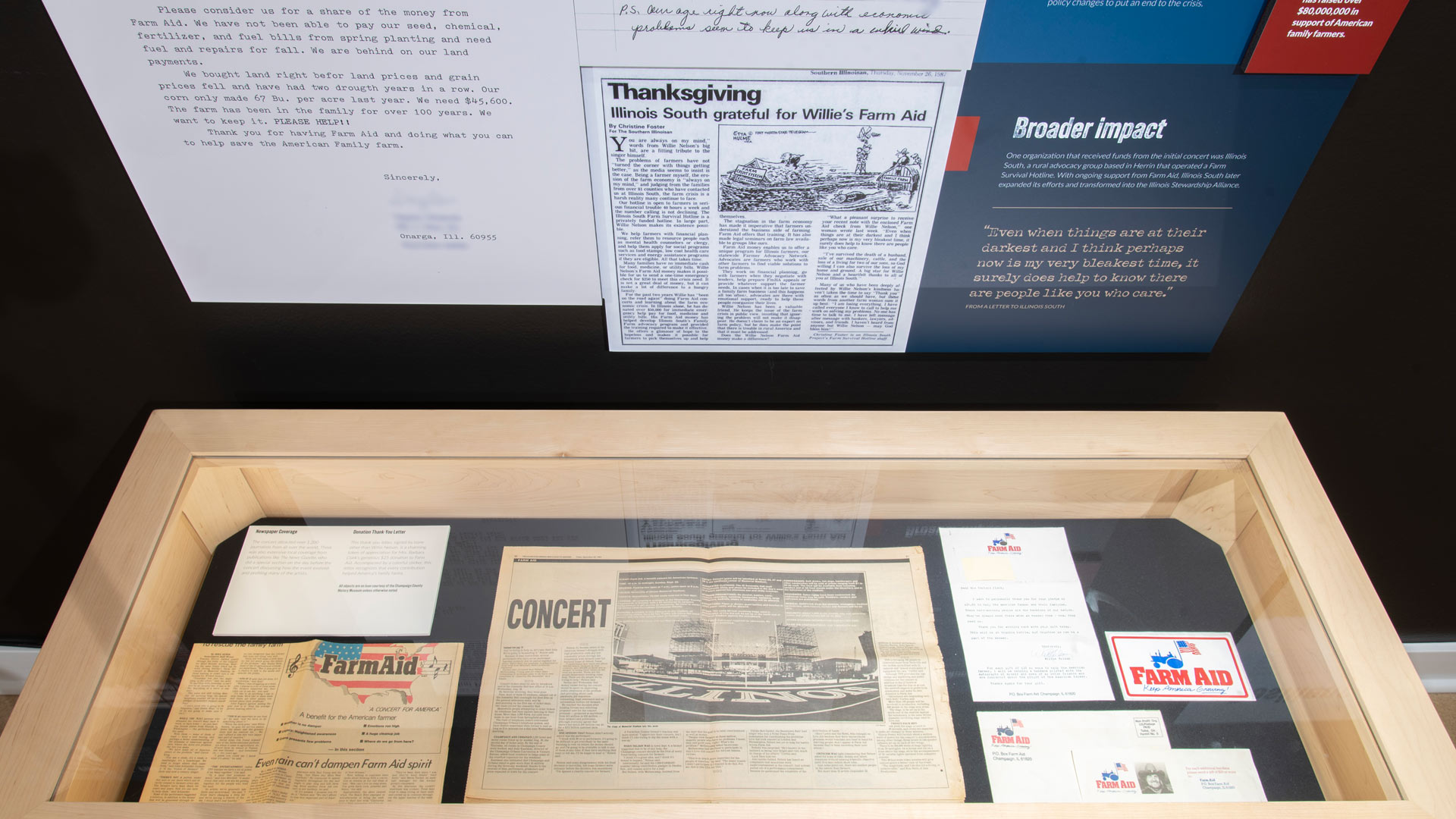 Created in collaboration with the Champaign County History Museum and students from the UIUC History Harvest class, this exhibit features photos, documents, and objects from the first Farm Aid concert, stories from the farm crisis, and hope for the future of American farming.