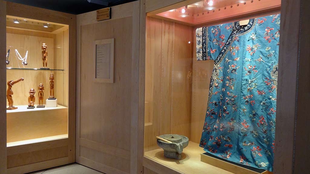 Also on display are some recent donations of Chinese artifacts: an embroidered silk robe donated by Frances Smith and a soy and rice mill, used and donated by Futing Tim Liao, Professor of Sociology and Statistics.